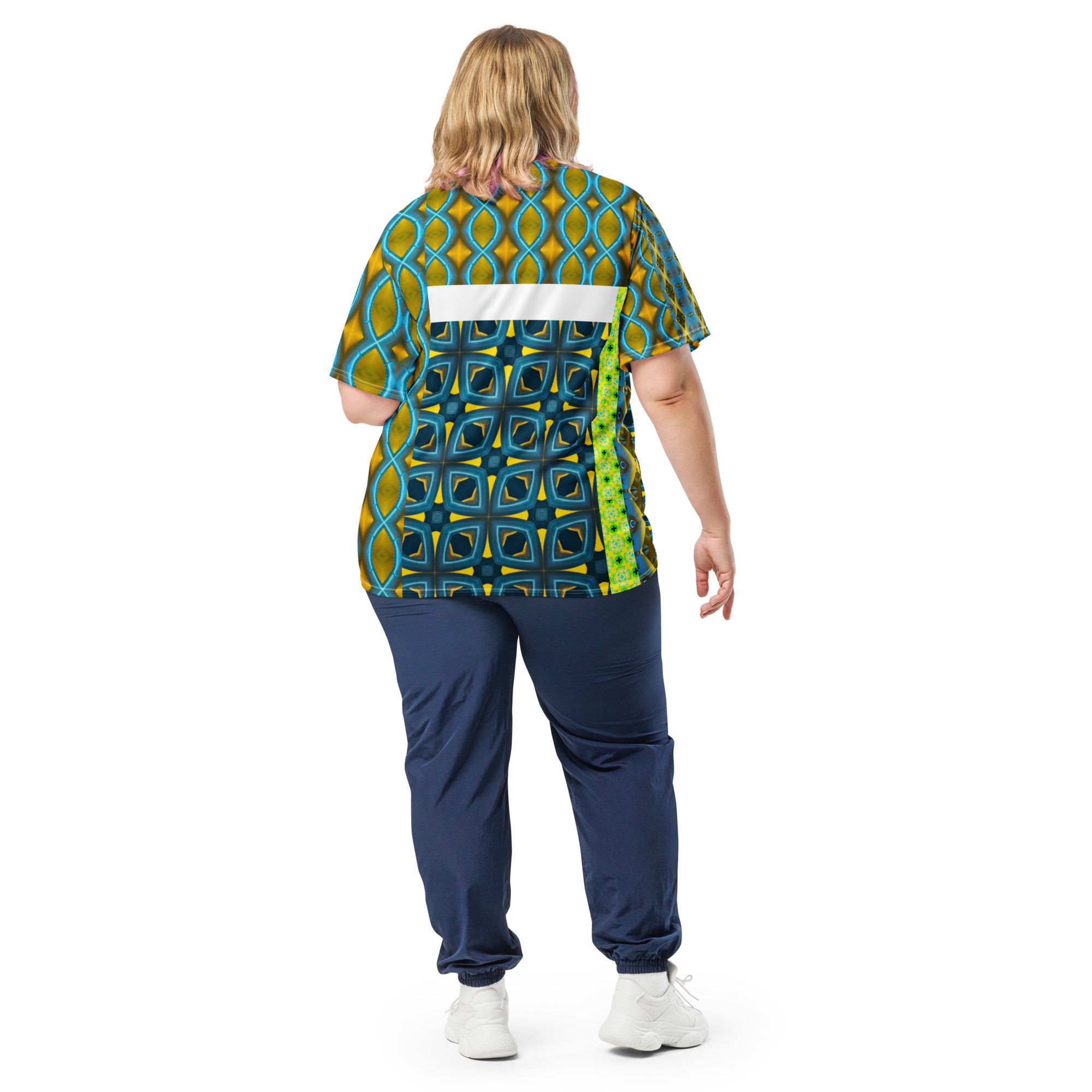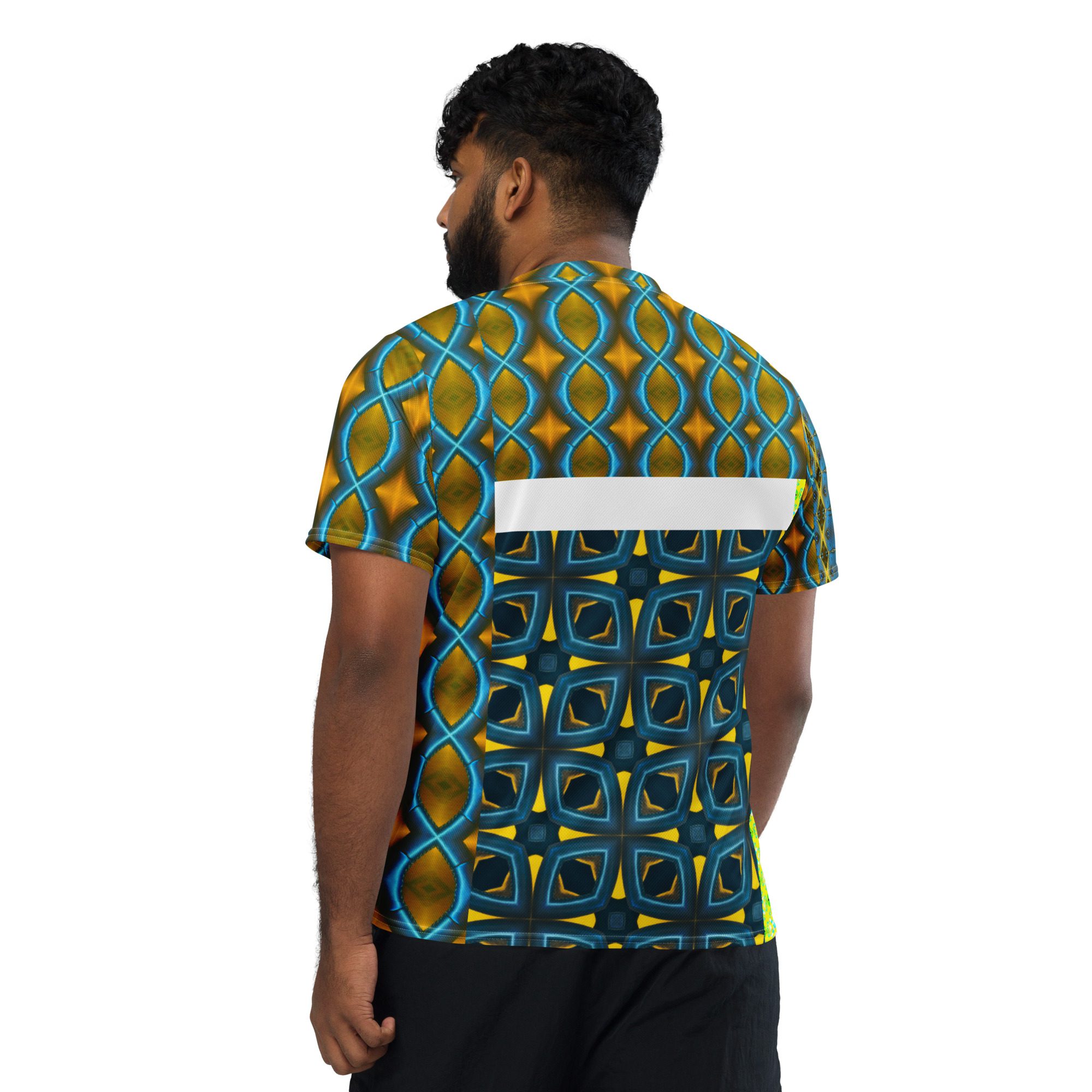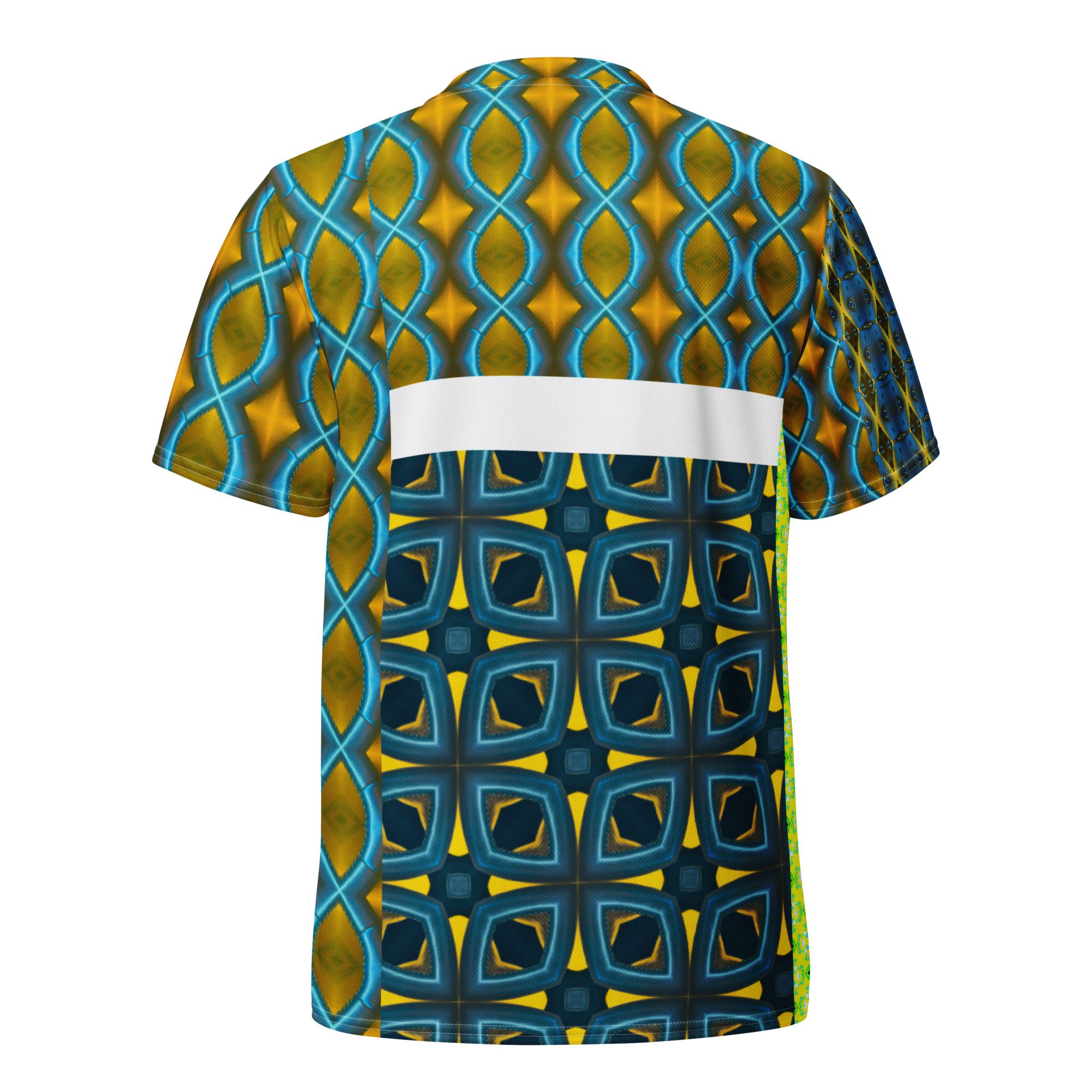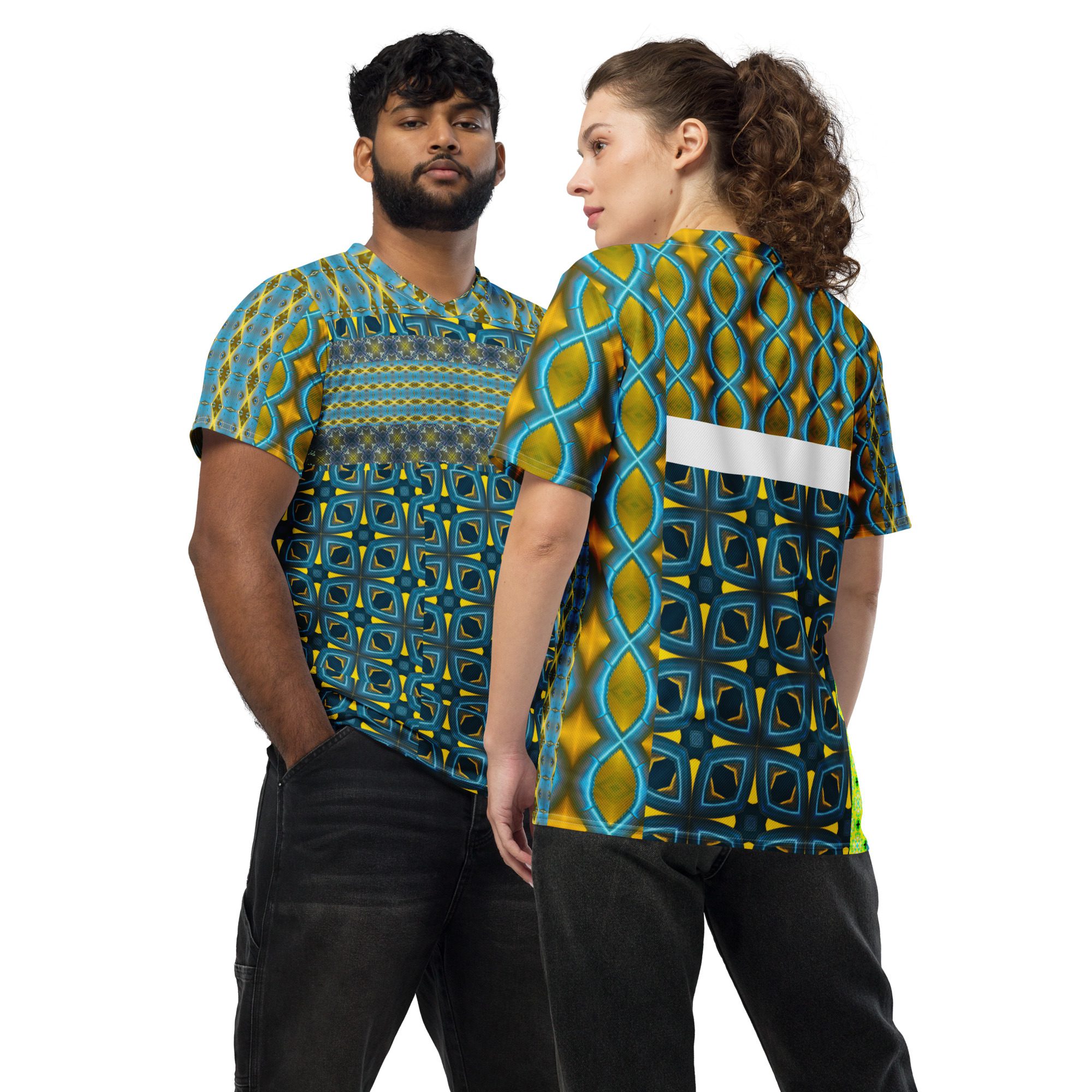 Perfect for fans of abstract art apparel, geometric patterns, vivid sportswear, festival fashion, streetwear style, activewear tops, unisex athletic outfits, recycled clothing, eco-friendly fashion, bold graphic jerseys, and statement performance pieces.