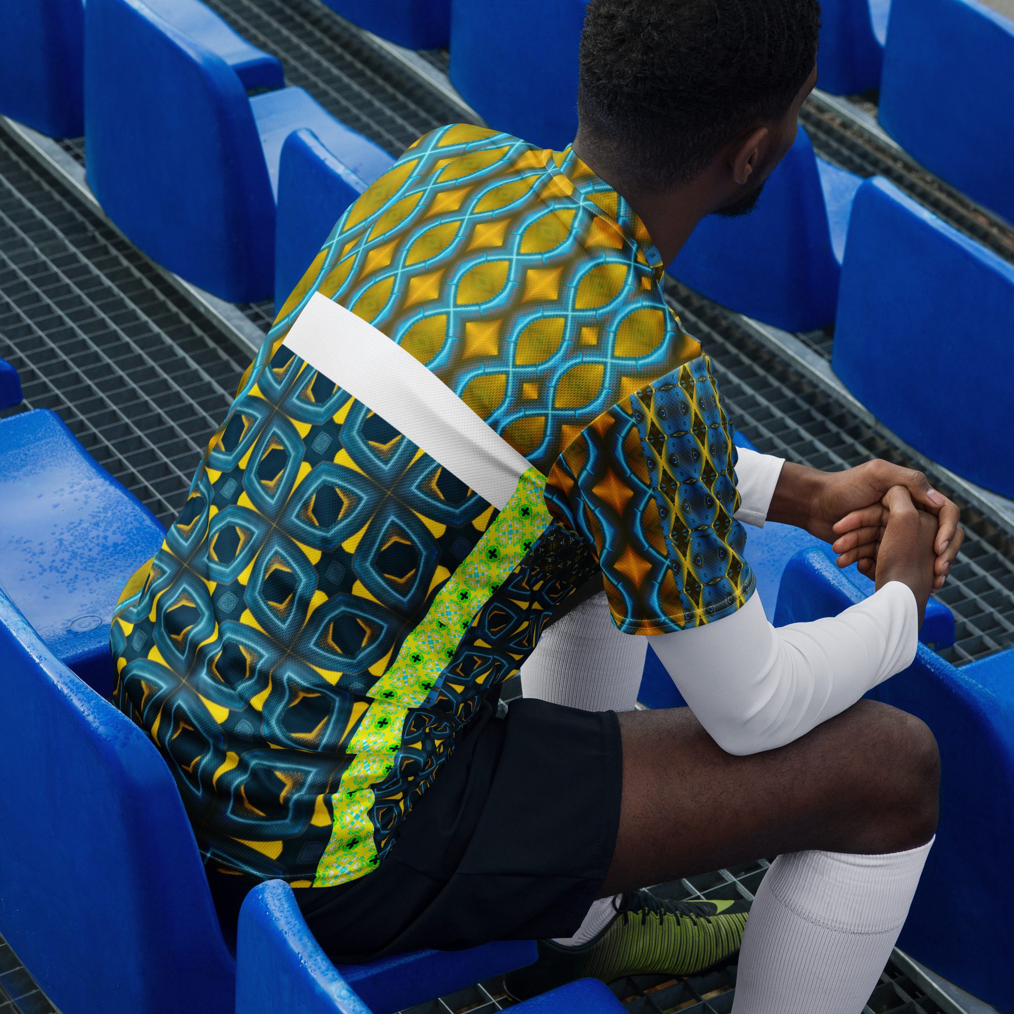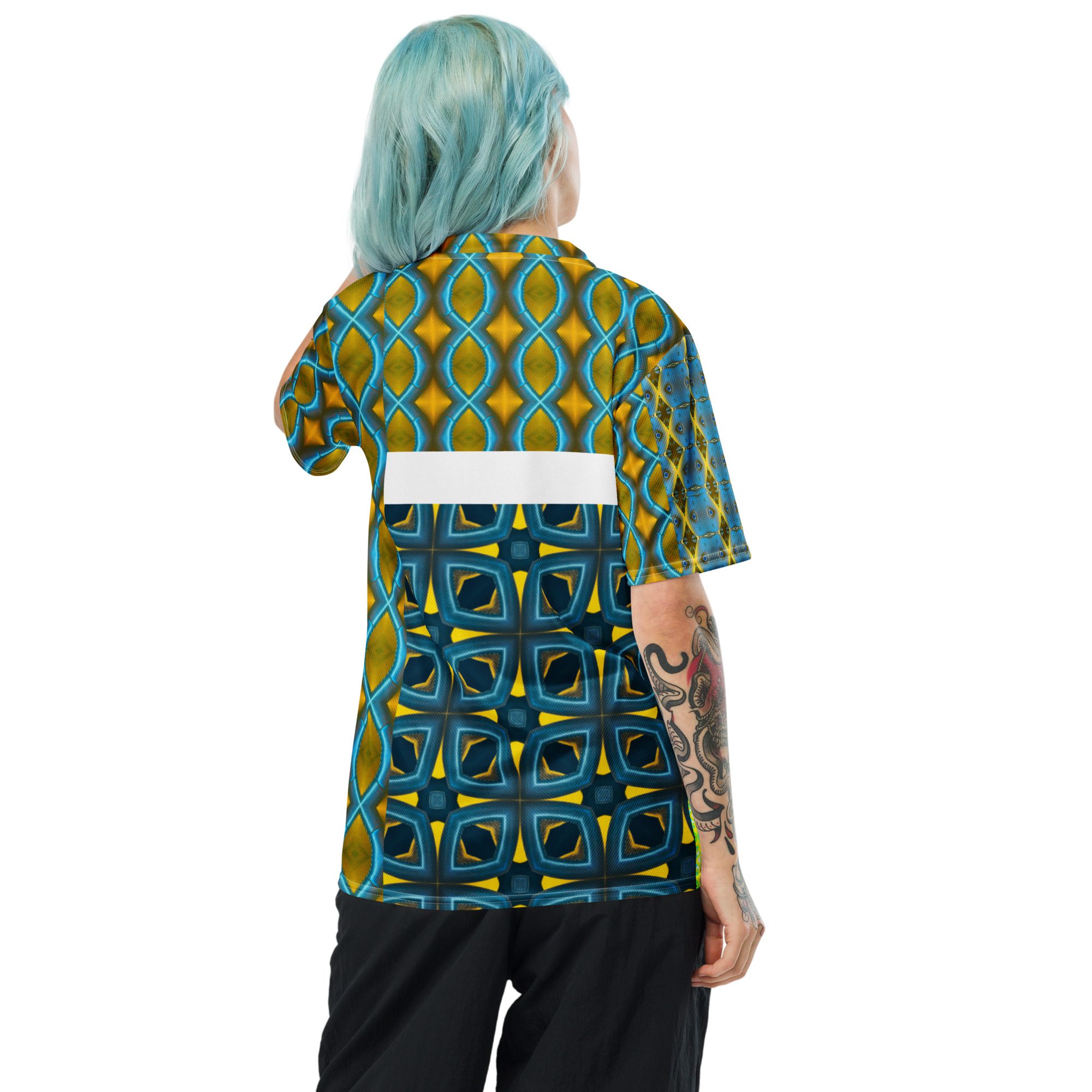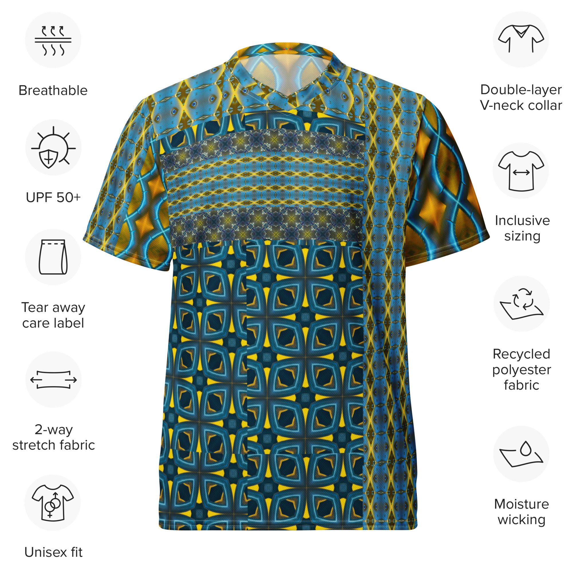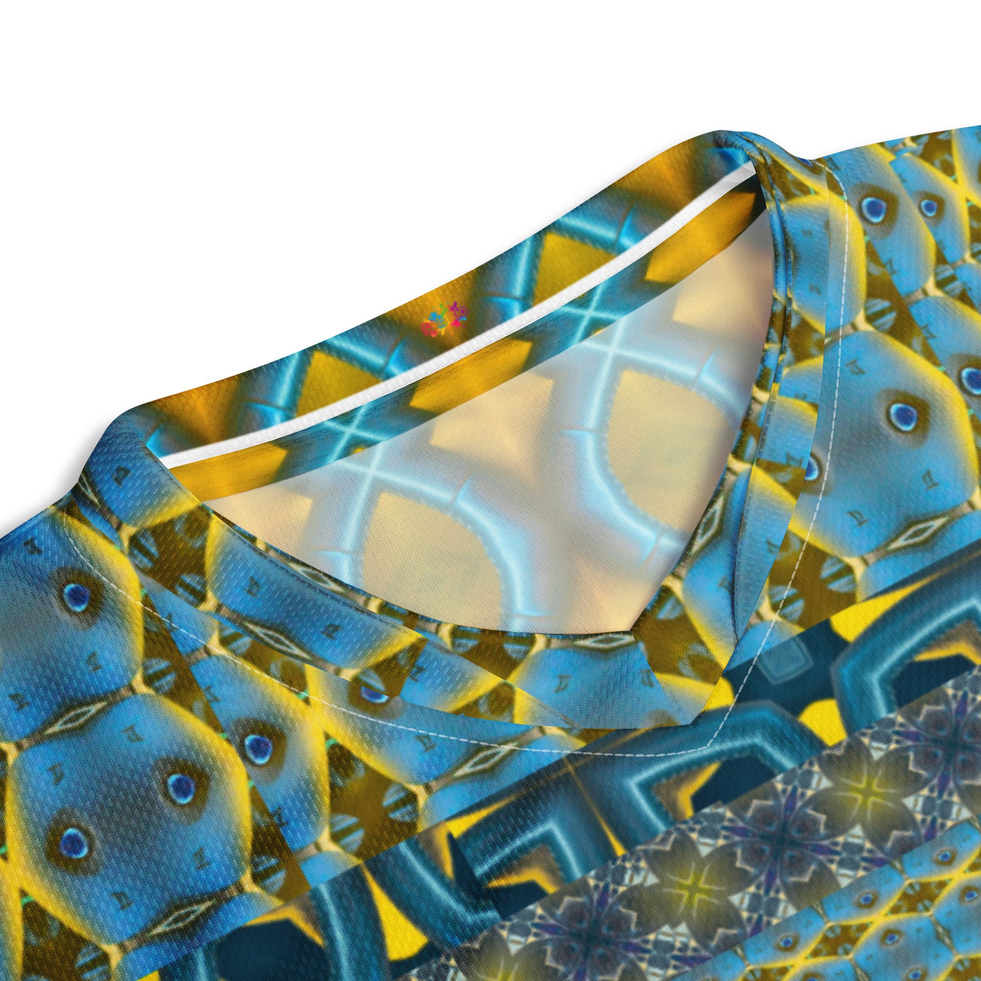 Perfect for fans of abstract art apparel, geometric patterns, vivid sportswear, festival fashion, streetwear style, activewear tops, unisex athletic outfits, recycled clothing, eco-friendly fashion, bold graphic jerseys, and statement performance pieces.