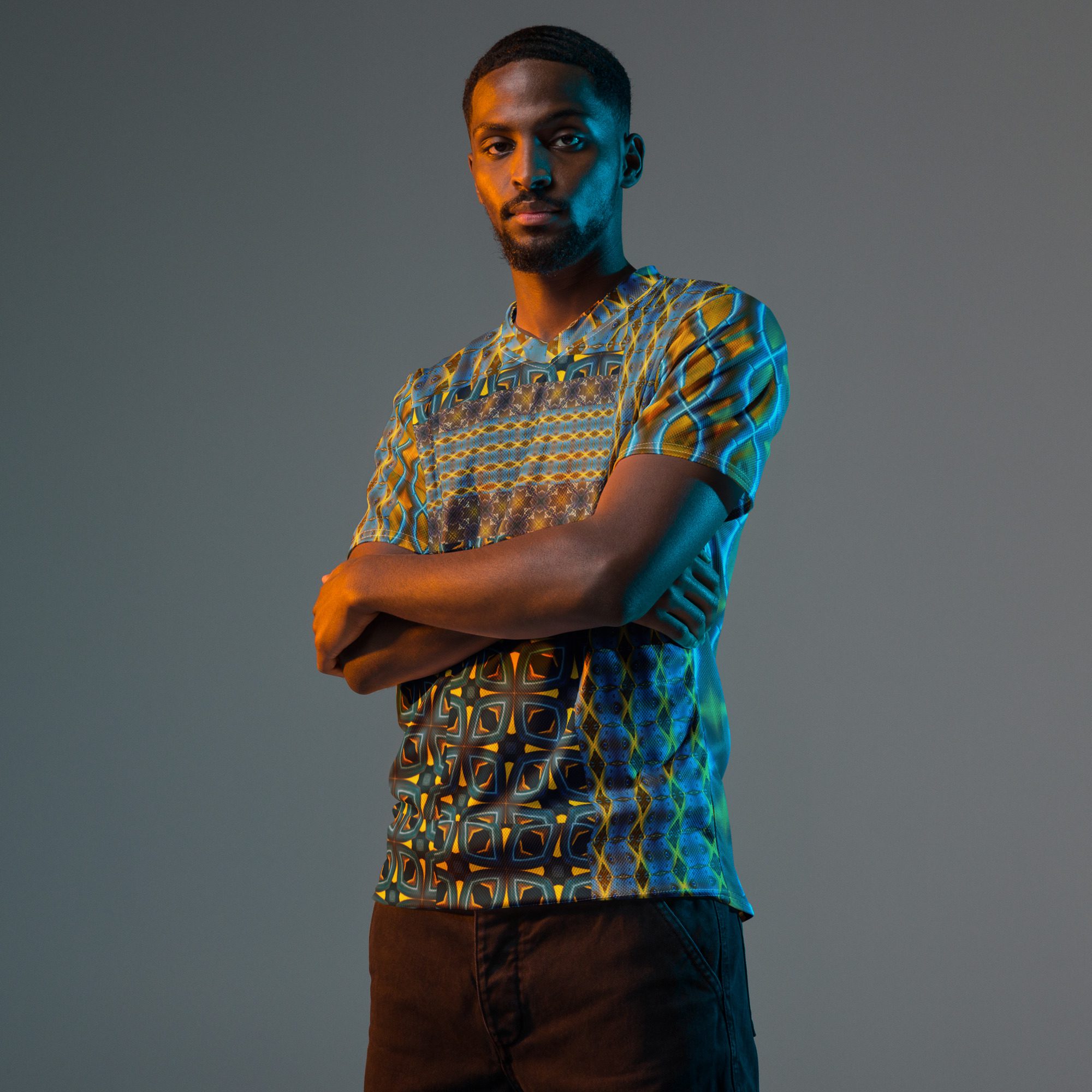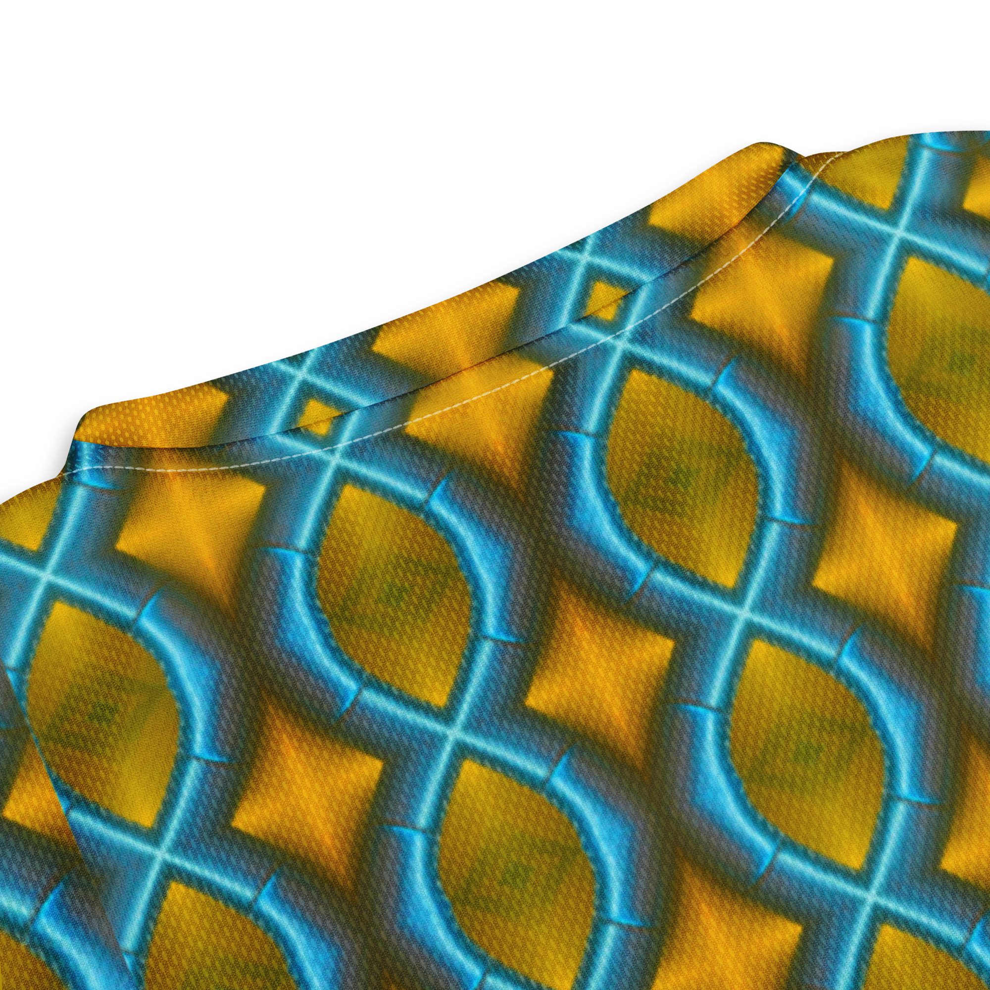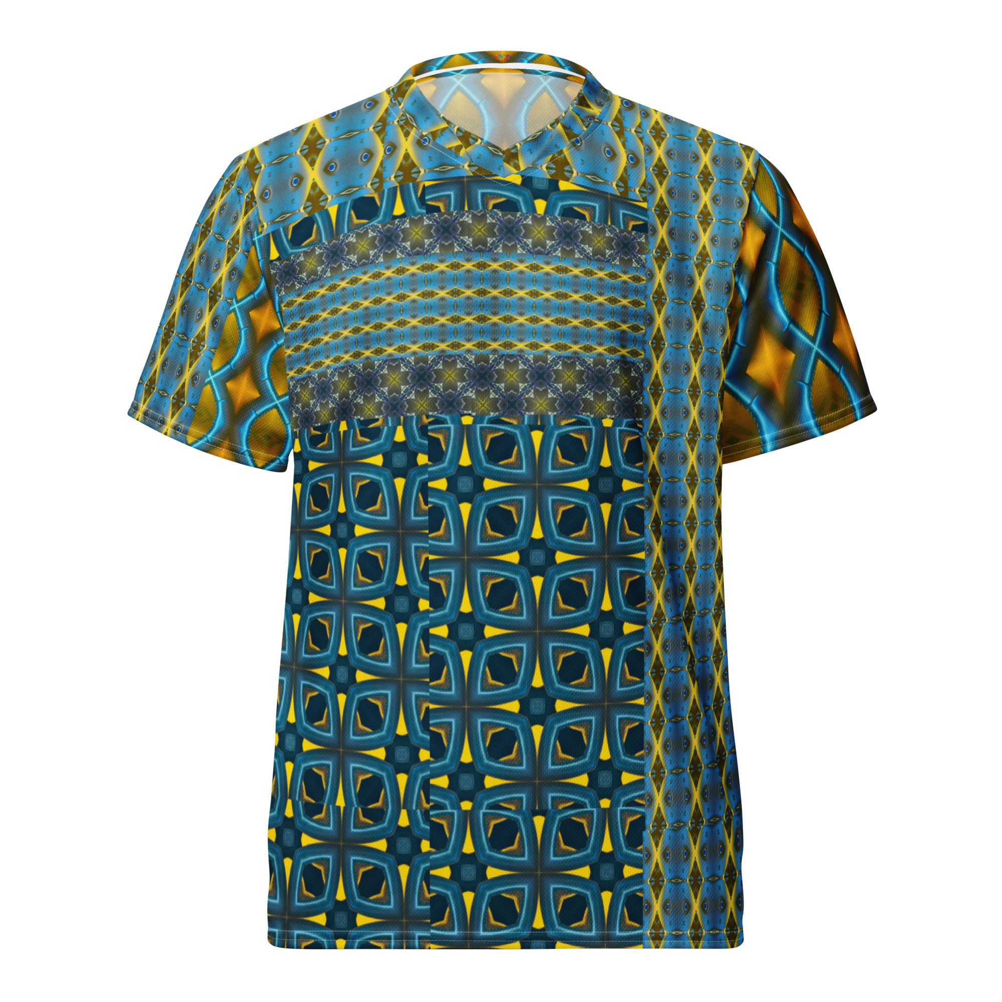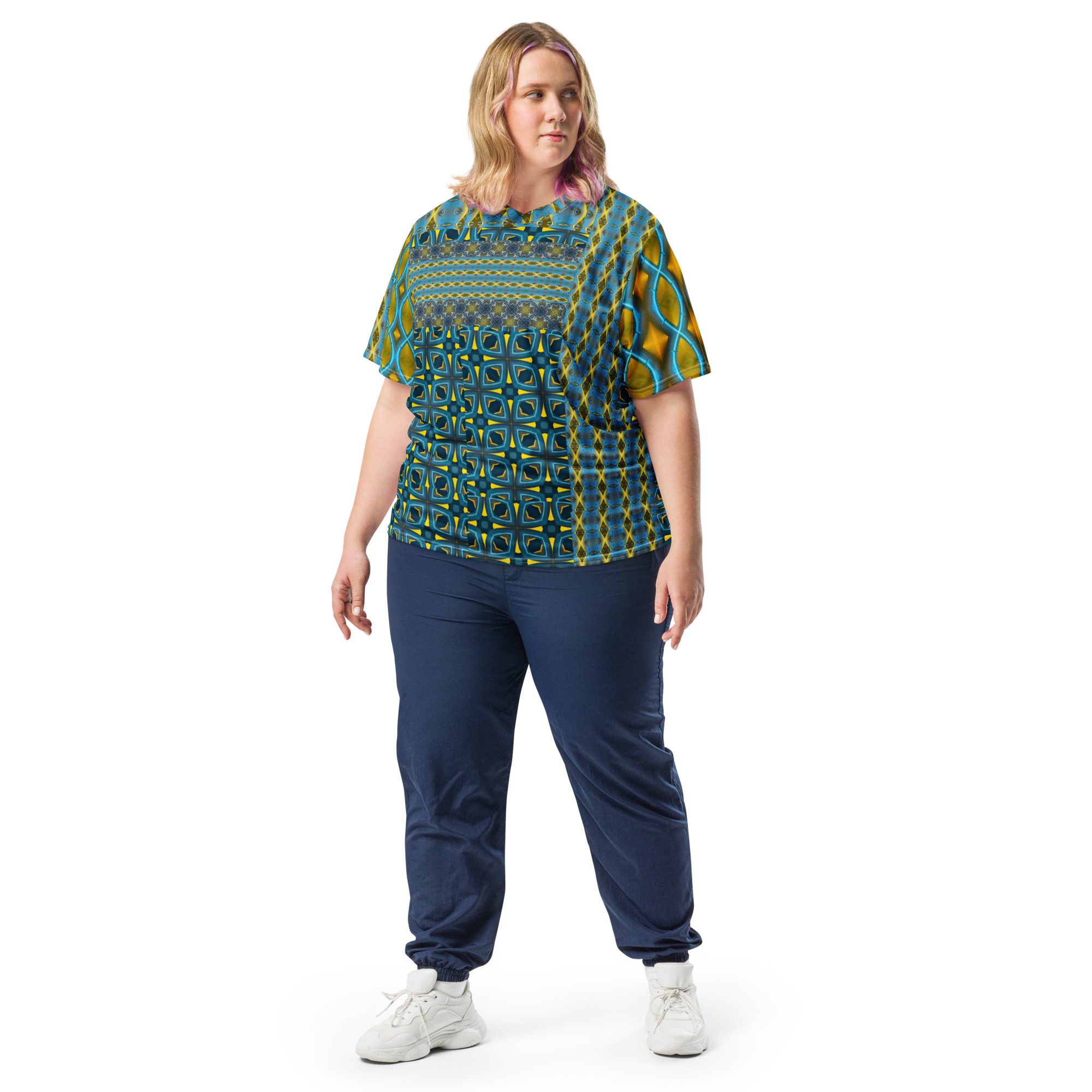 Perfect for fans of abstract art apparel, geometric patterns, vivid sportswear, festival fashion, streetwear style, activewear tops, unisex athletic outfits, recycled clothing, eco-friendly fashion, bold graphic jerseys, and statement performance pieces.