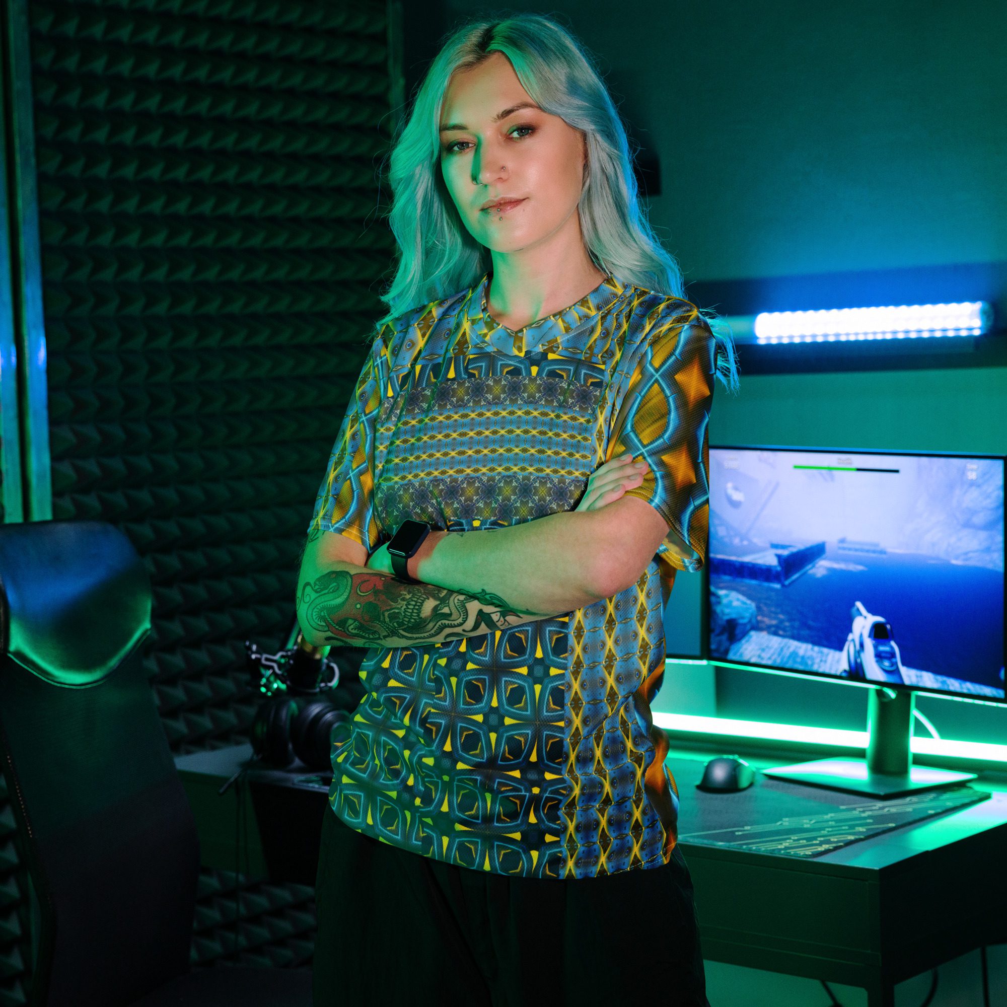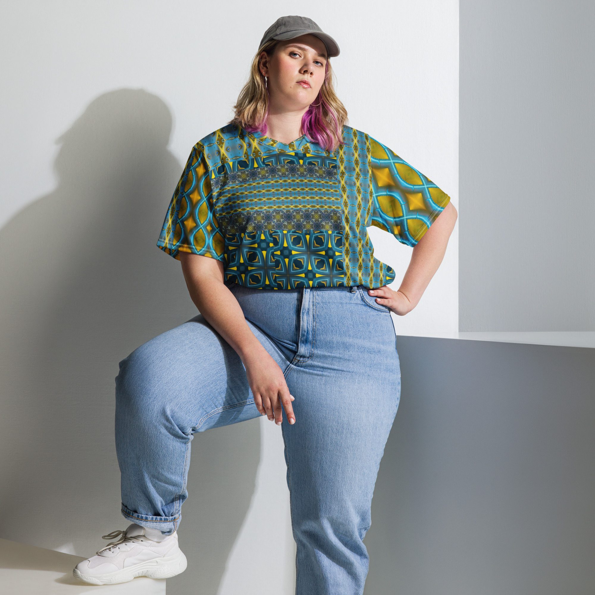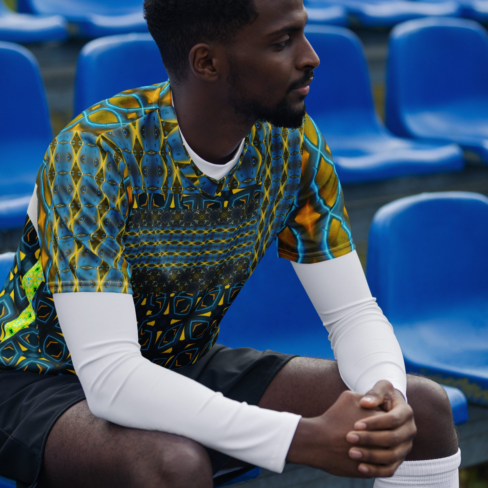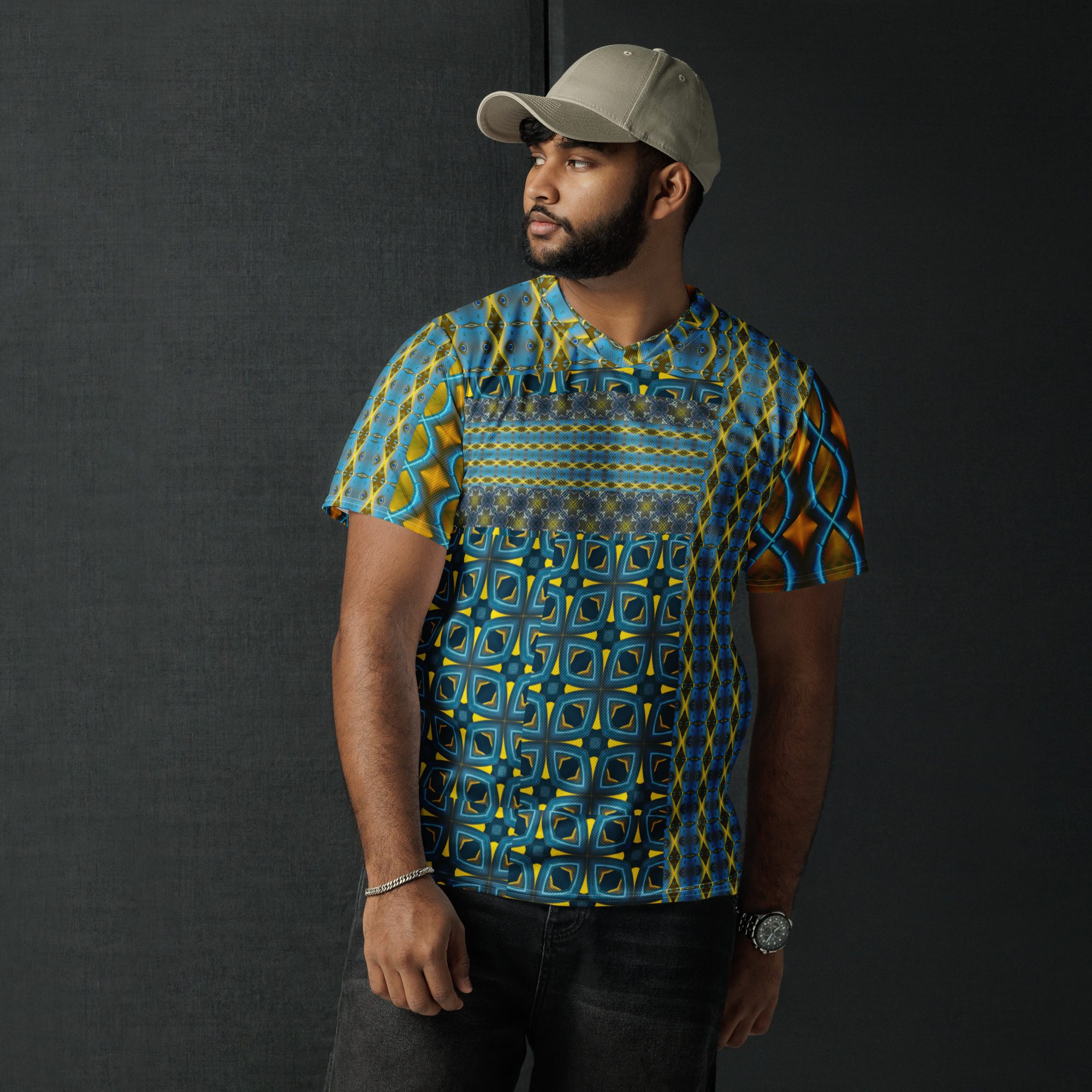 Perfect for fans of abstract art apparel, geometric patterns, vivid sportswear, festival fashion, streetwear style, activewear tops, unisex athletic outfits, recycled clothing, eco-friendly fashion, bold graphic jerseys, and statement performance pieces.