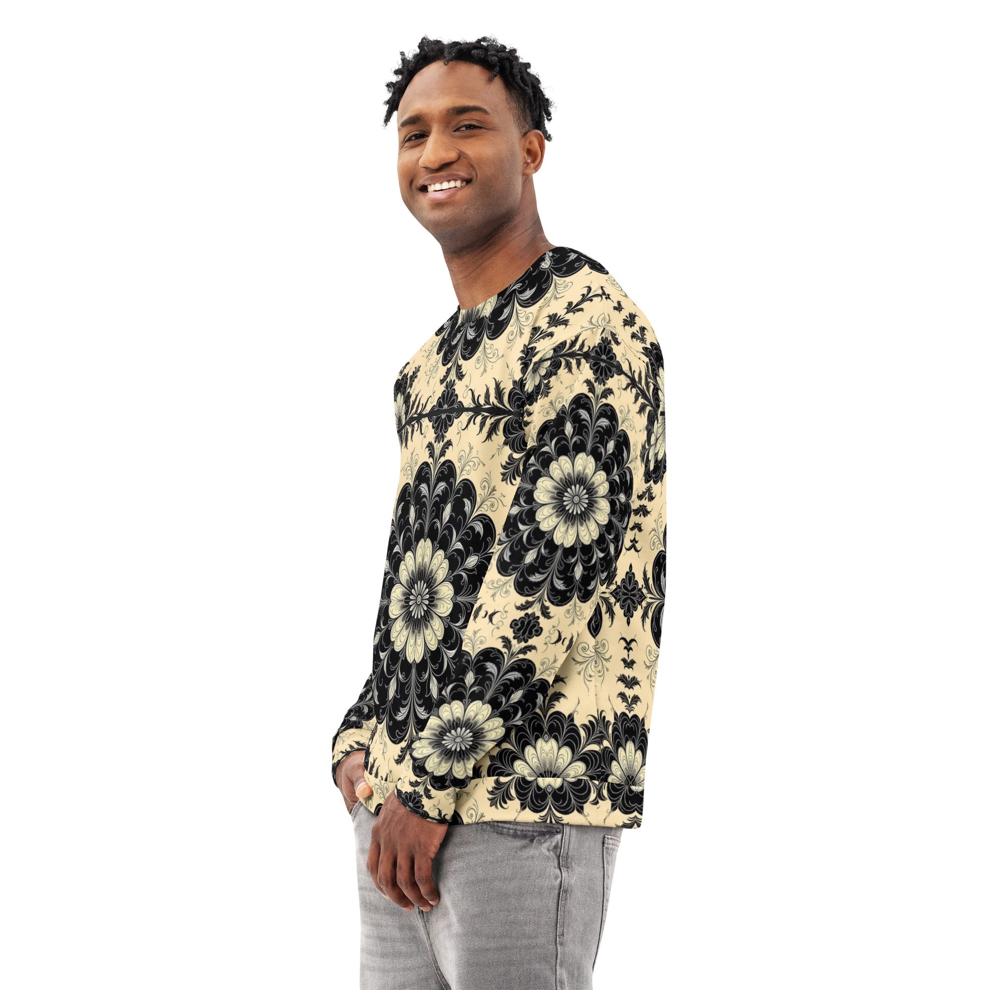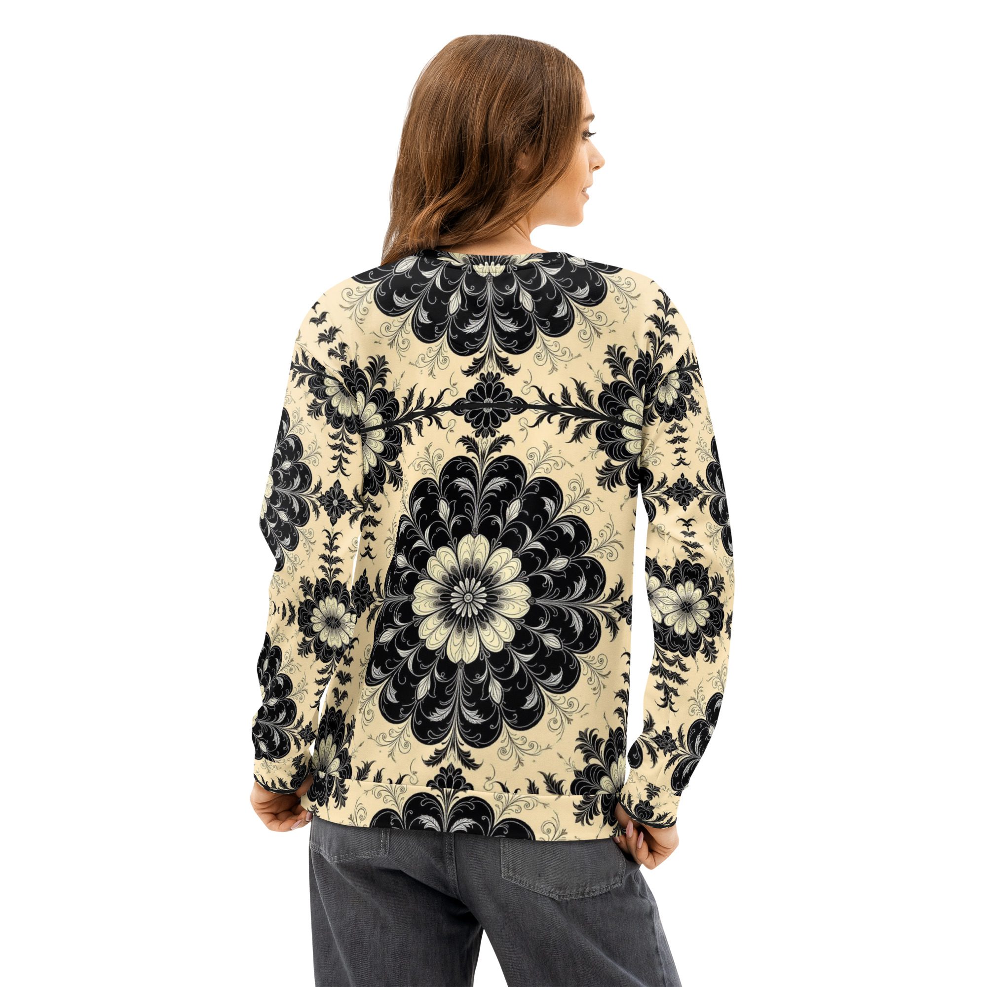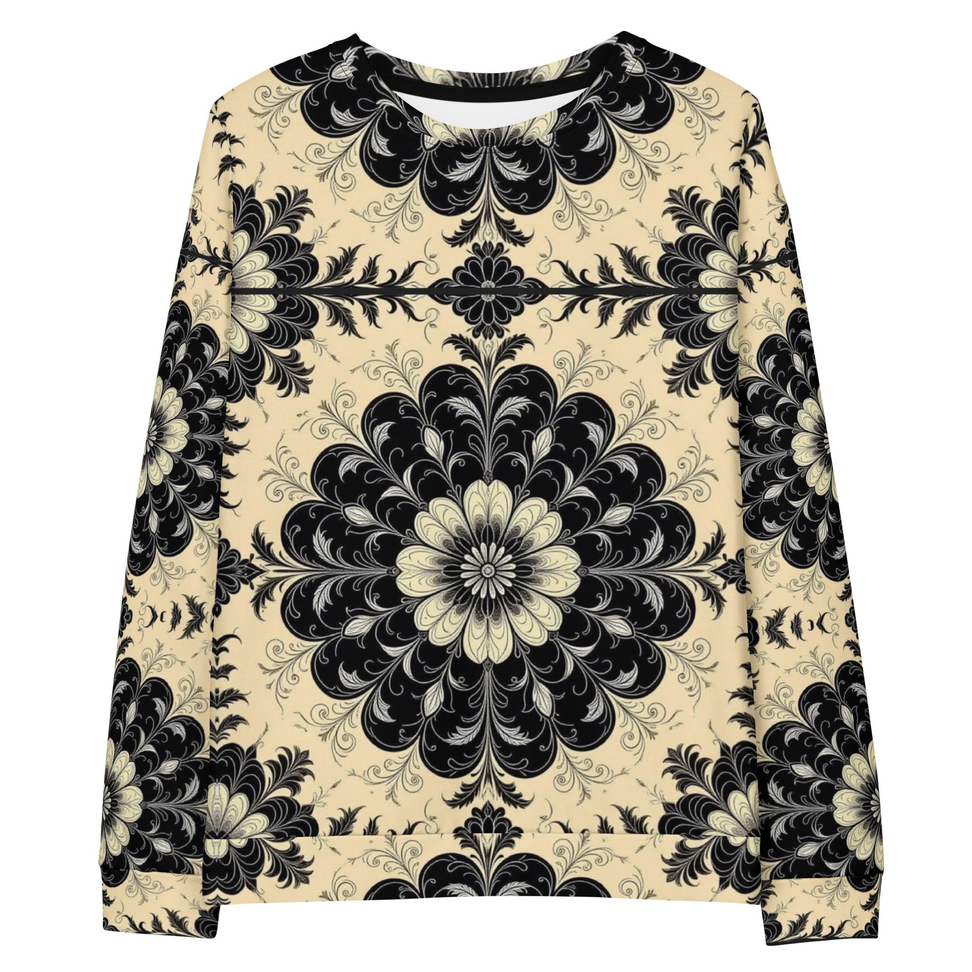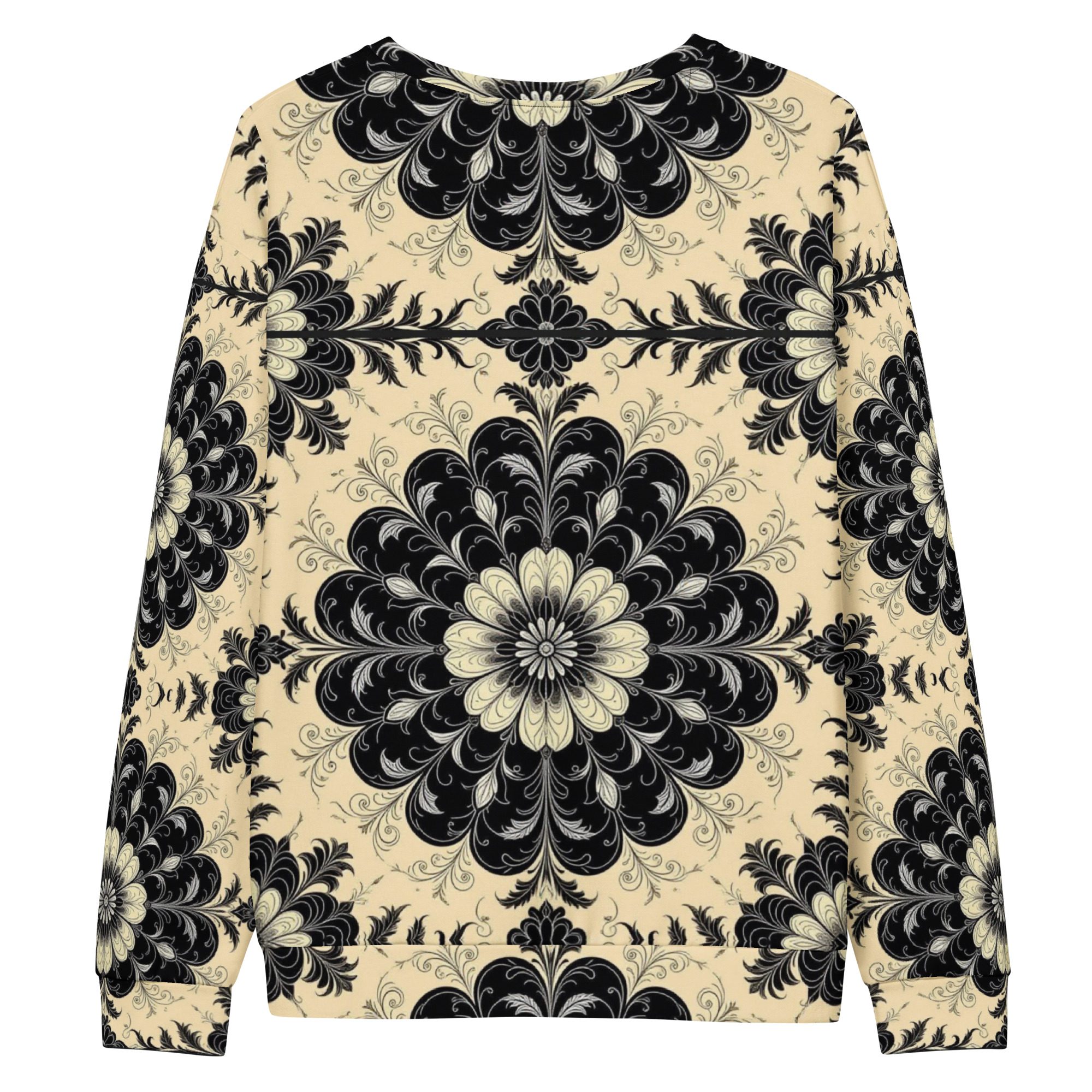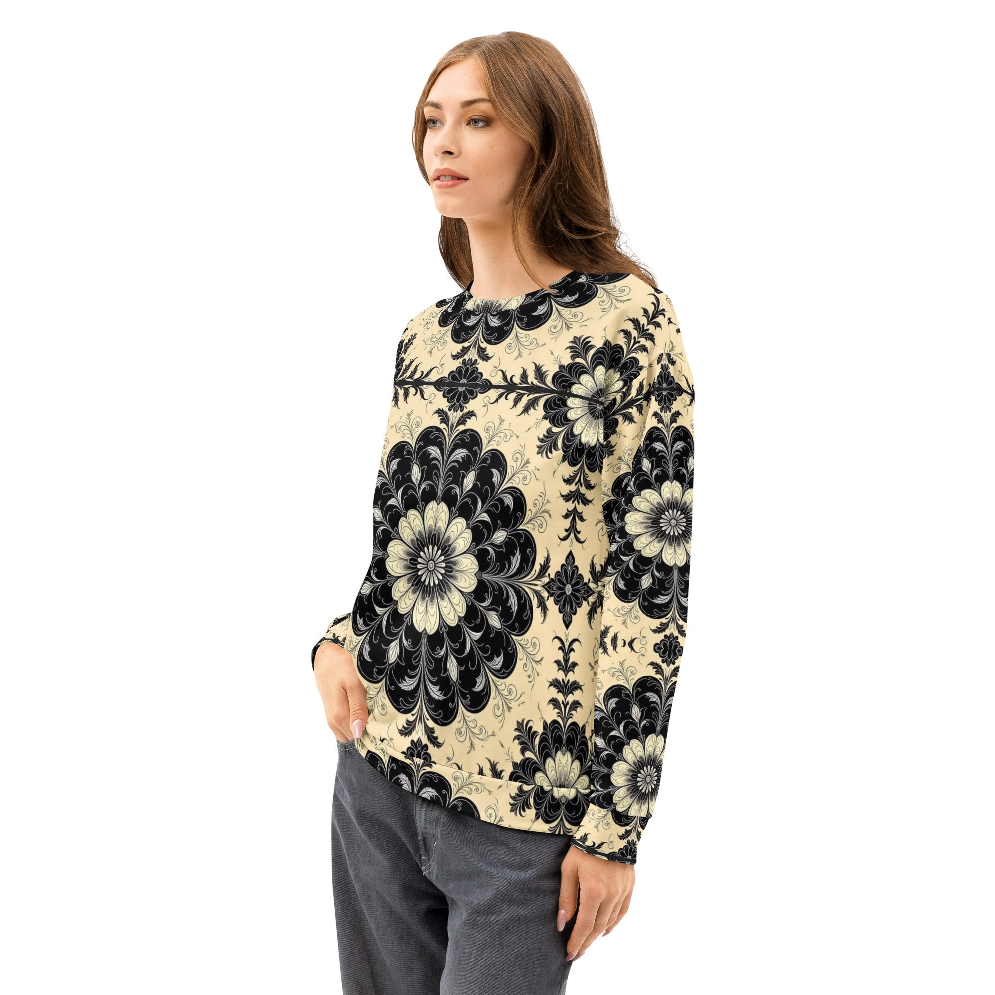 This sweatshirt feels like a recovered artifact from a forgotten scholarly age—where gothic florals, ritual symmetry, and dark academia aesthetics were etched into manuscripts, cathedral margins, and the quiet corners of old-world libraries. The Black Floral Codex of the Old World carries the weight of that history in visual form, translating archival beauty into wearable art.