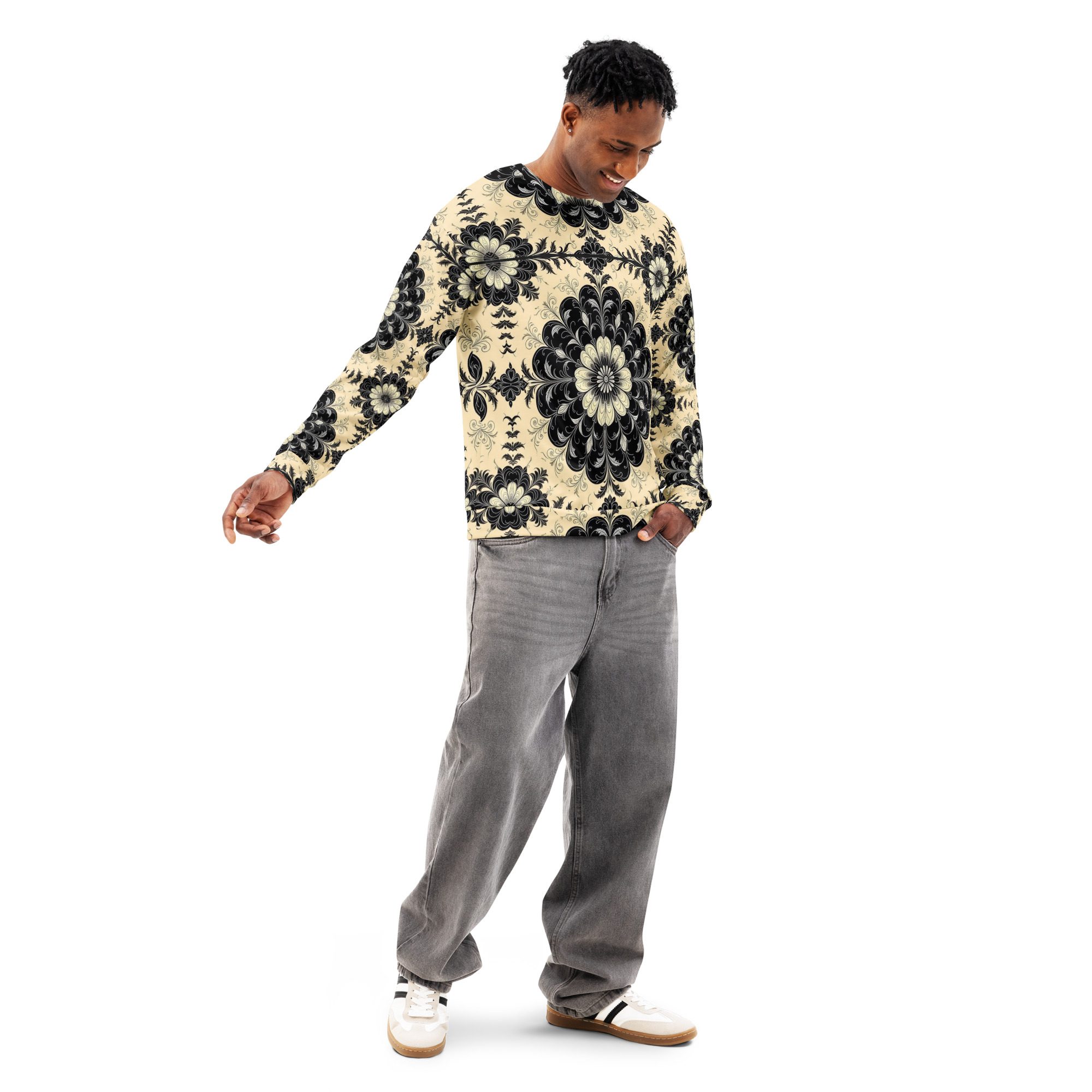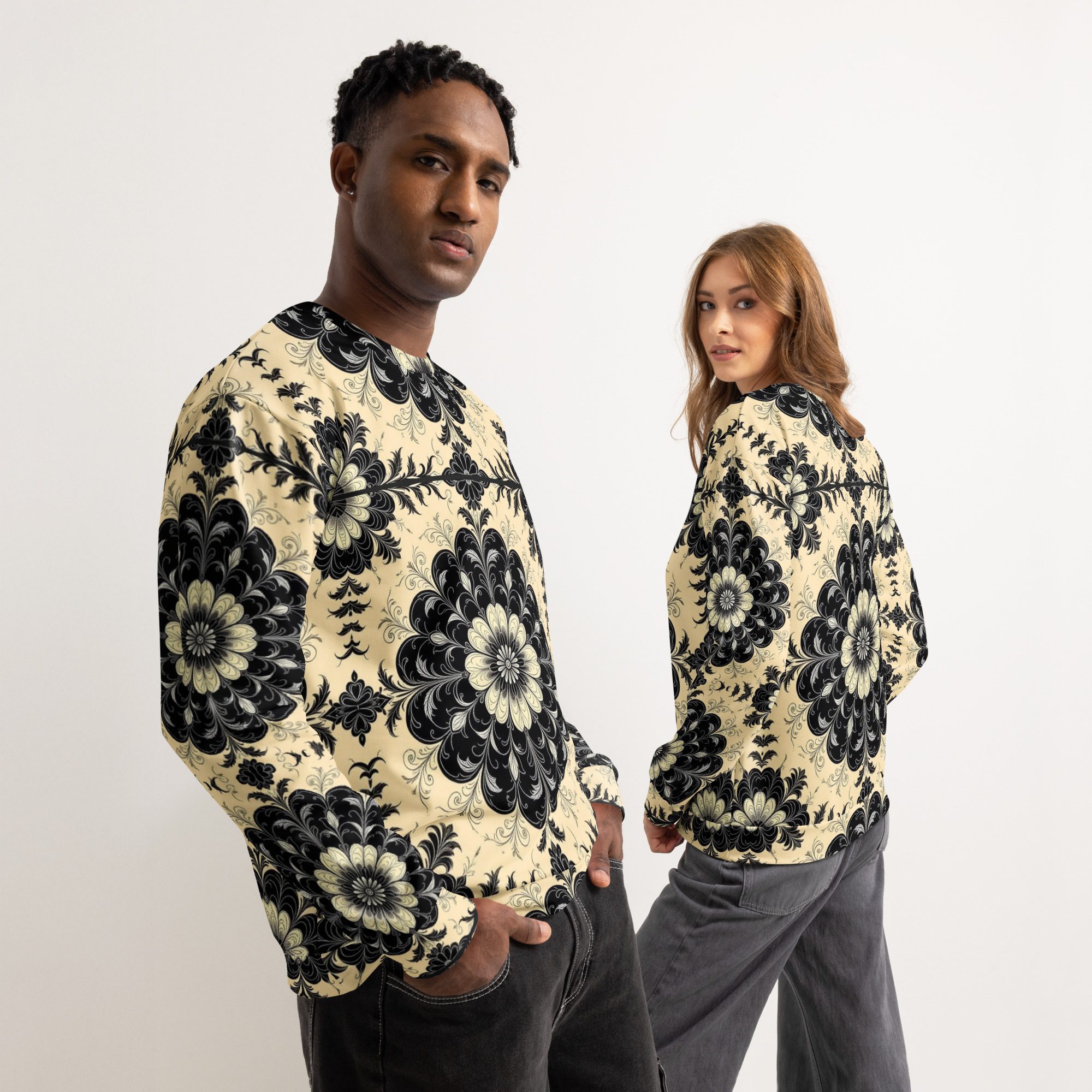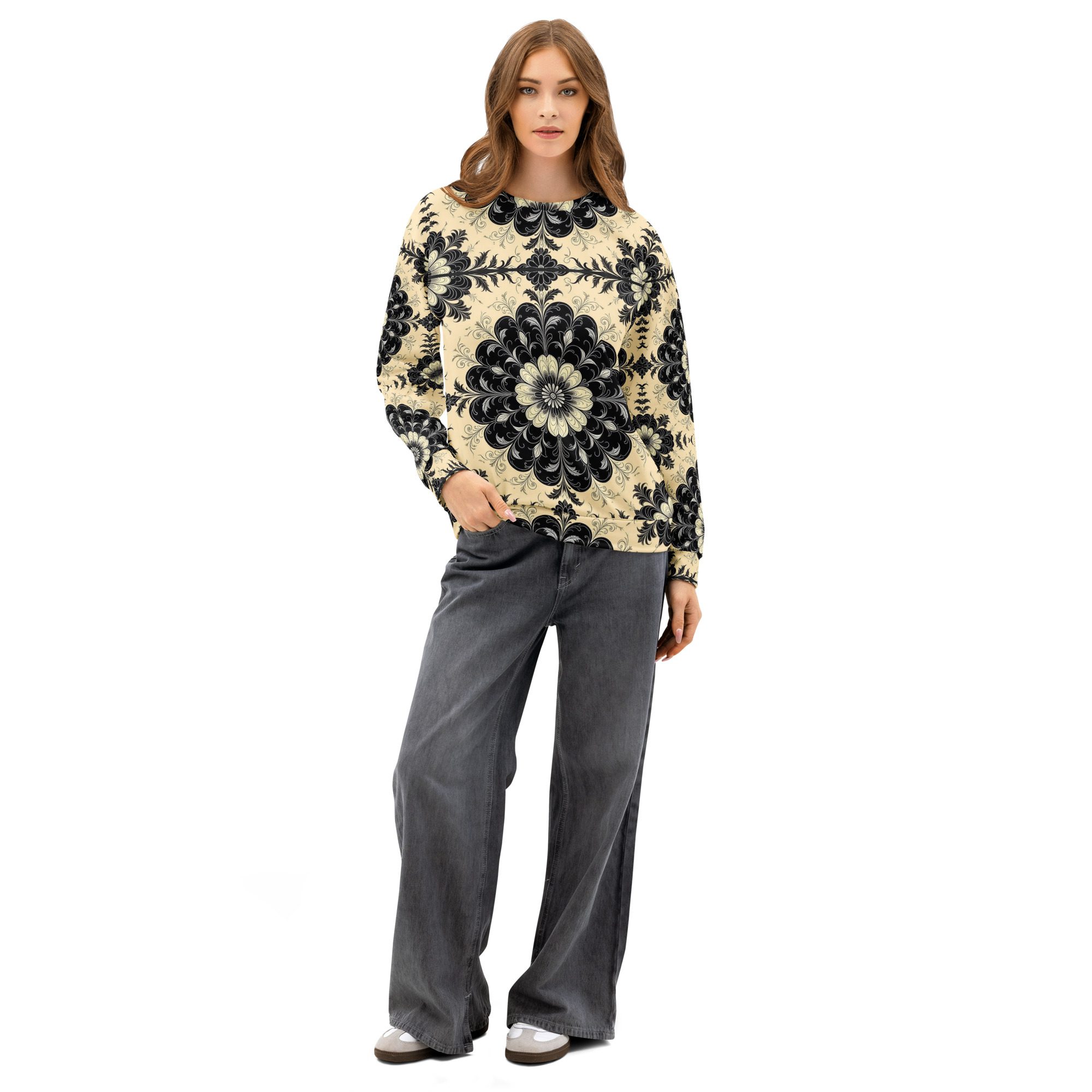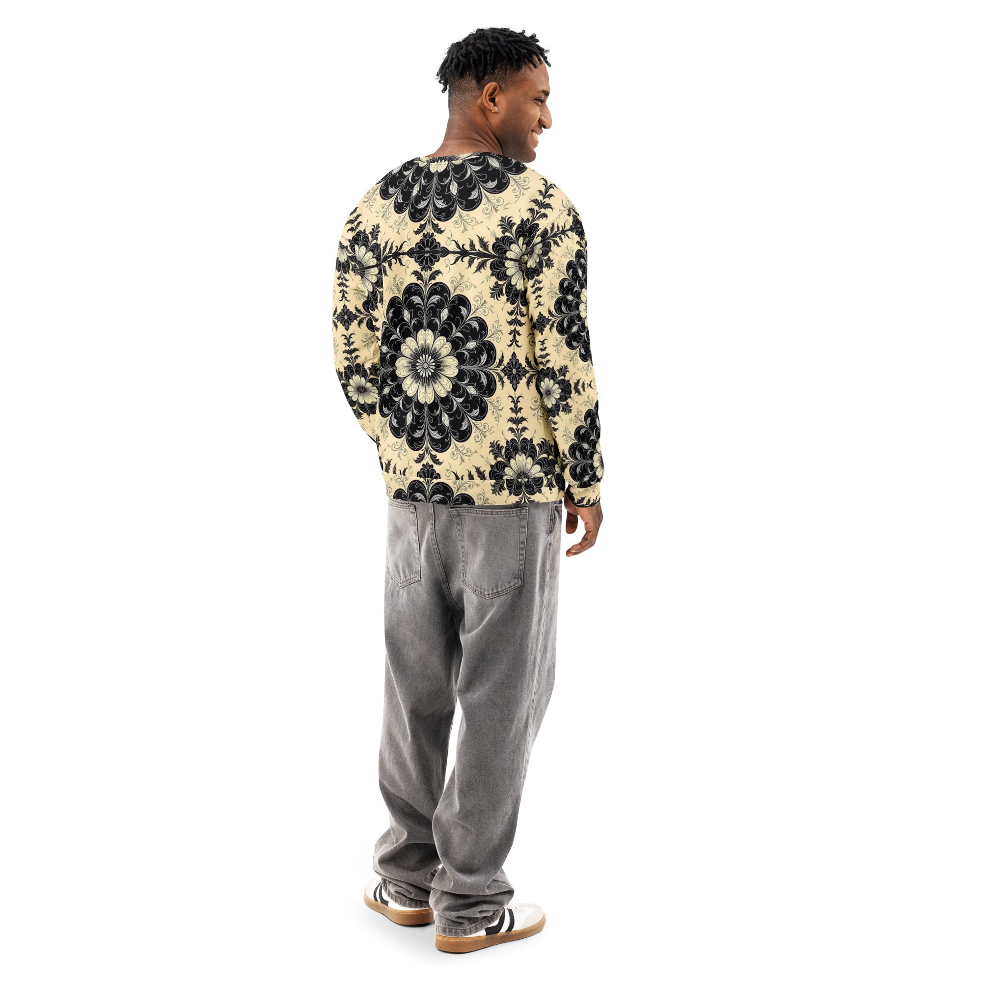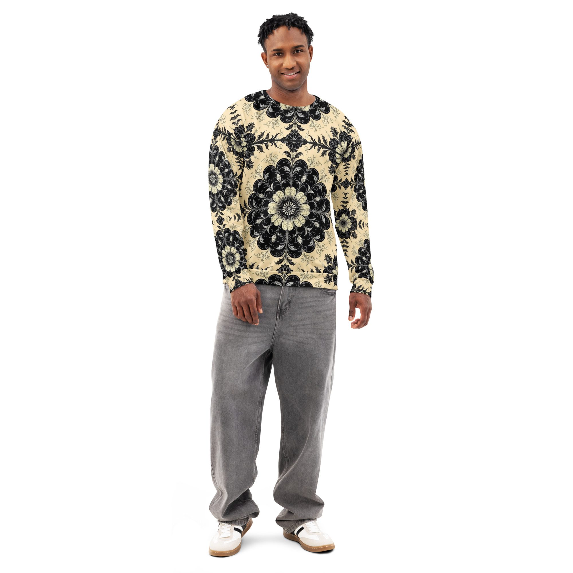 This sweatshirt feels like a recovered artifact from a forgotten scholarly age—where gothic florals, ritual symmetry, and dark academia aesthetics were etched into manuscripts, cathedral margins, and the quiet corners of old-world libraries. The Black Floral Codex of the Old World carries the weight of that history in visual form, translating archival beauty into wearable art.