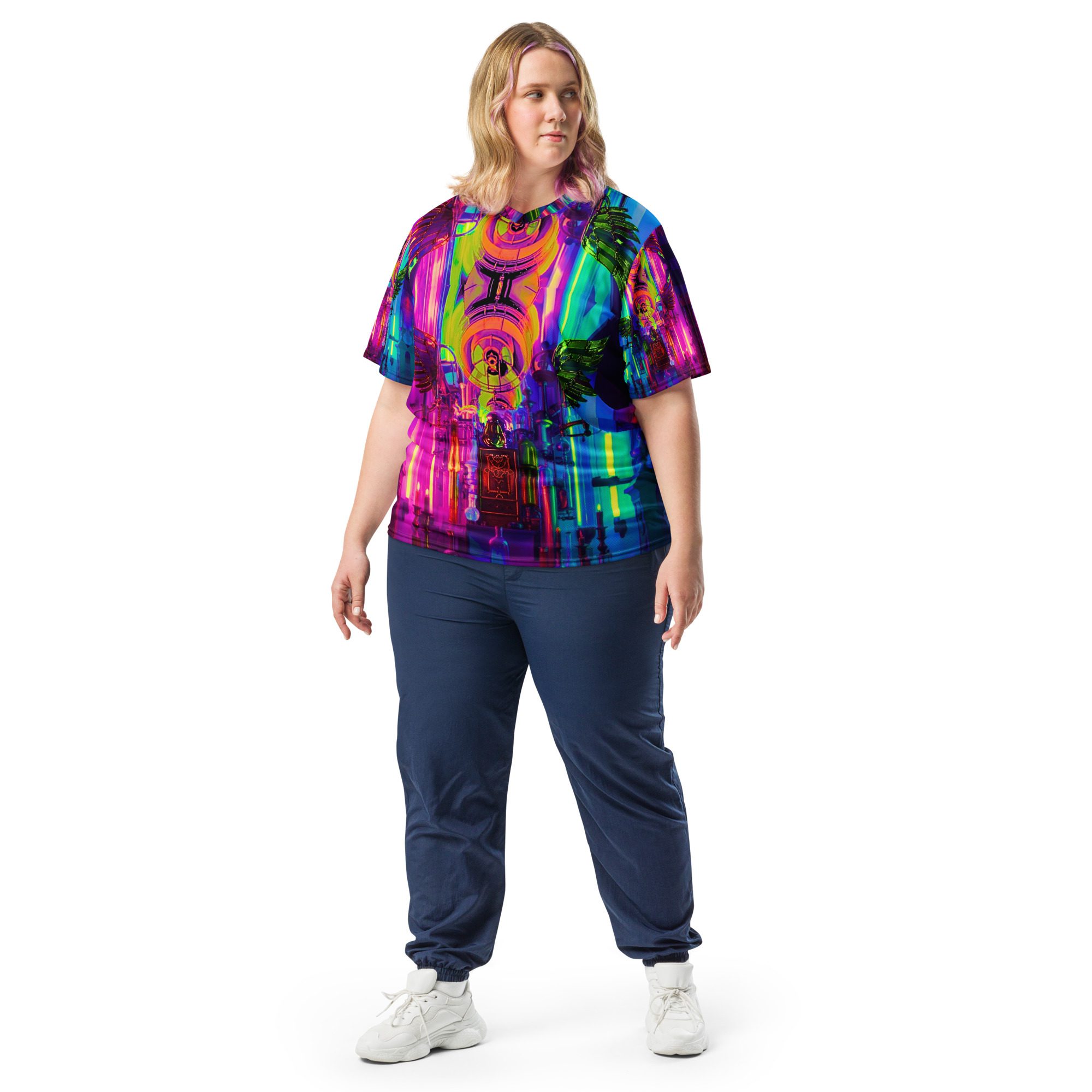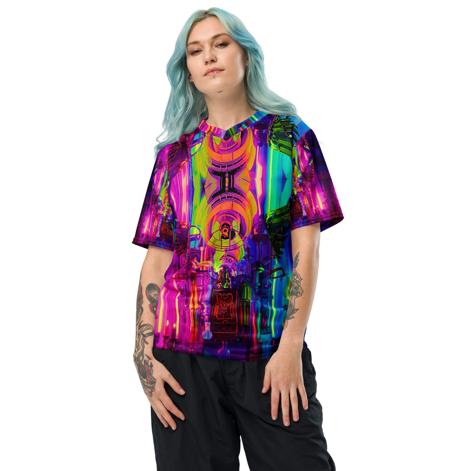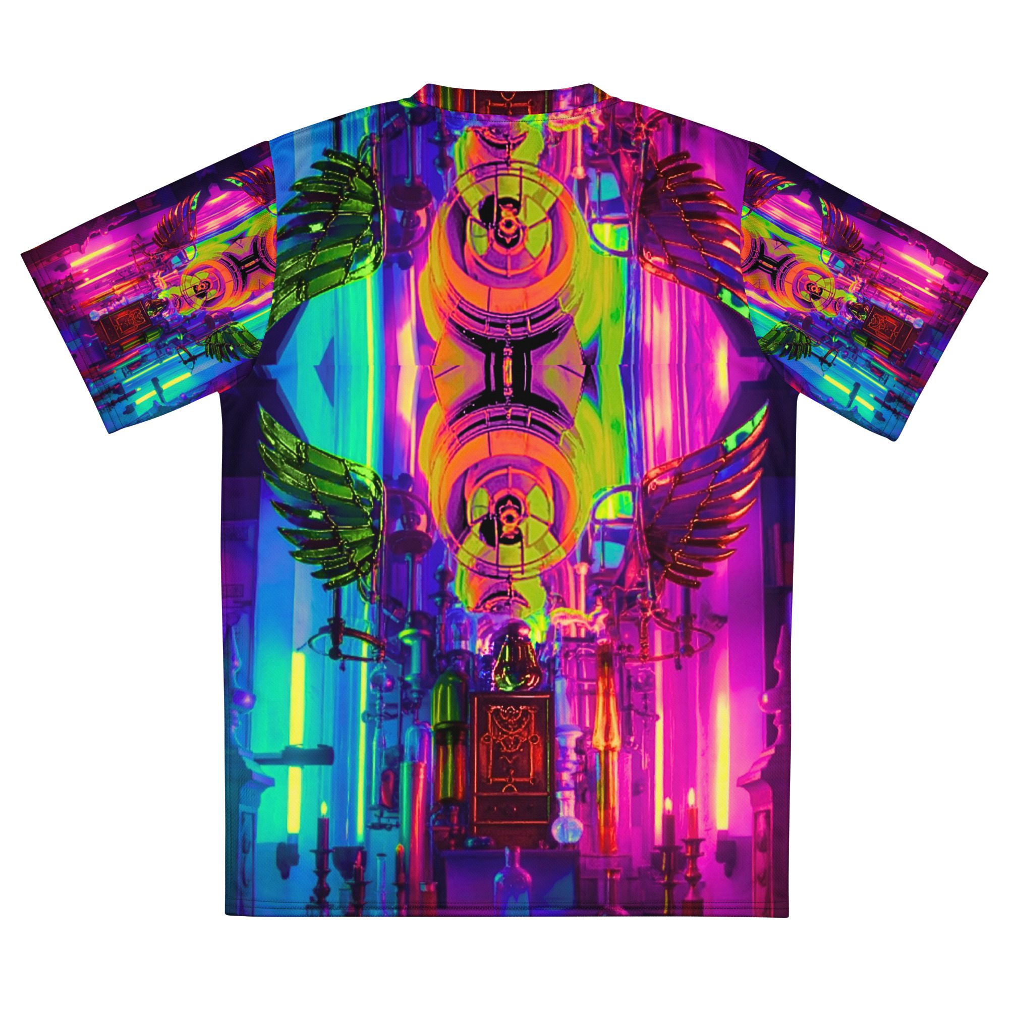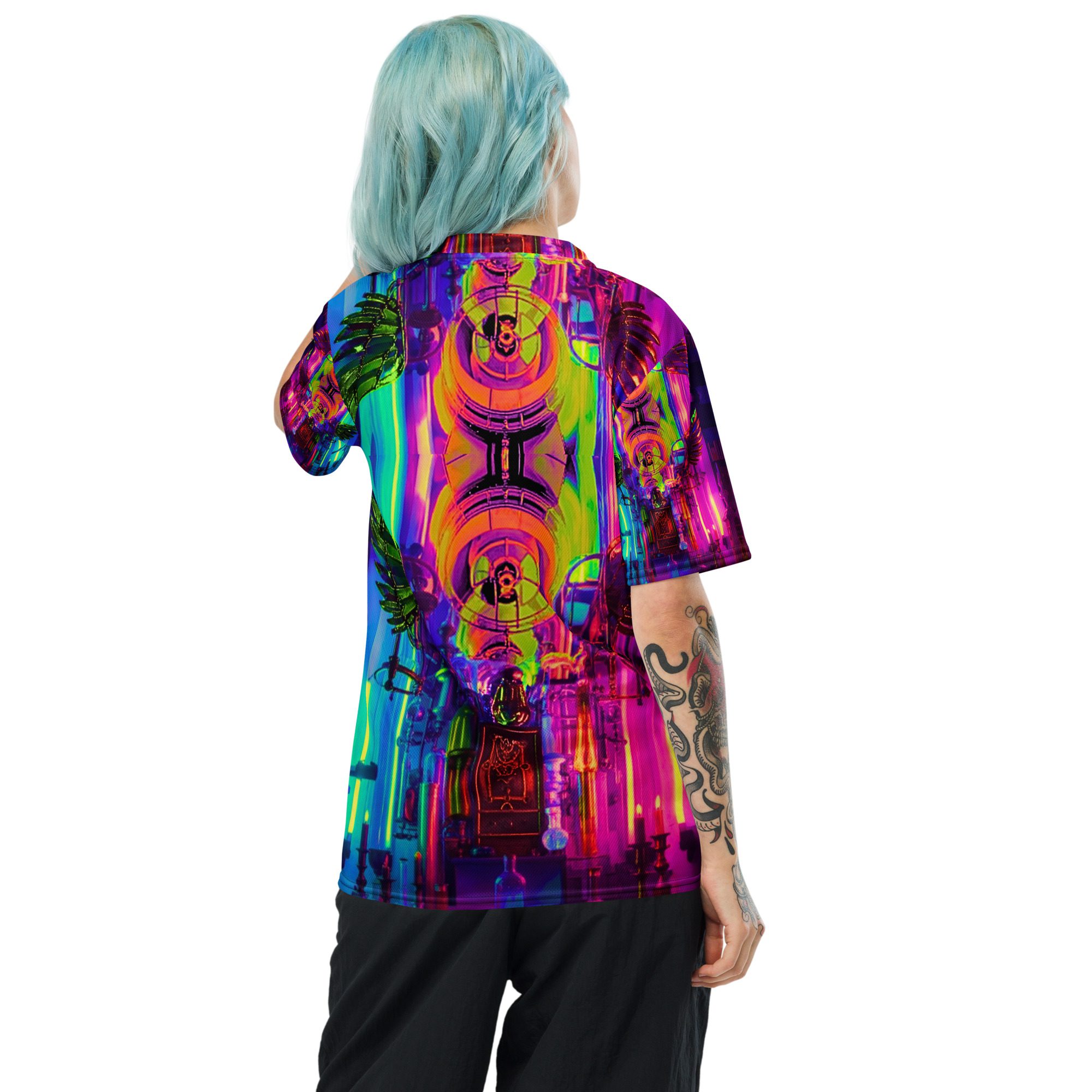 Designed for those who move through the world as quiet observers and modern scholars, this all-over print jersey evokes secret societies, lost manuscripts, hidden libraries, and rituals preserved beneath stained glass ceilings. The glowing spectrum reads like encrypted knowledge—half spiritual, half scholarly—making it a powerful statement piece for collectors of dark academia fashion, gothcore streetwear, occult-inspired apparel, and high-art unisex clothing.