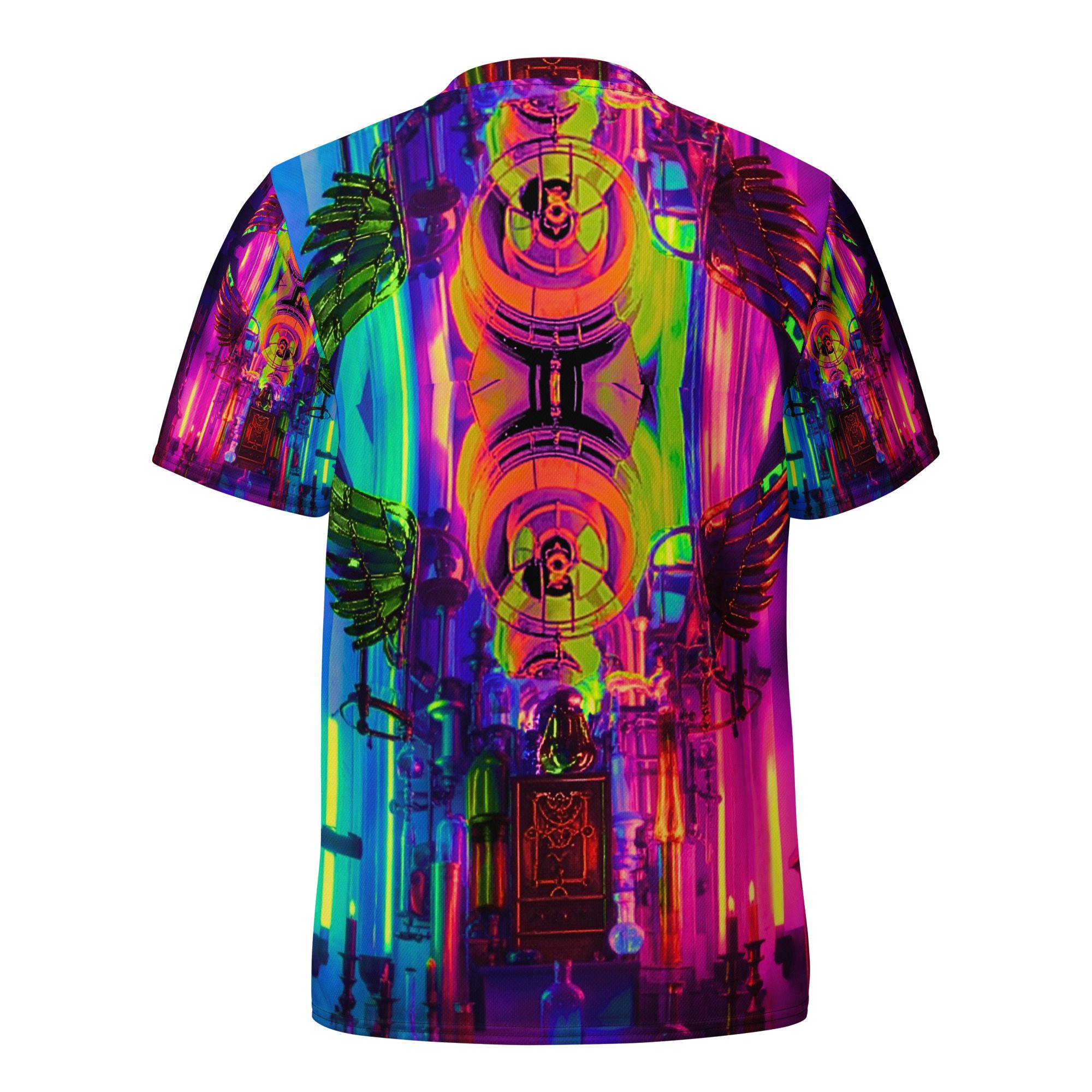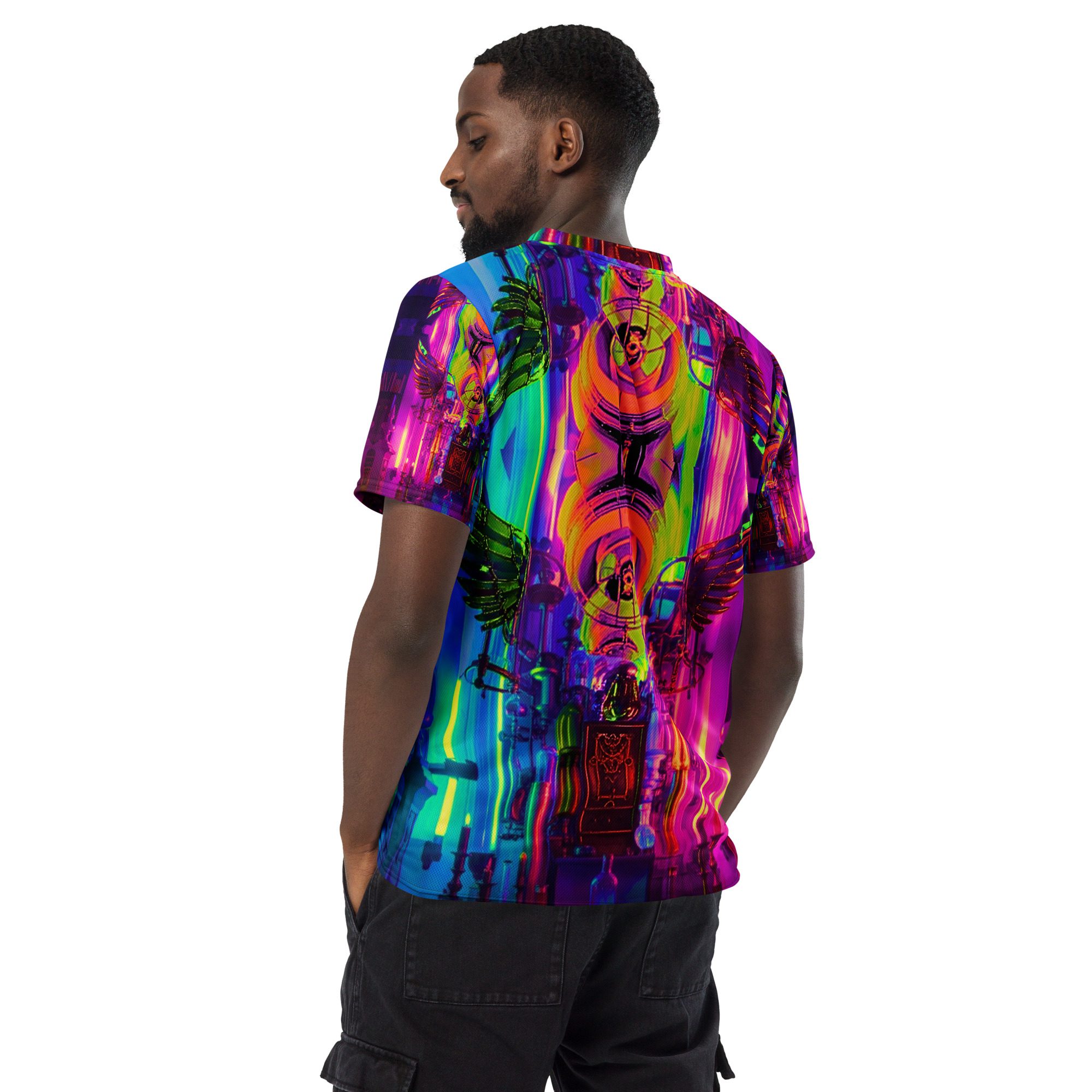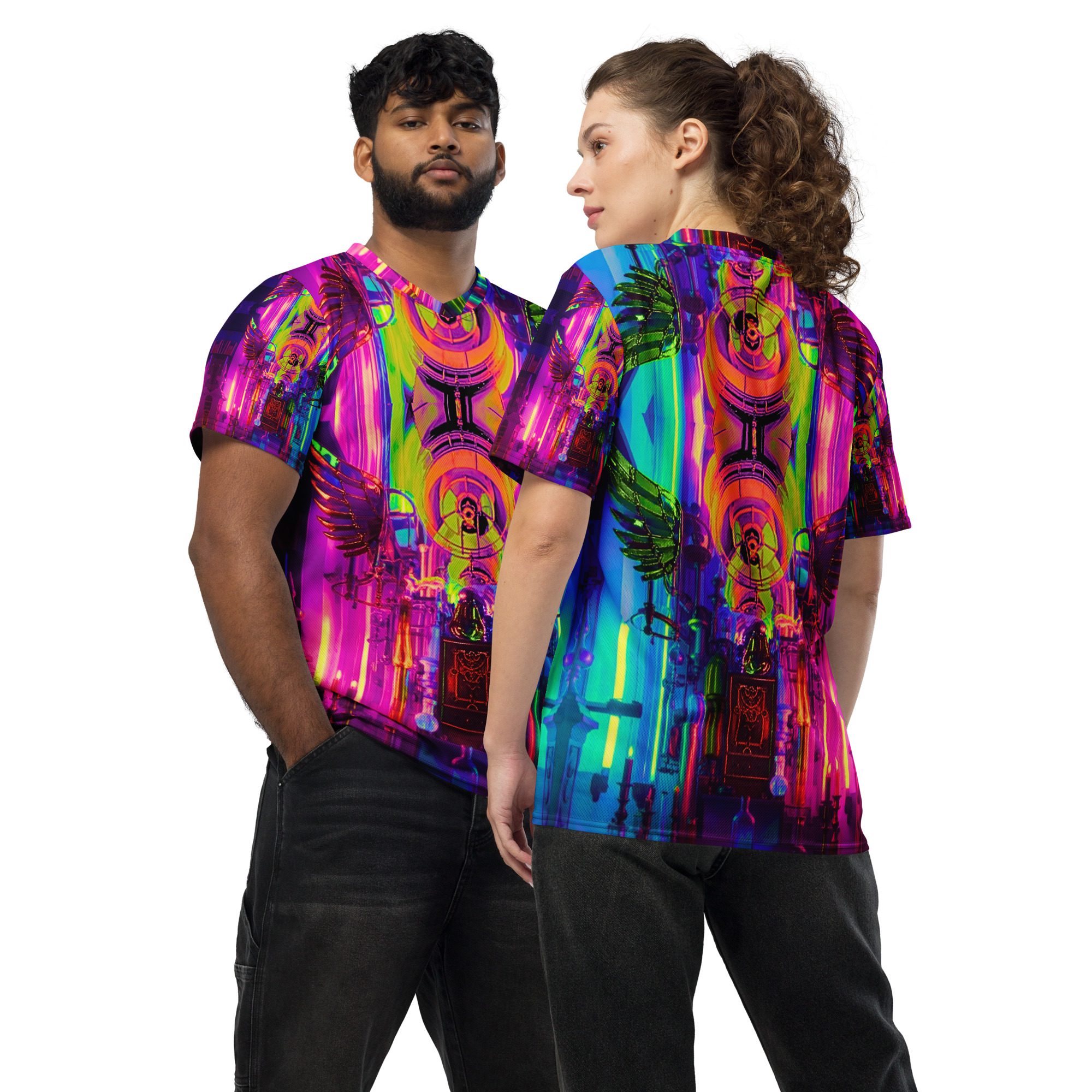 Designed for those who move through the world as quiet observers and modern scholars, this all-over print jersey evokes secret societies, lost manuscripts, hidden libraries, and rituals preserved beneath stained glass ceilings. The glowing spectrum reads like encrypted knowledge—half spiritual, half scholarly—making it a powerful statement piece for collectors of dark academia fashion, gothcore streetwear, occult-inspired apparel, and high-art unisex clothing.