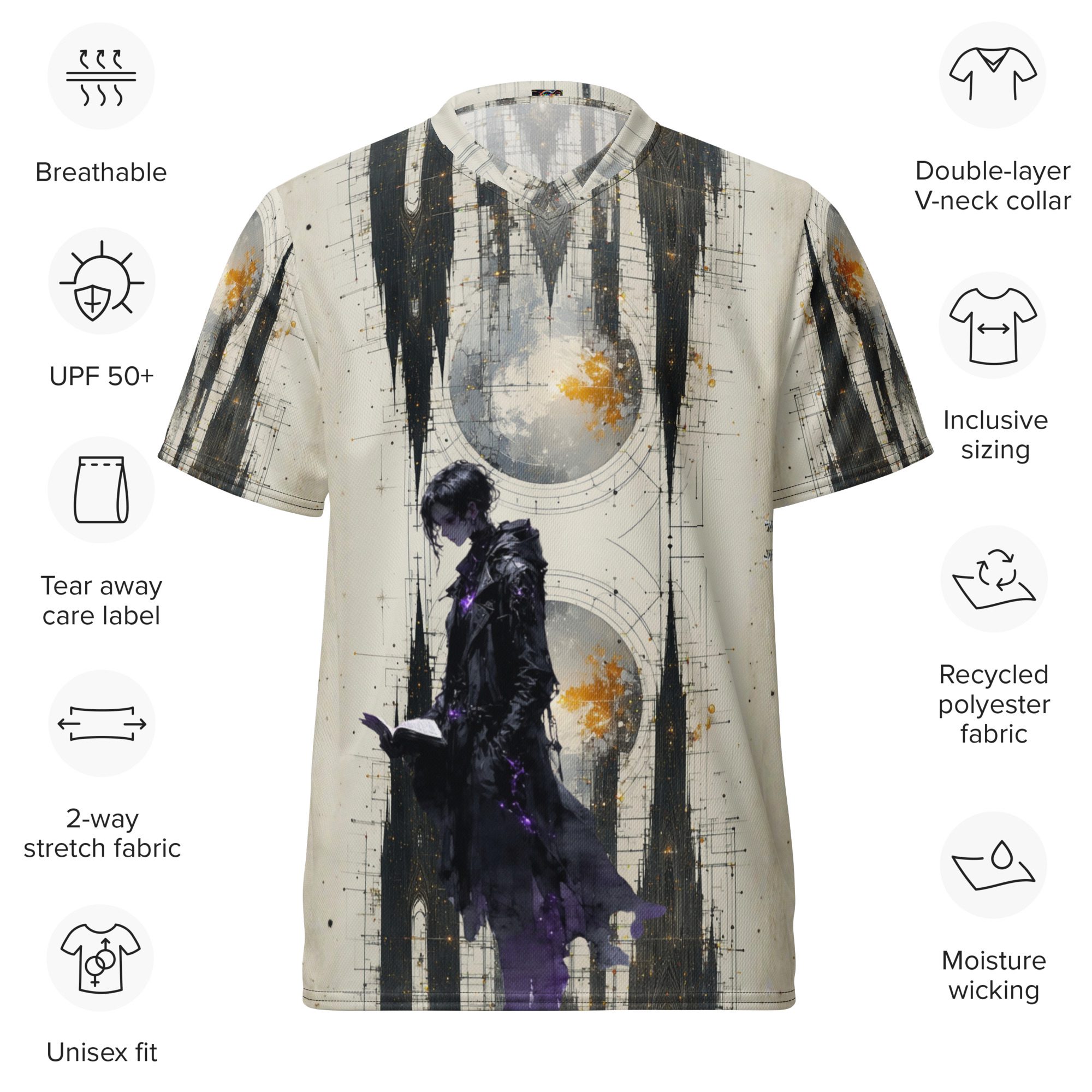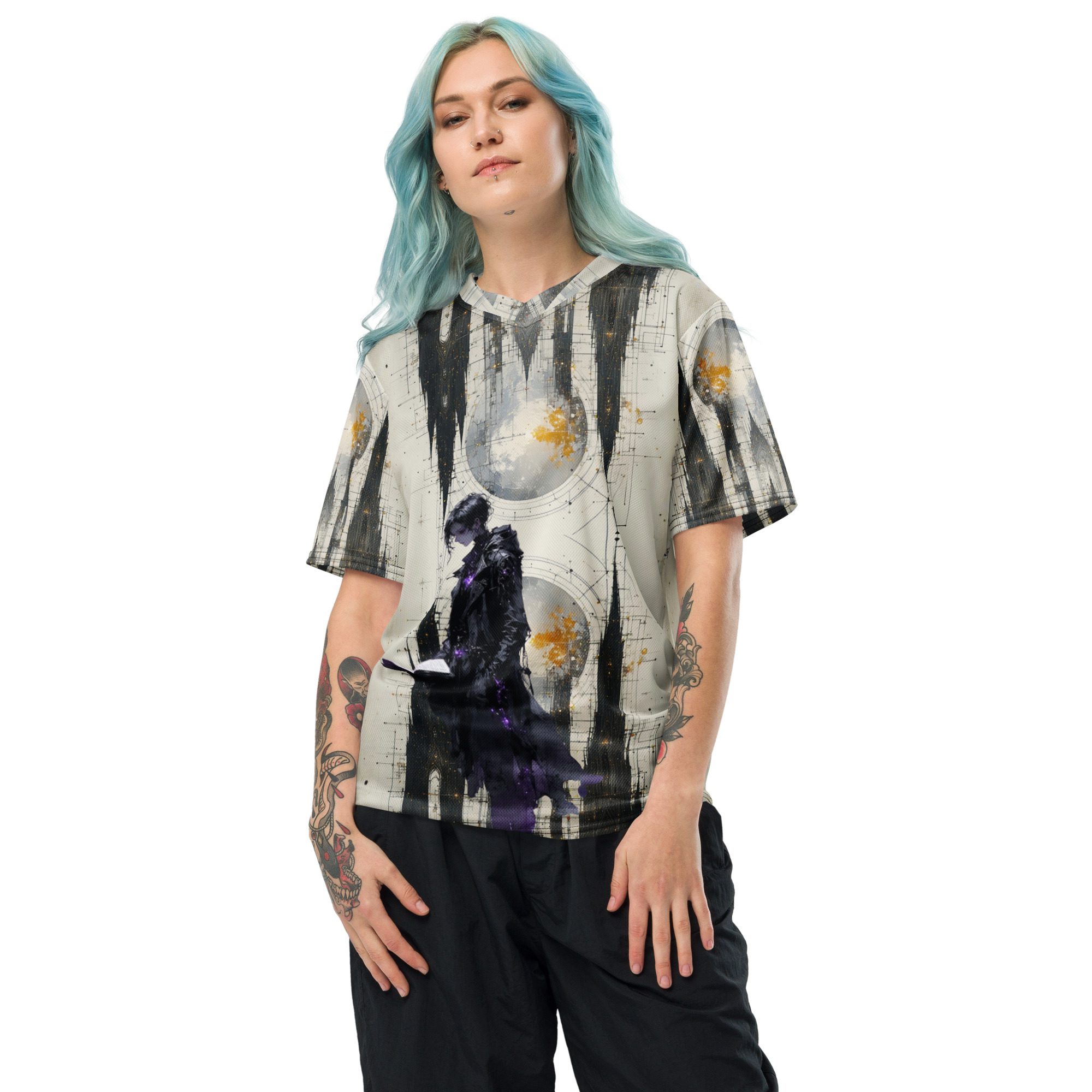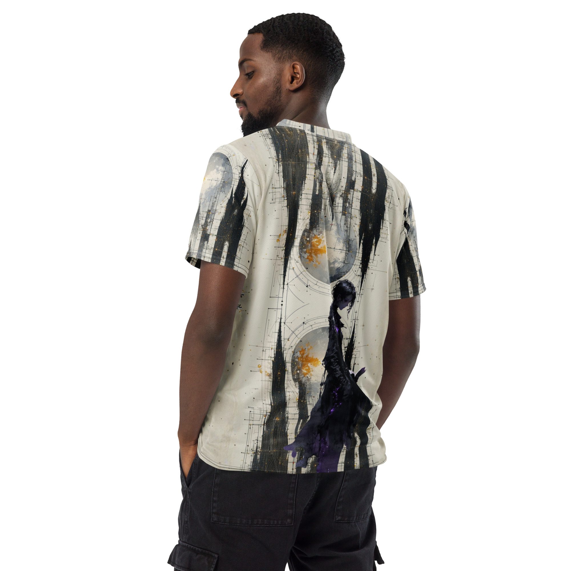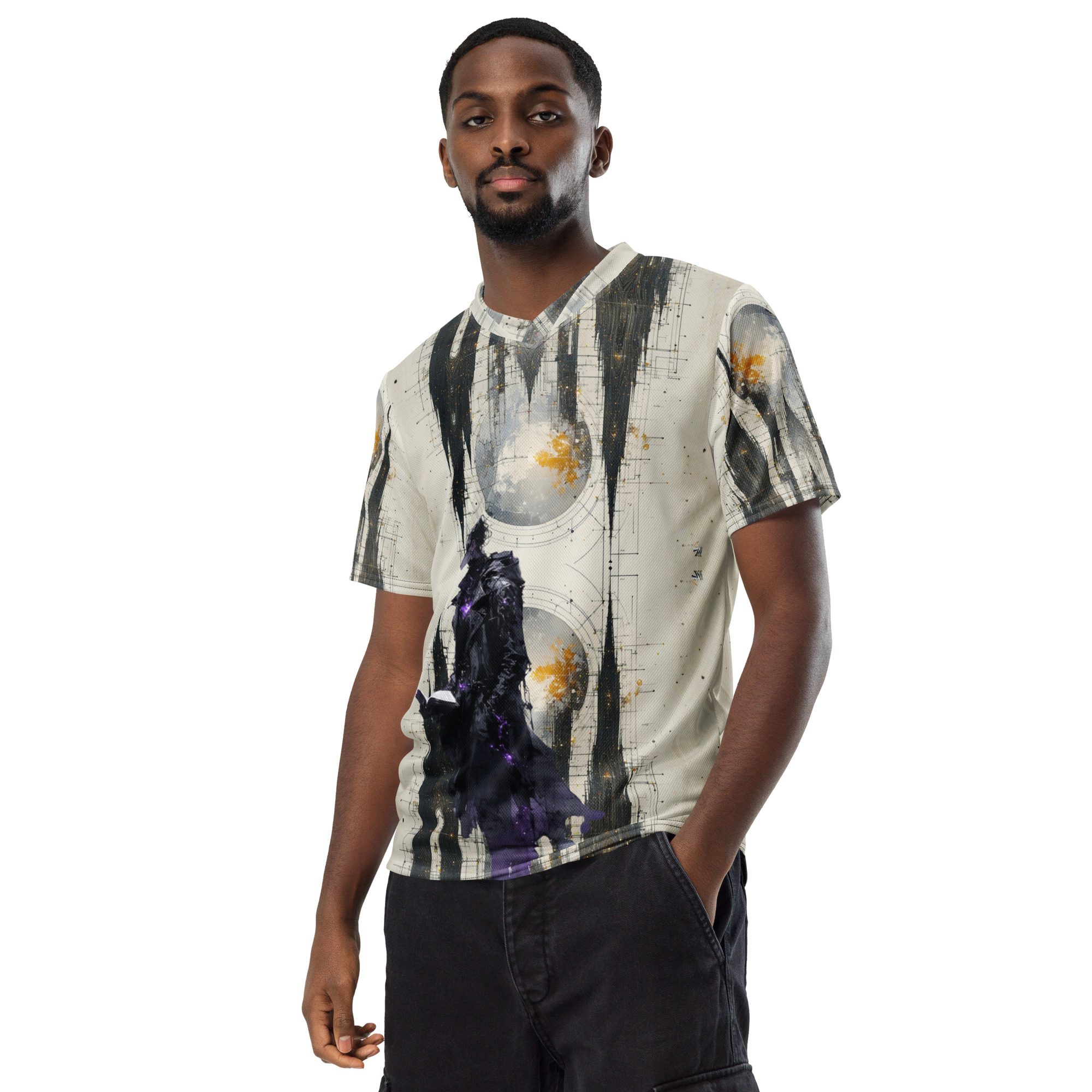 This recycled unisex sports jersey delivers breathable comfort with emotional depth. Designed for movement and versatility, it wears effortlessly on its own or layered beneath jackets, becoming a subtle statement piece rather than a loud declaration.