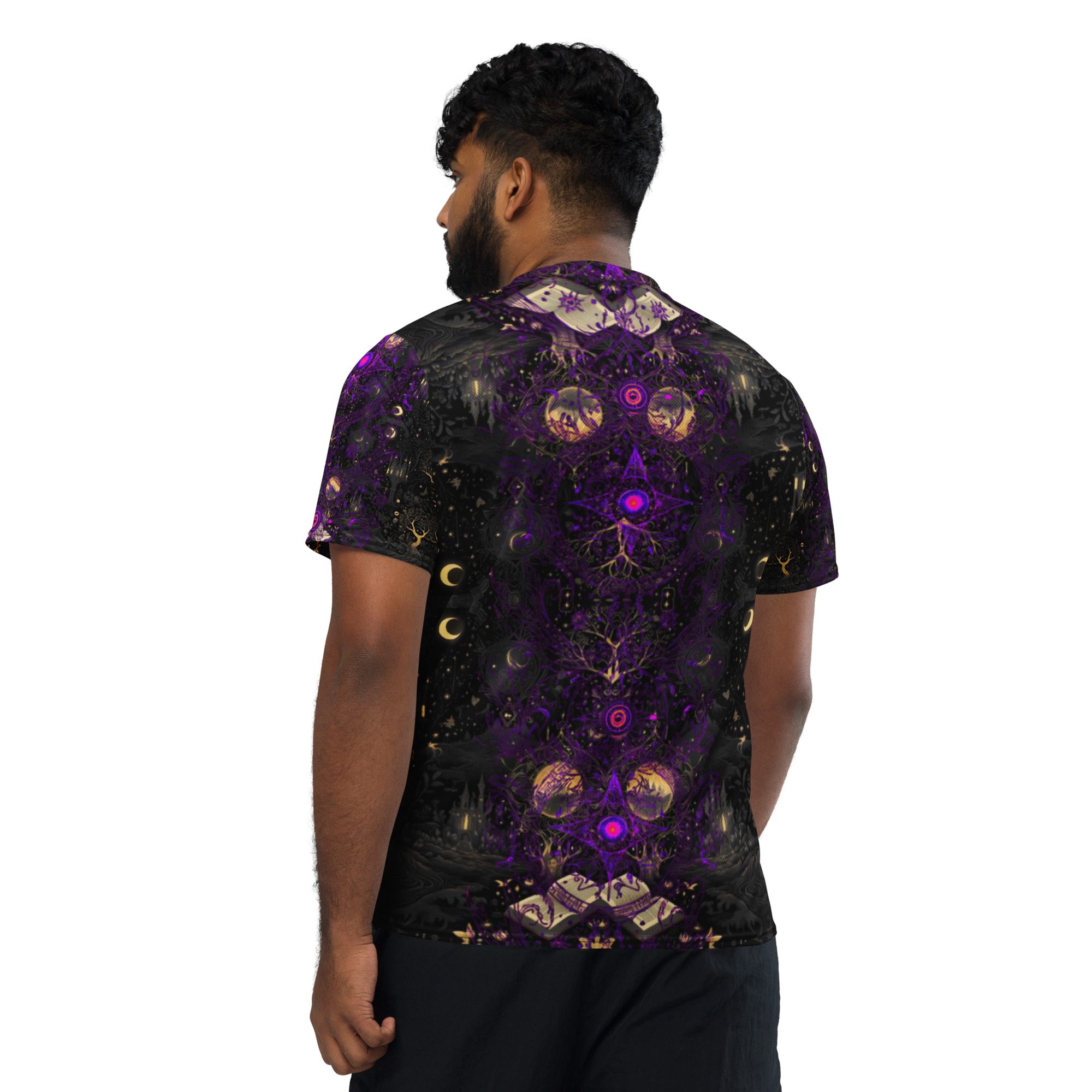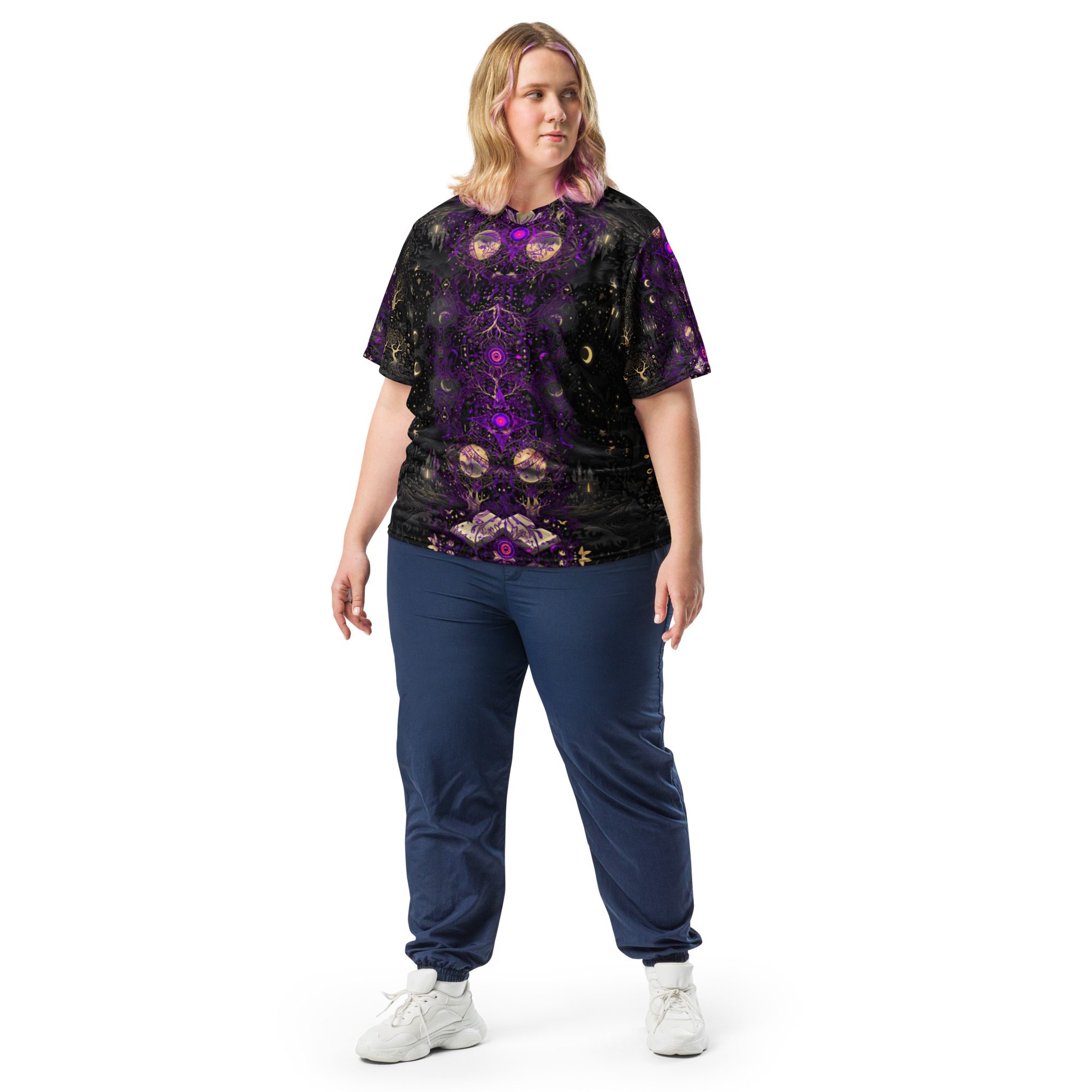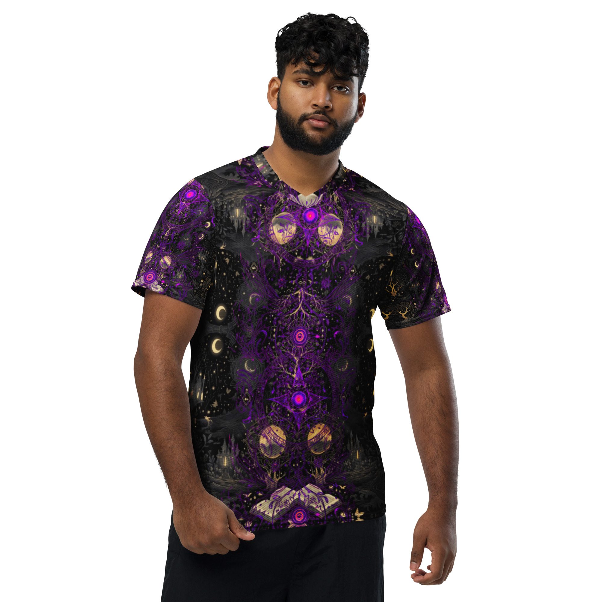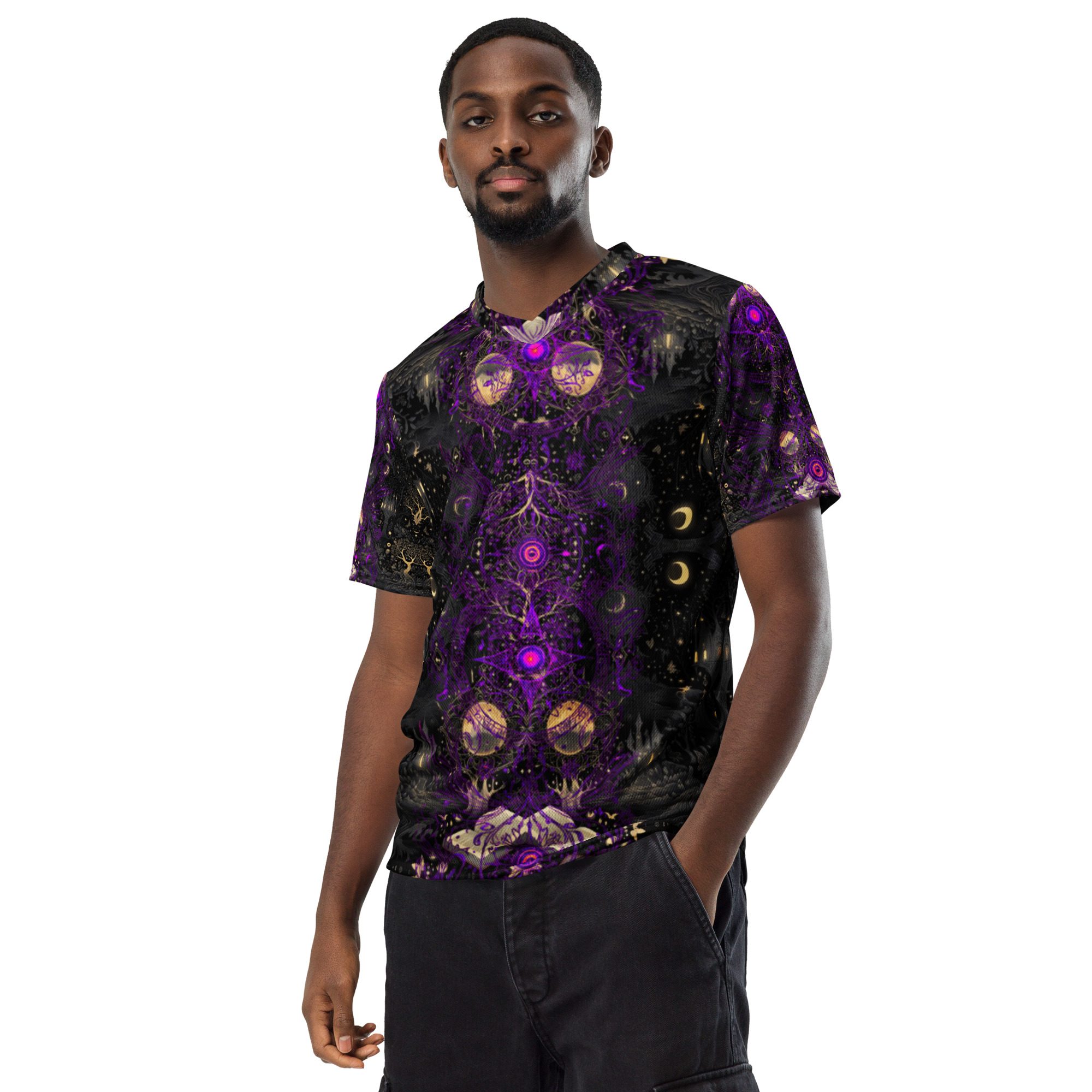 Designed to feel like a lost manuscript translated into wearable art, this all-over print jersey carries the energy of late-night study halls, candlelit rituals, stargazing scholars, and ink-stained pages. The amethyst and black palette evokes mysticism, intellect, and quiet power, making it ideal for those who dress with intention rather than trend-chasing.