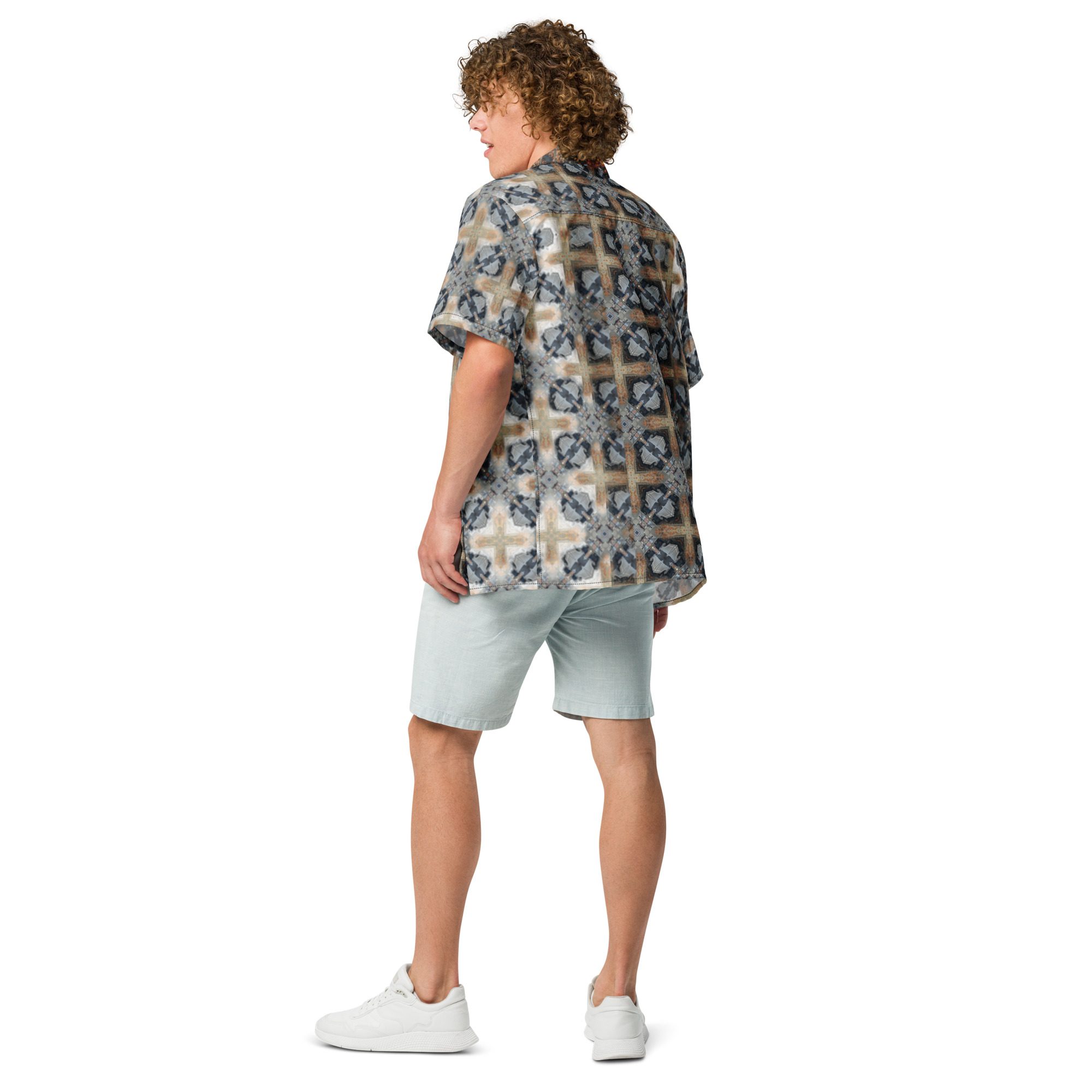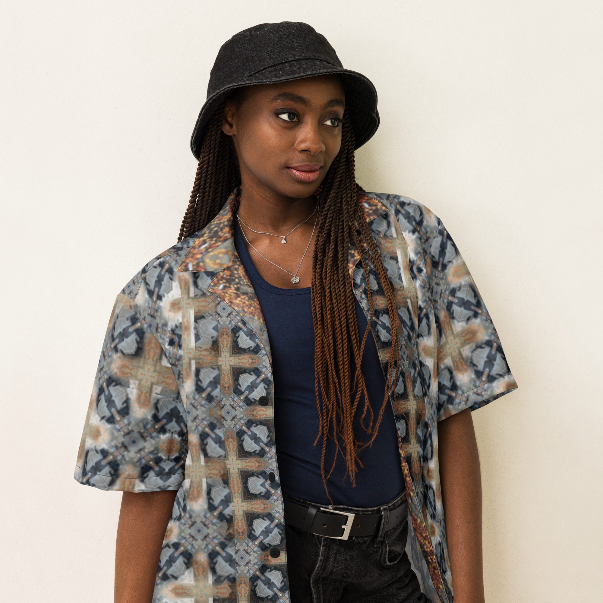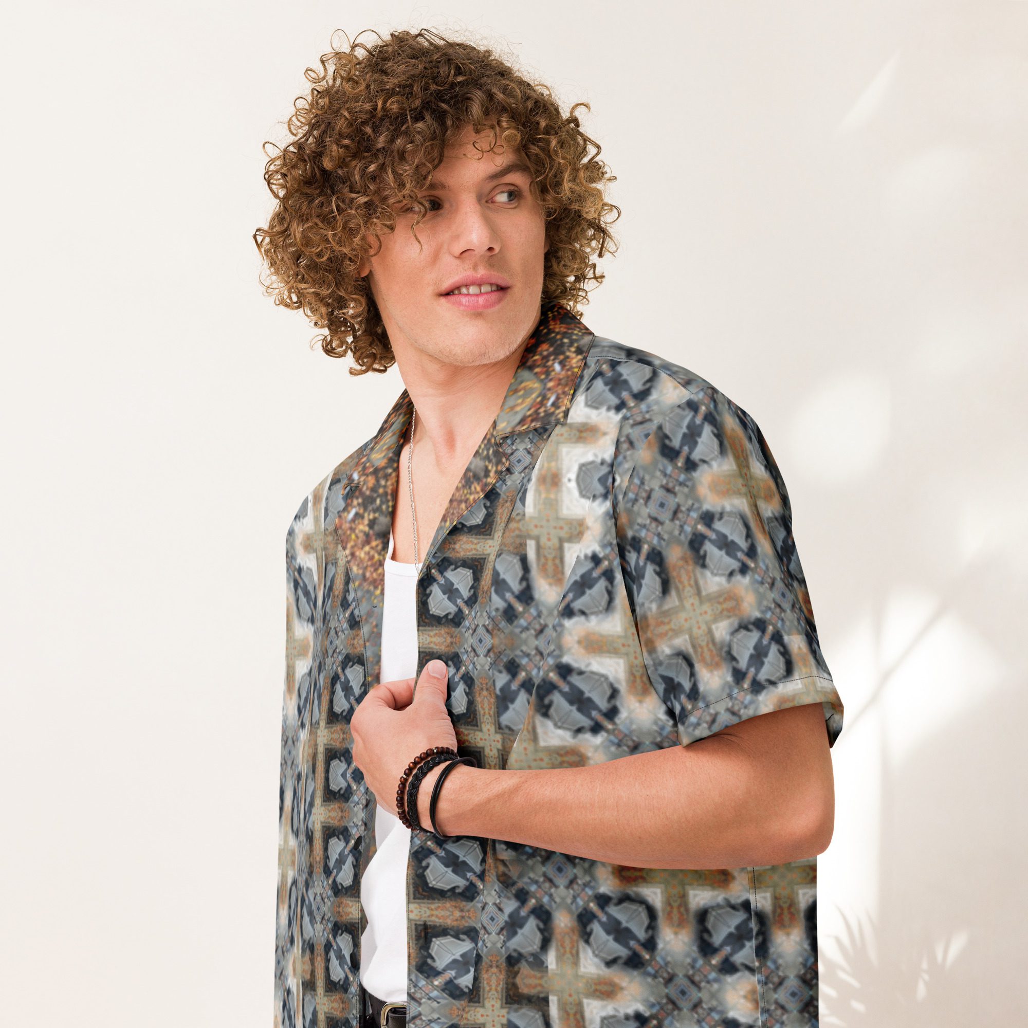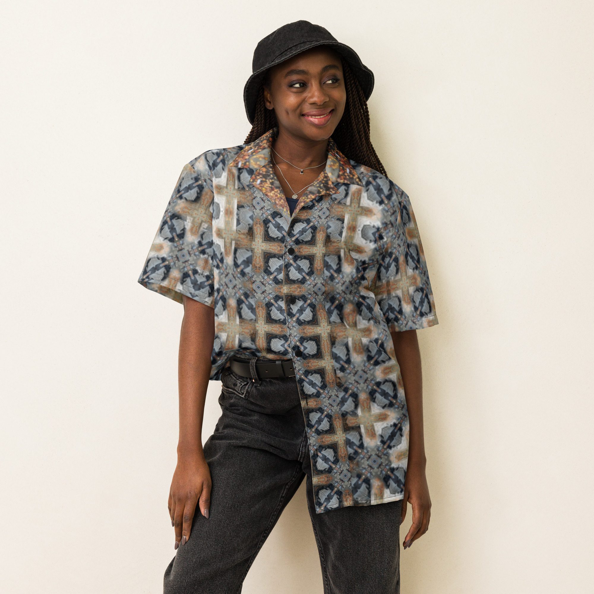 This unisex button shirt fuses industrial elegance with abstract artistry — a balanced pattern of metallic tones, steel blues, and burnished bronze hues that evoke the sophistication of modern architecture and the grit of city rhythm. The geometric symmetry creates a bold yet wearable aesthetic that transitions seamlessly from casual to elevated.