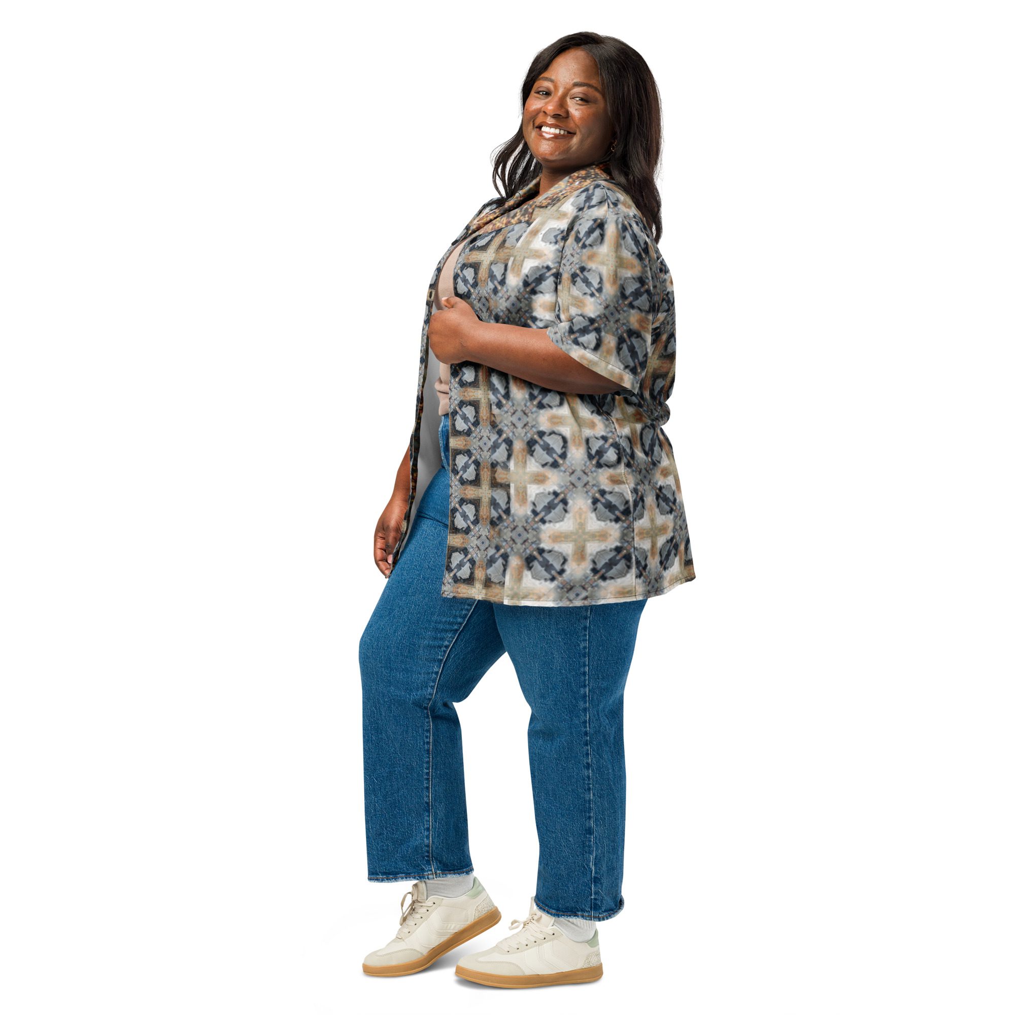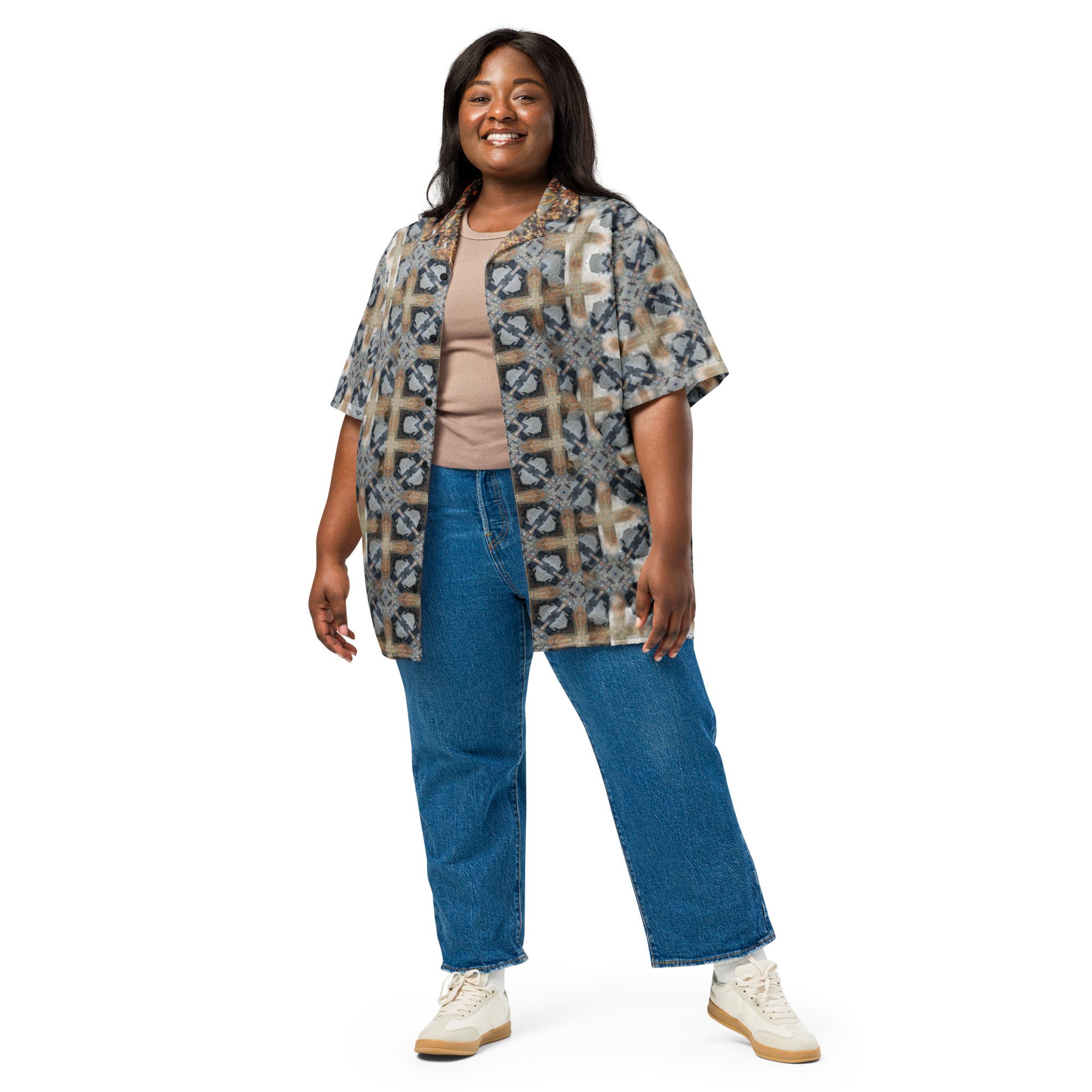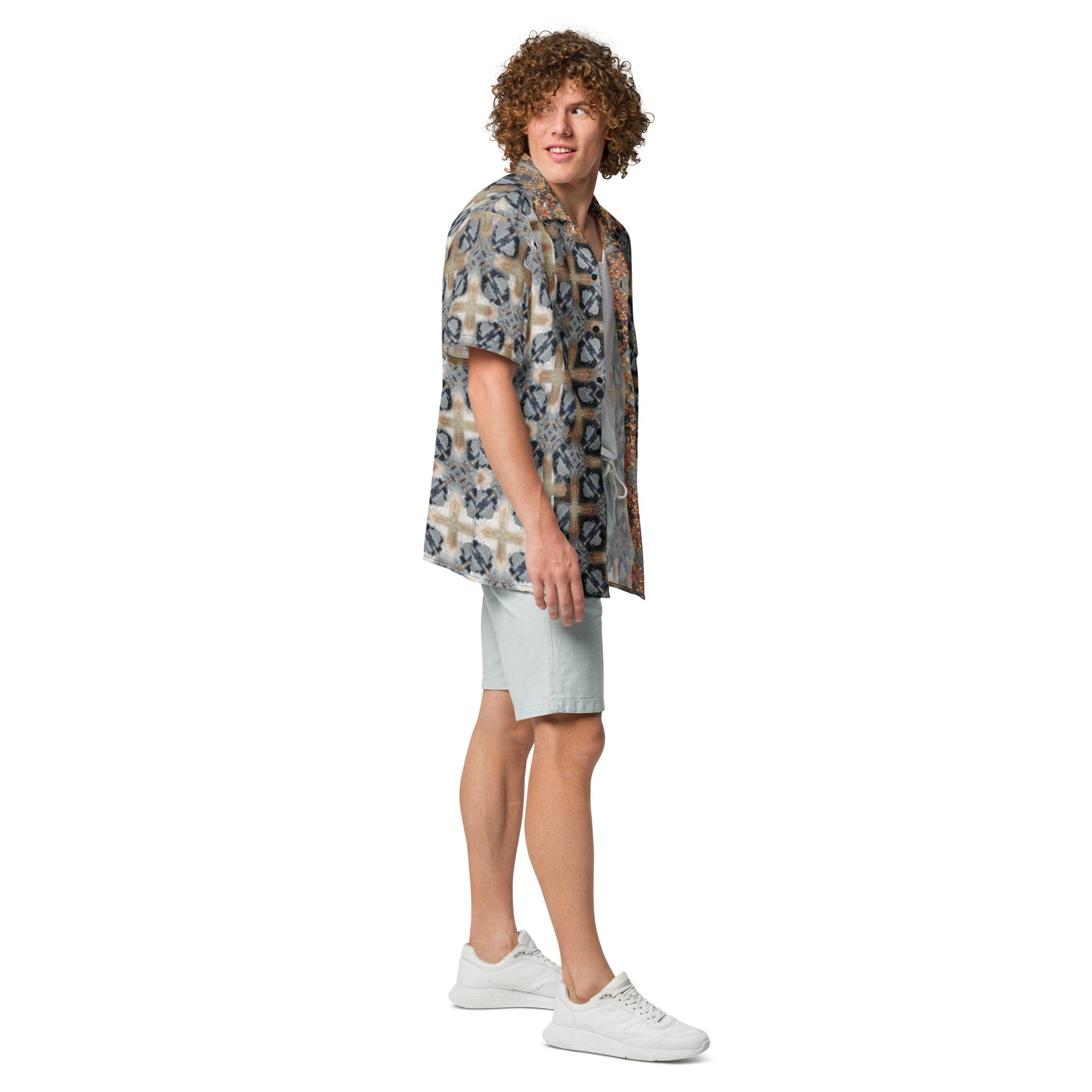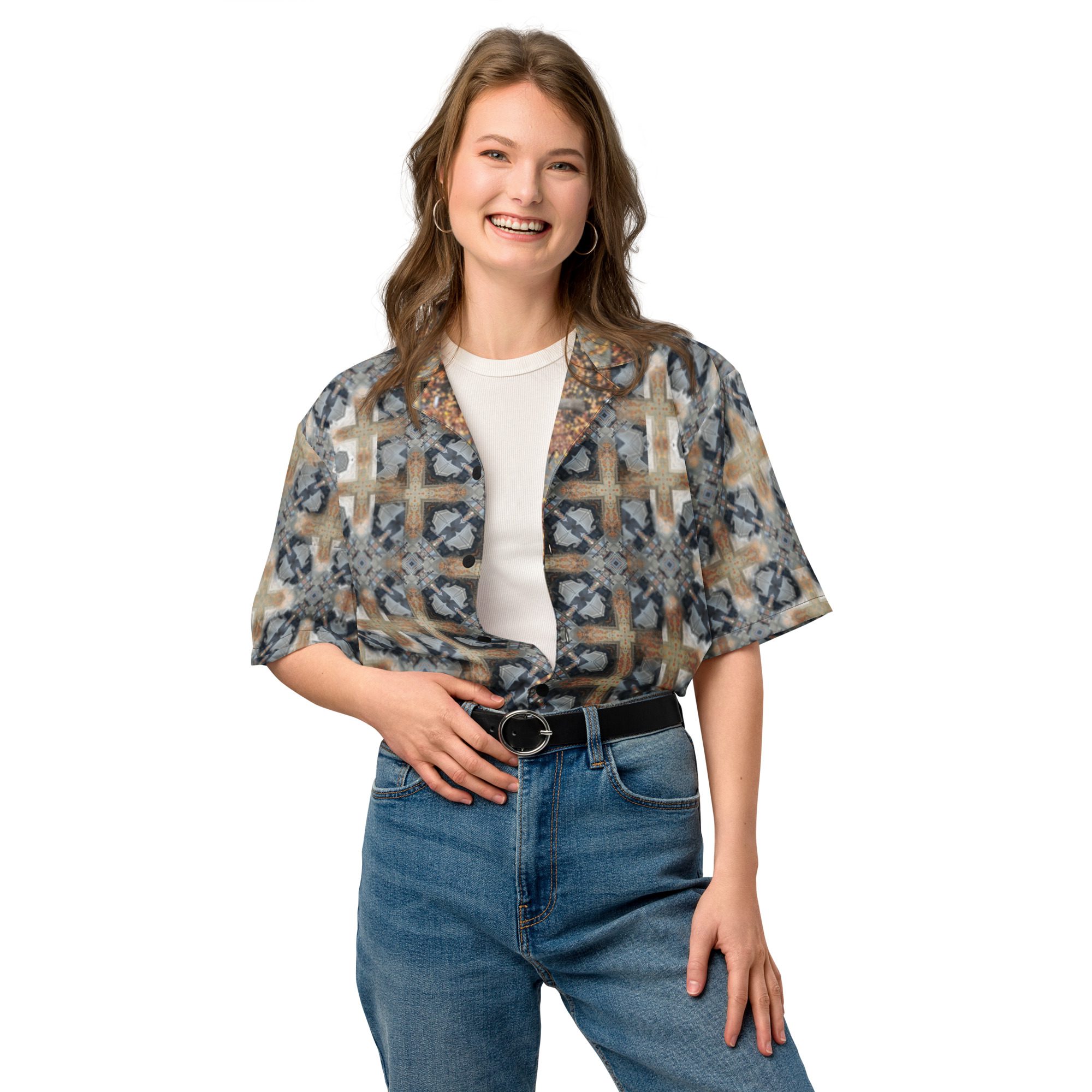 This unisex button shirt fuses industrial elegance with abstract artistry — a balanced pattern of metallic tones, steel blues, and burnished bronze hues that evoke the sophistication of modern architecture and the grit of city rhythm. The geometric symmetry creates a bold yet wearable aesthetic that transitions seamlessly from casual to elevated.