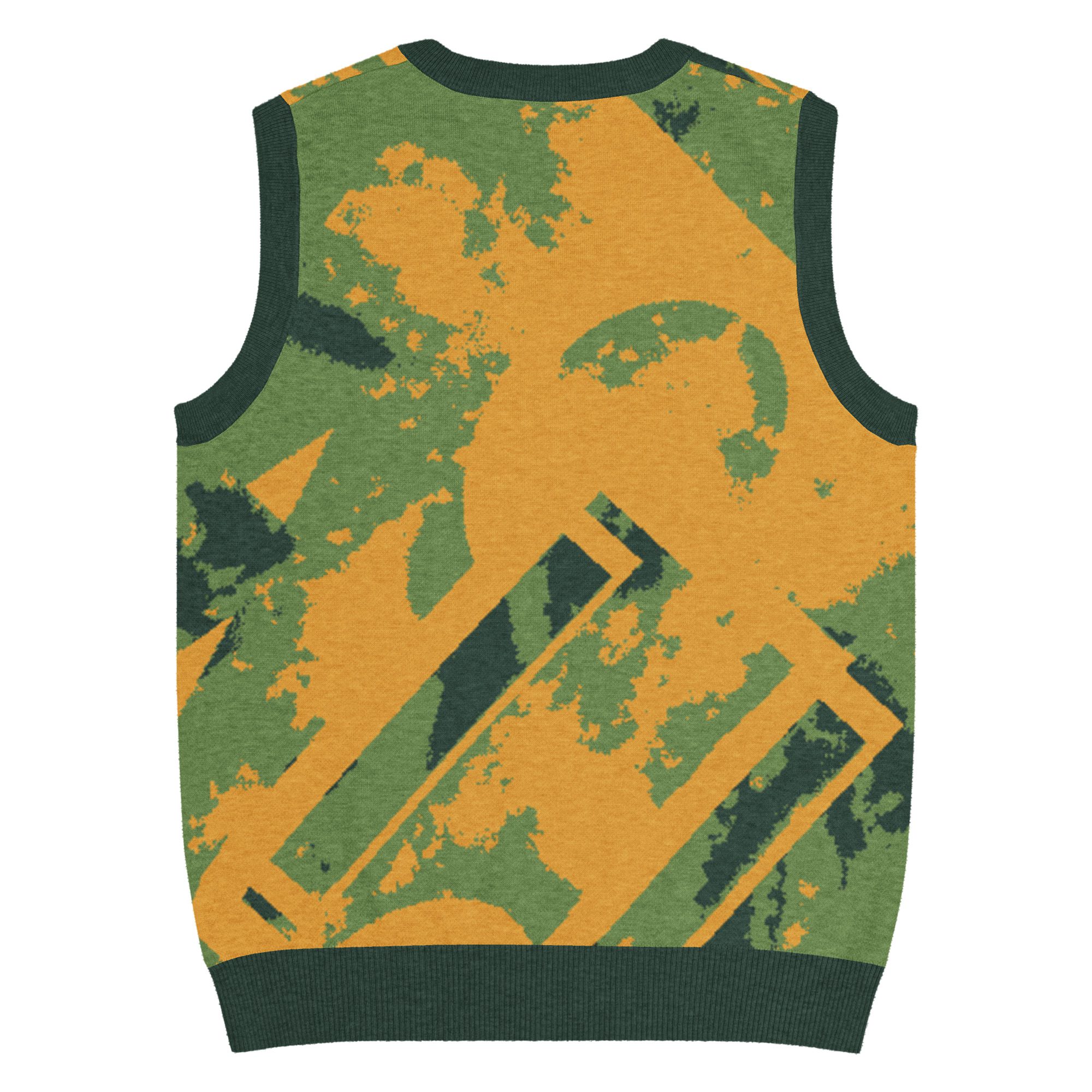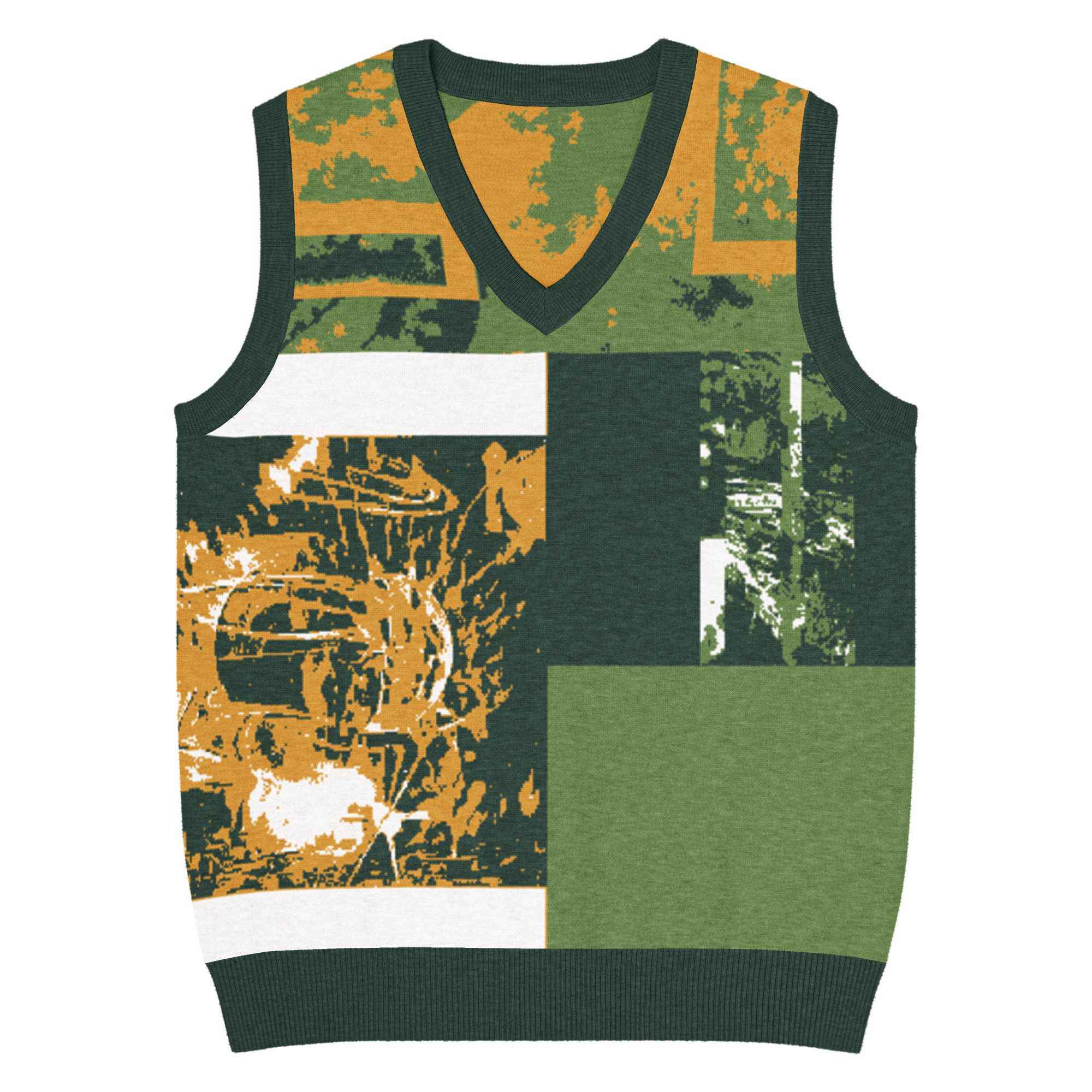 Bring art and comfort together with Urban Harvest, an original textile artwork by Jaysen Mansfield. This striking knit V-neck vest blends rustic greens and golden hues into a modern patchwork design that feels both organic and urban. Its asymmetrical layout and textured pattern evoke the look of abstract brushstrokes captured on fabric — perfect for anyone who likes to wear creativity out loud.