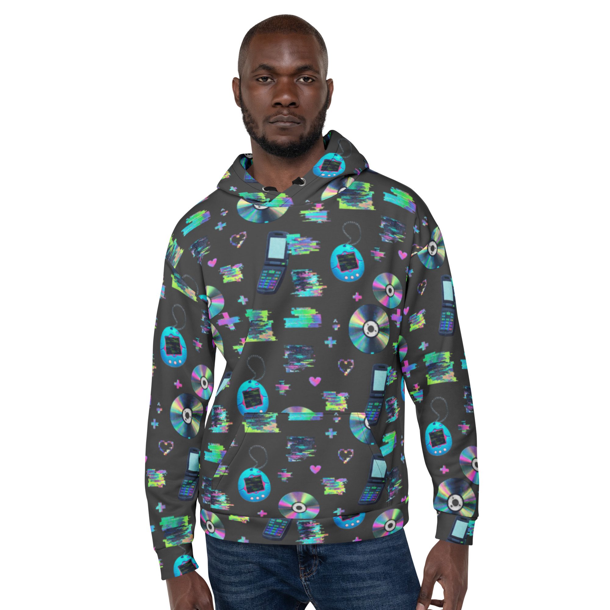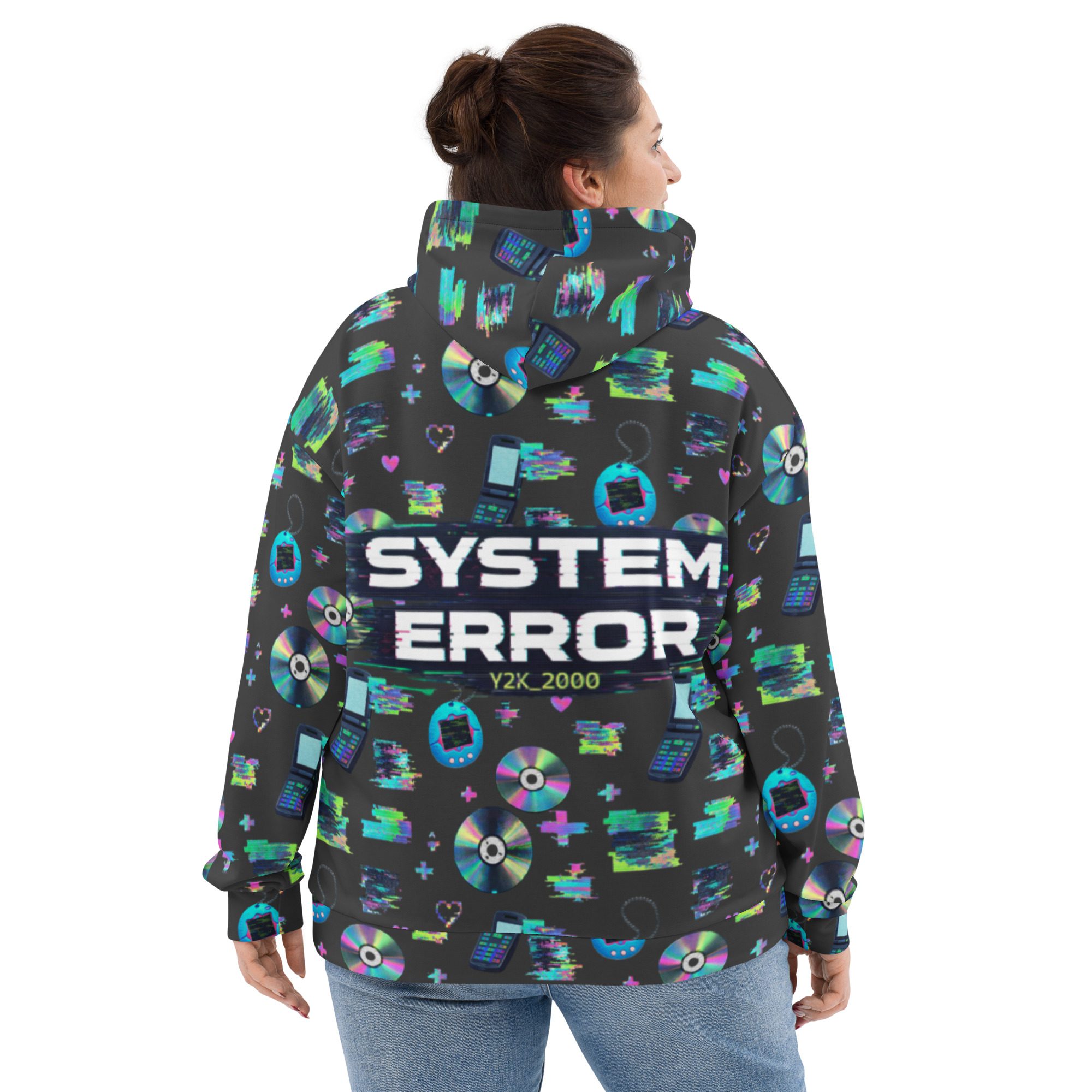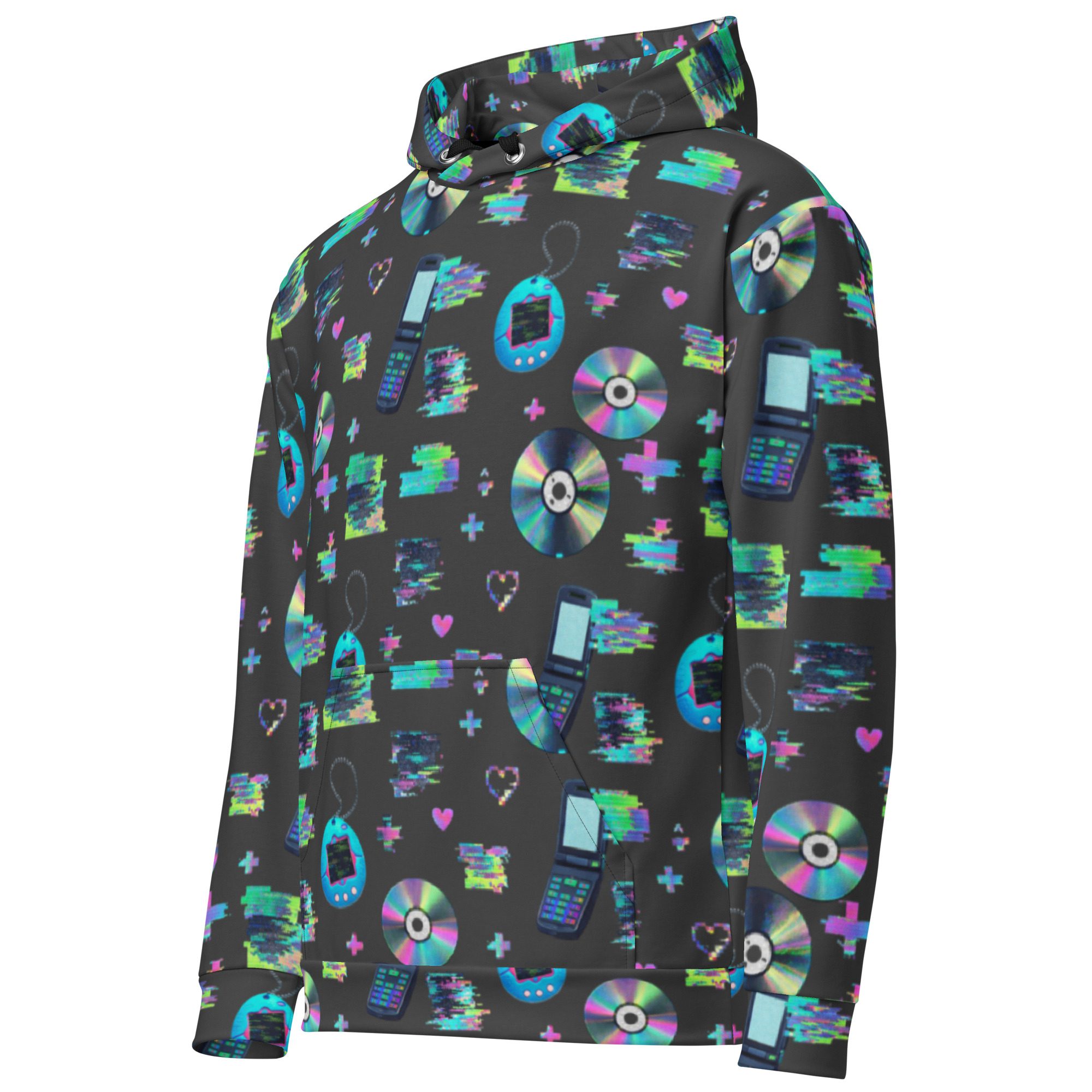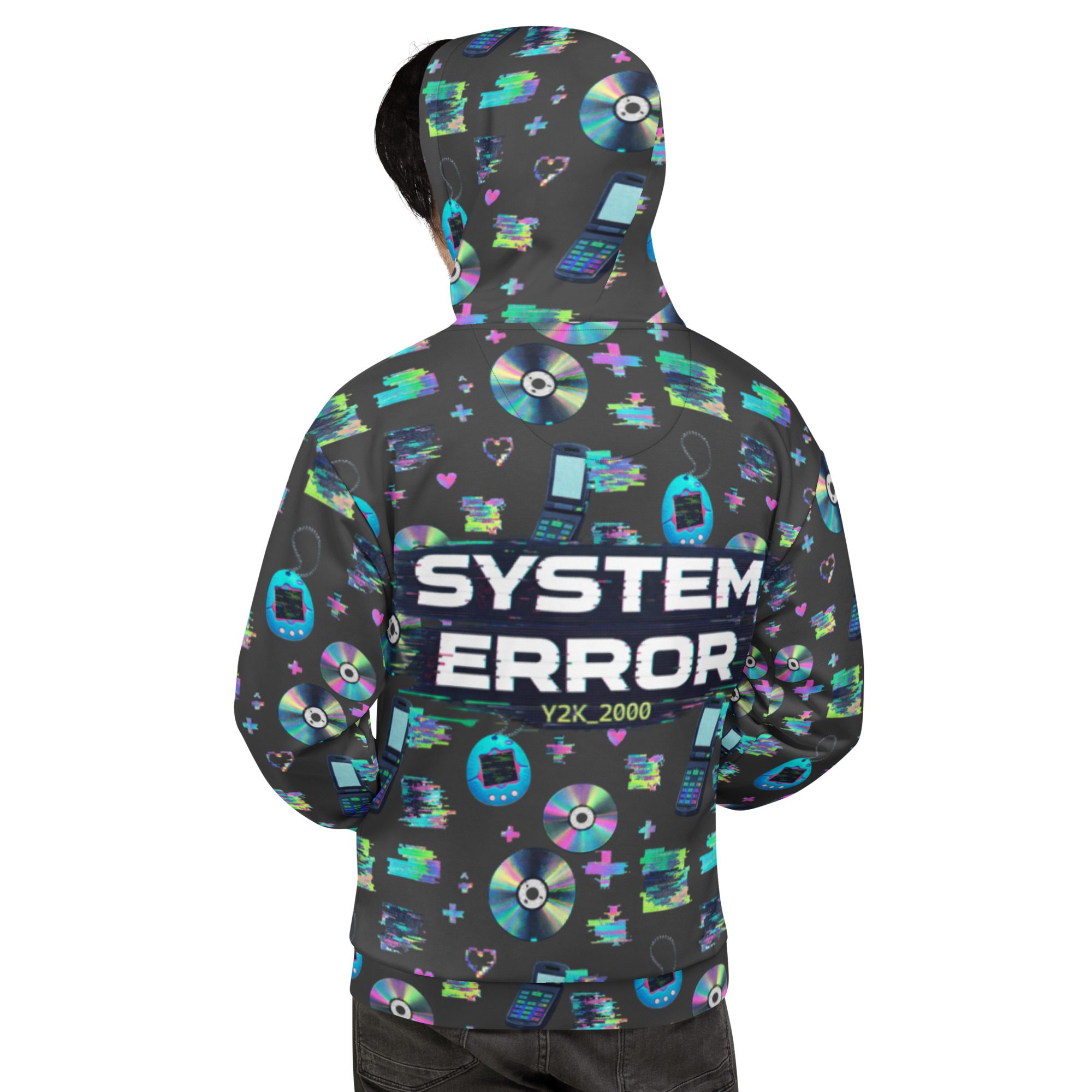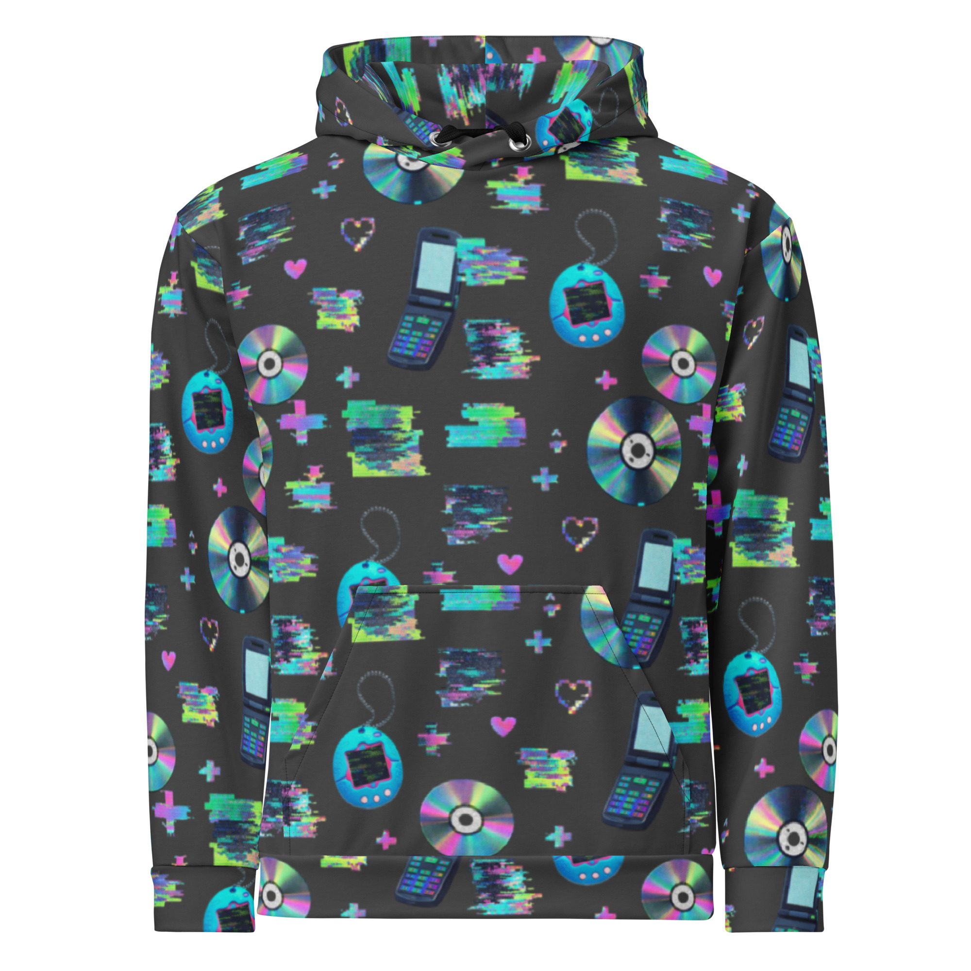 Welcome to peak Y2K. This all-over print hoodie is a full-on throwback to the early-2000s internet era—glitchy “system error” energy, pixel hearts, shiny CDs, and retro tech icons that look like they came straight out of your favorite old desktop screen. It’s loud in the best way, cozy on the inside, and made for anyone who misses the chaos (just a little).