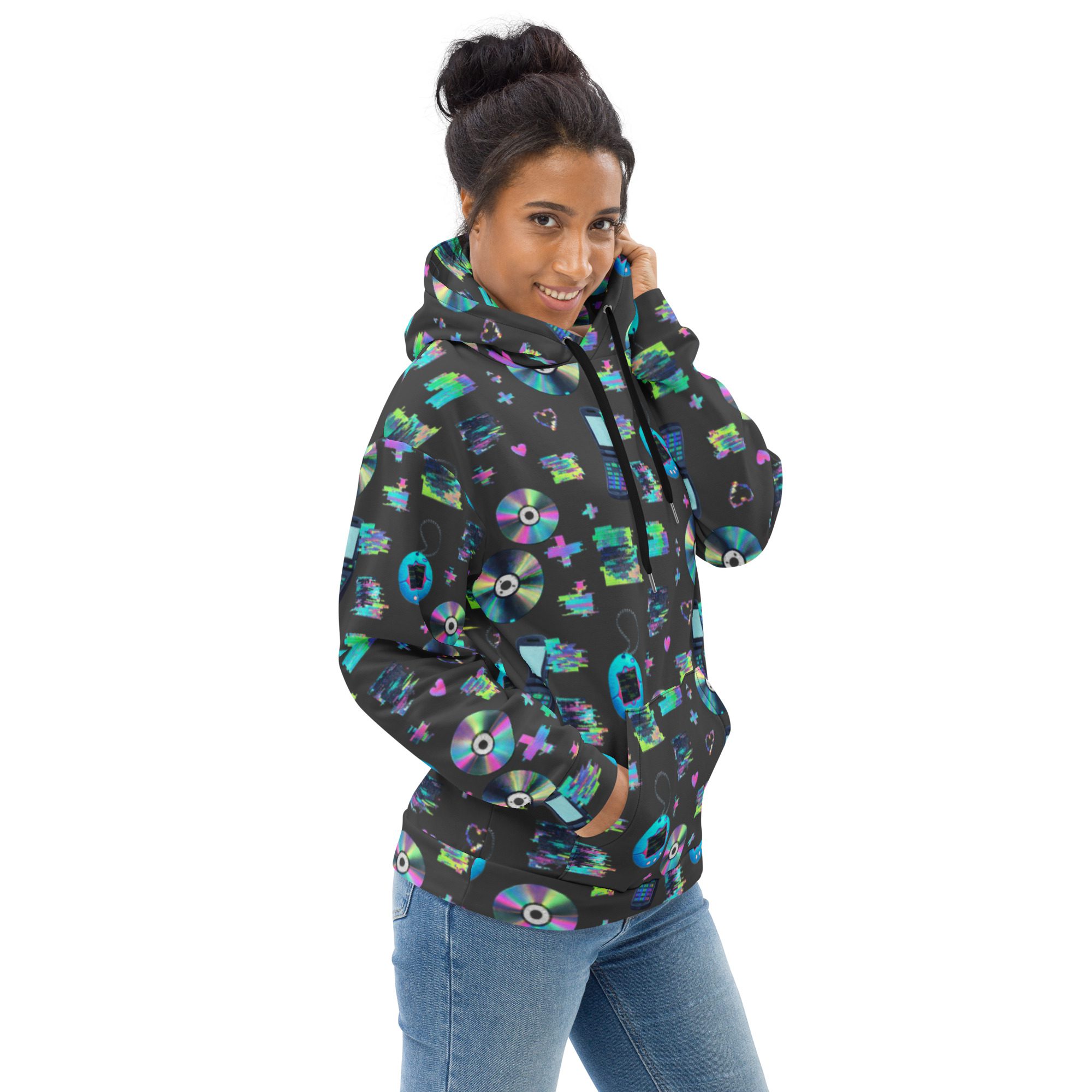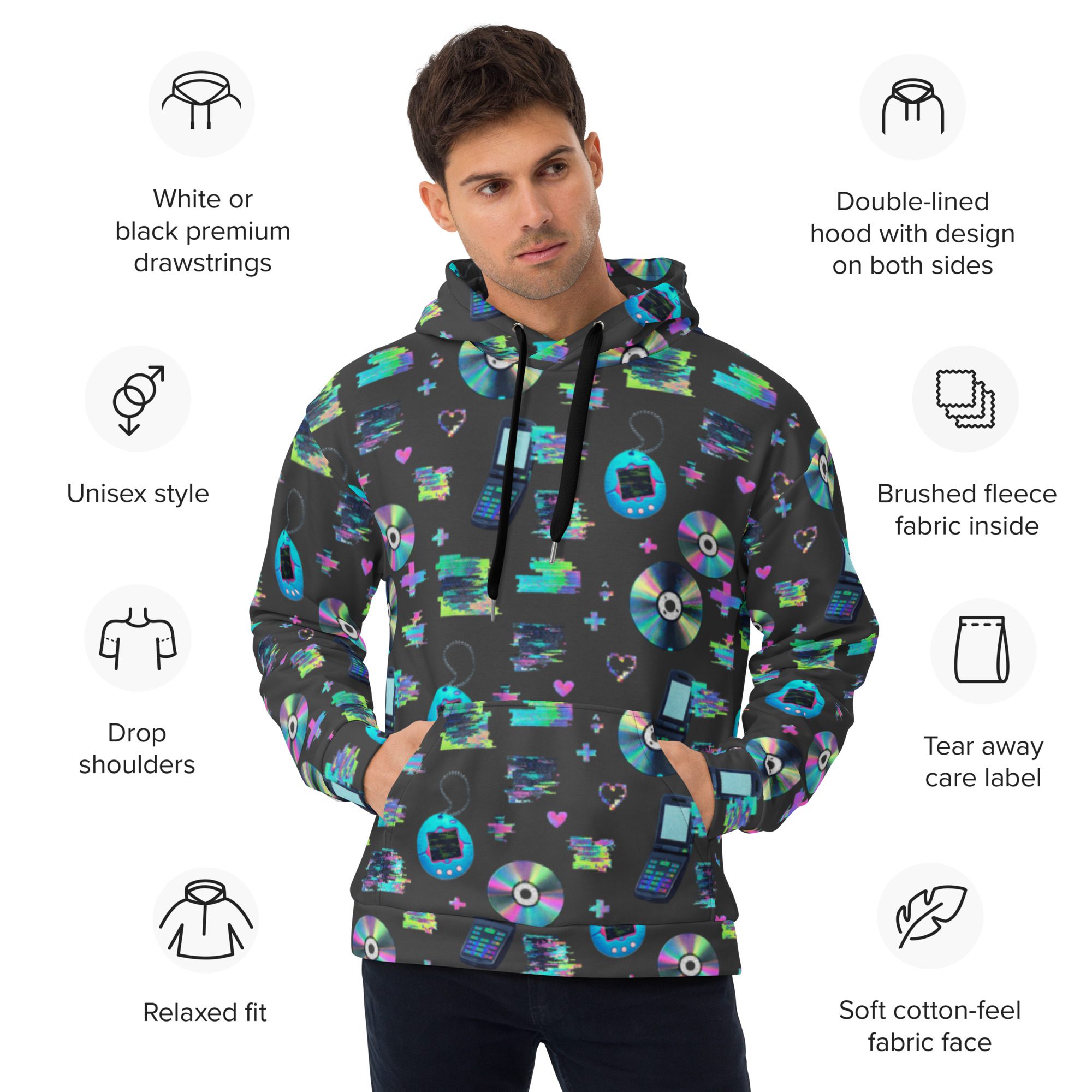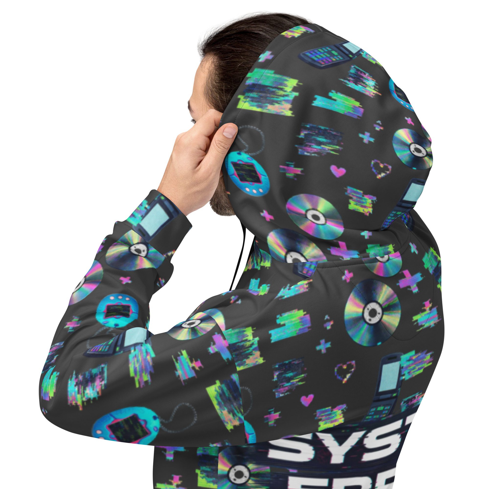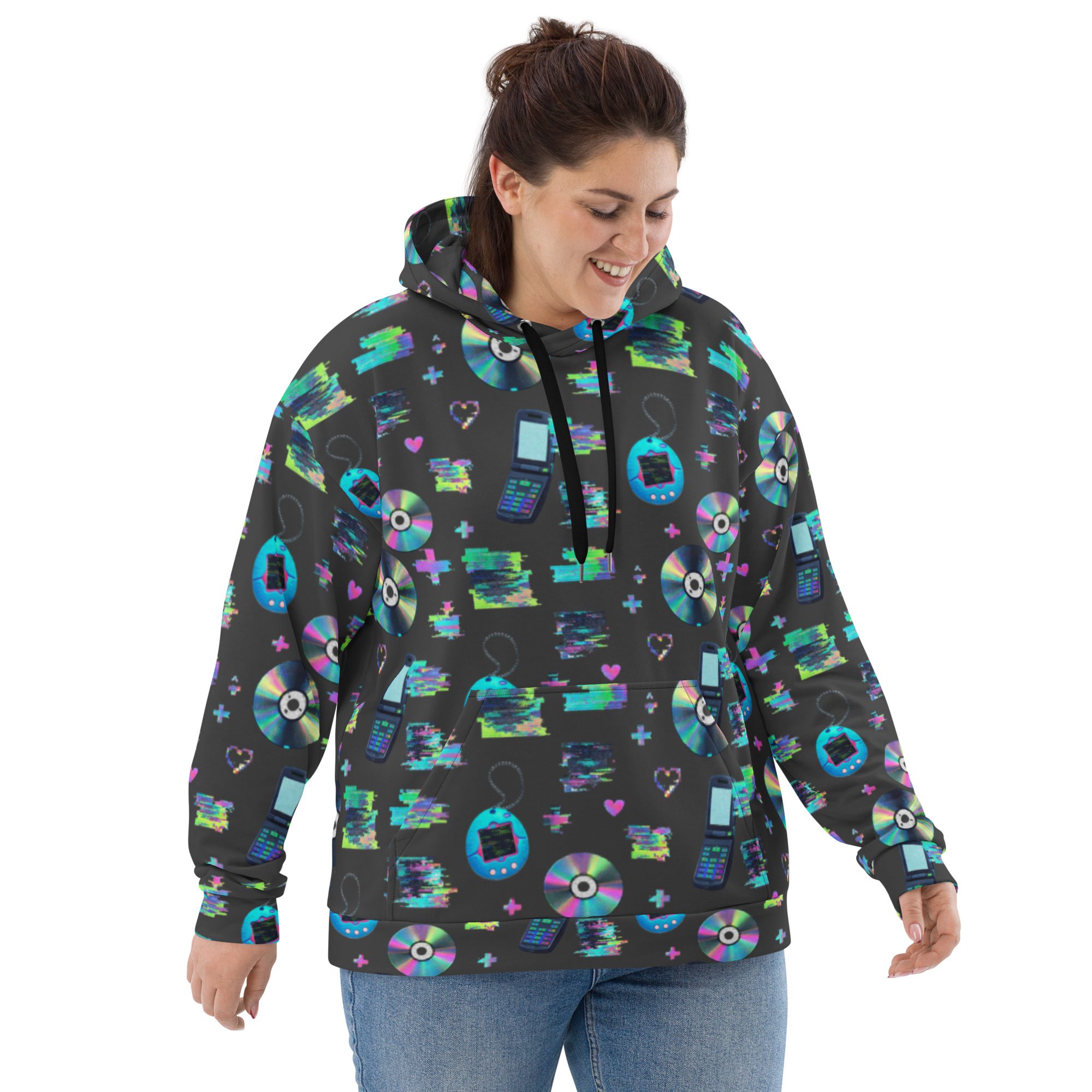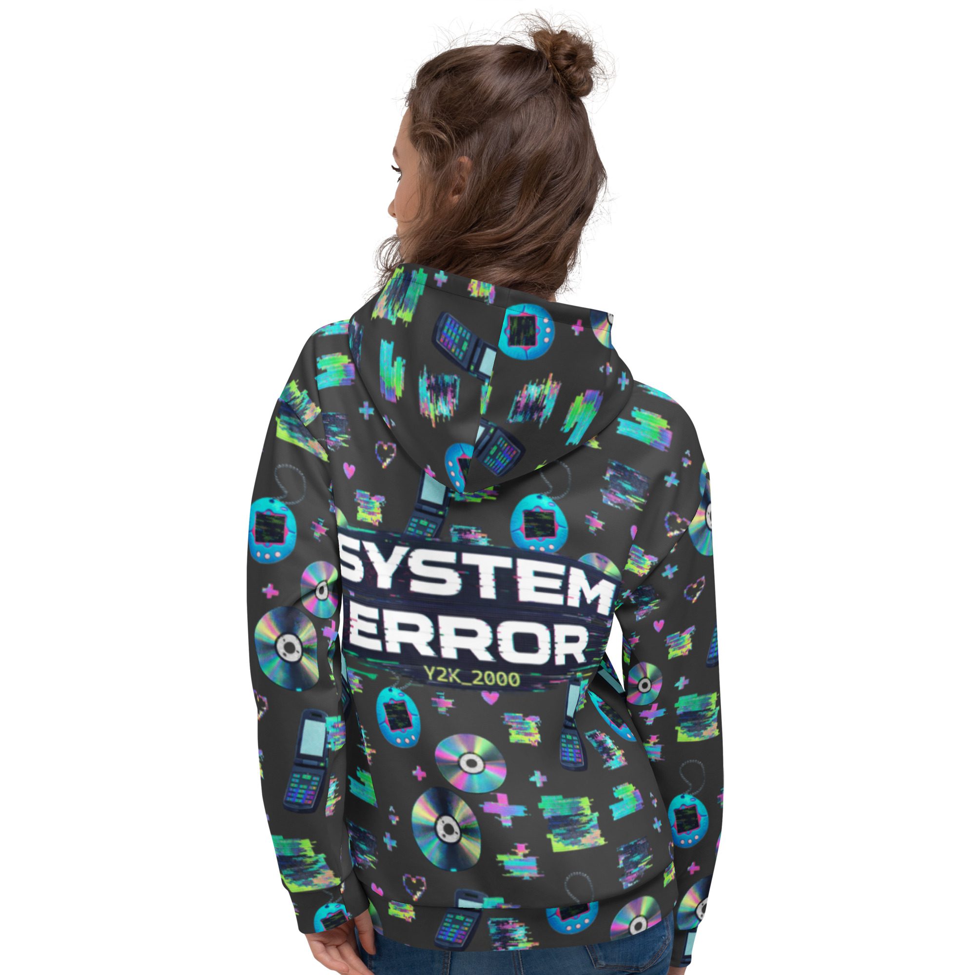 Welcome to peak Y2K. This all-over print hoodie is a full-on throwback to the early-2000s internet era—glitchy “system error” energy, pixel hearts, shiny CDs, and retro tech icons that look like they came straight out of your favorite old desktop screen. It’s loud in the best way, cozy on the inside, and made for anyone who misses the chaos (just a little).