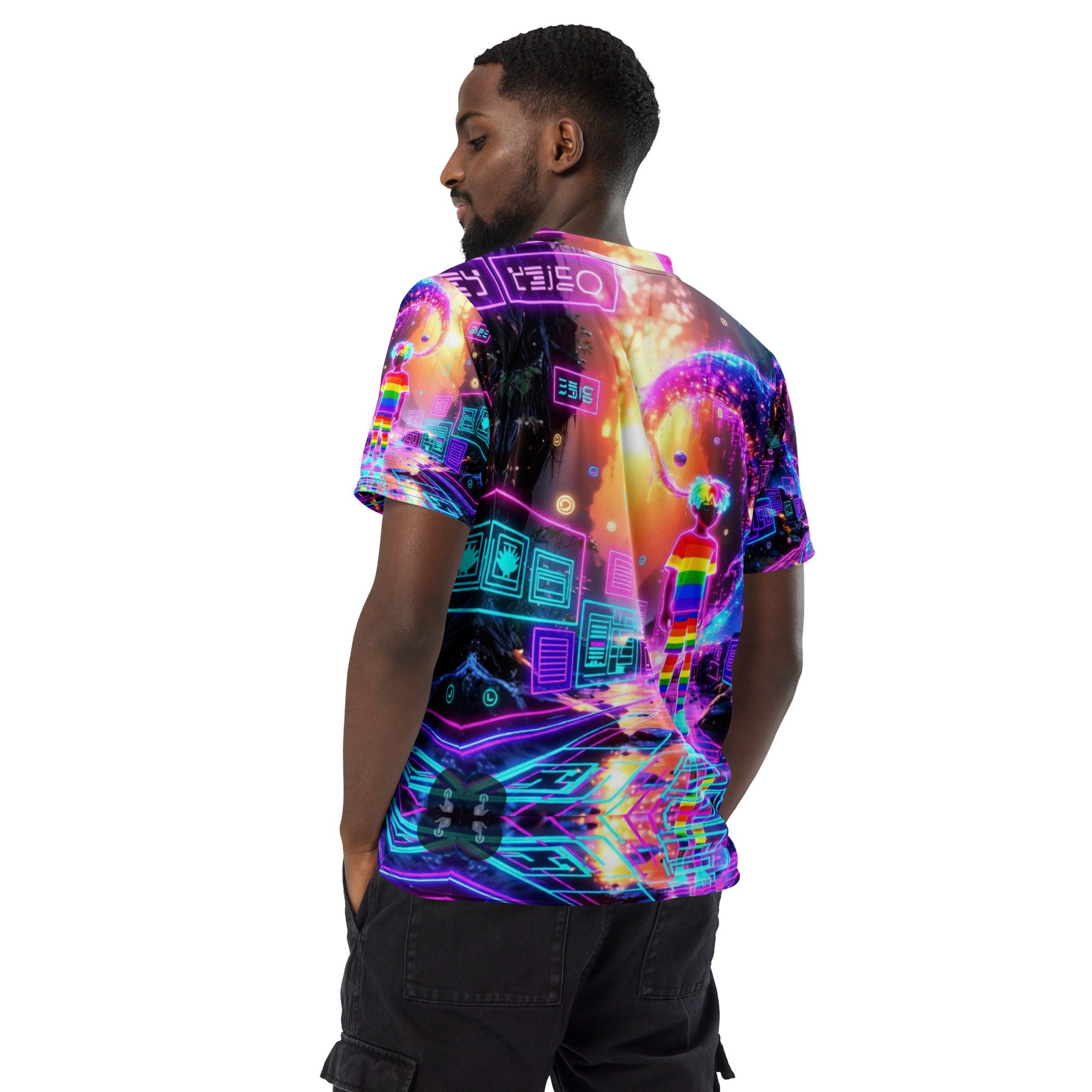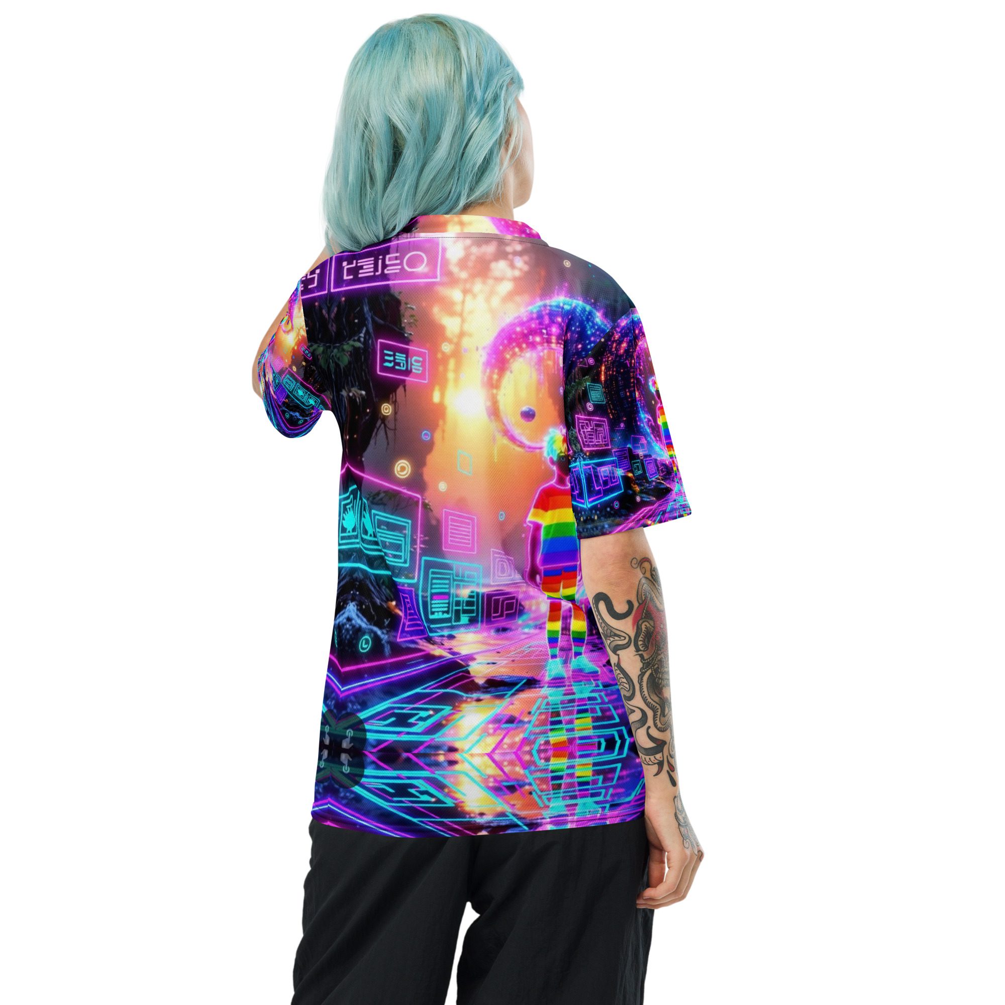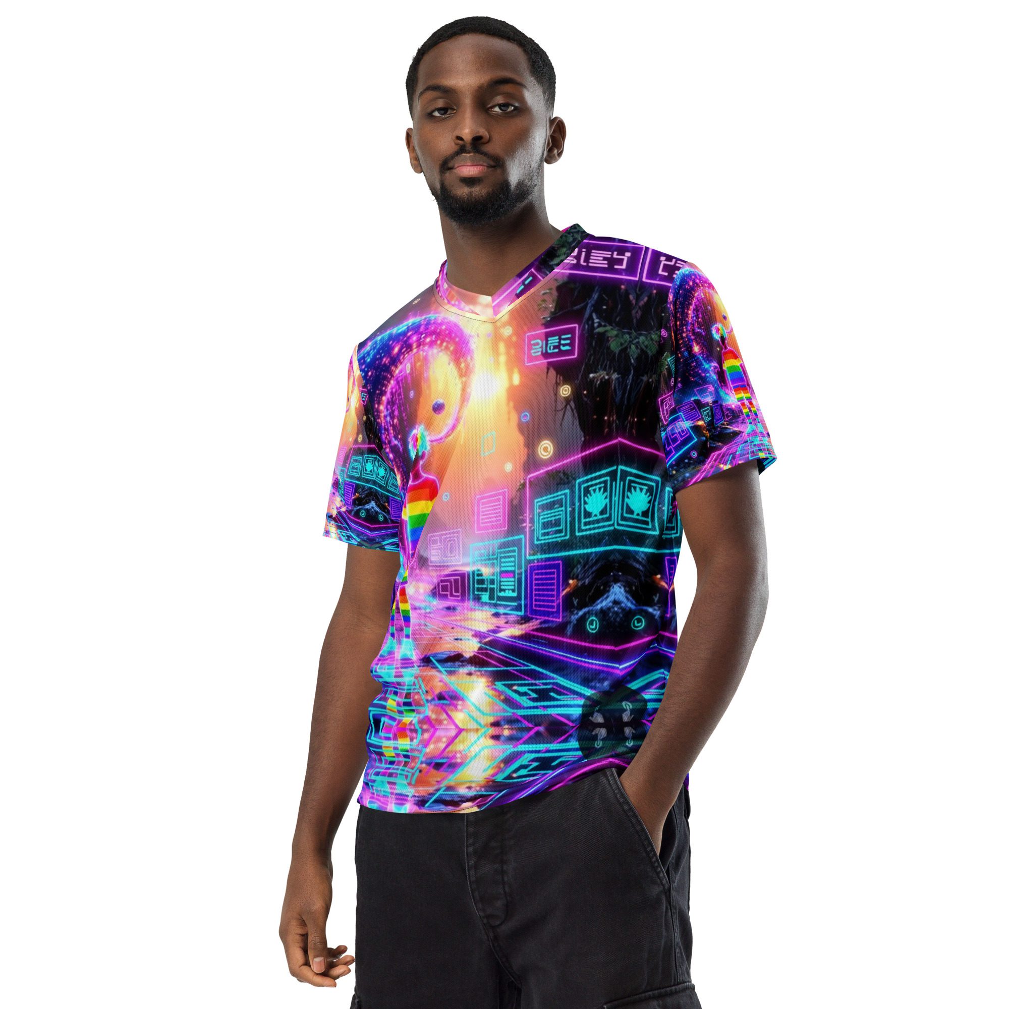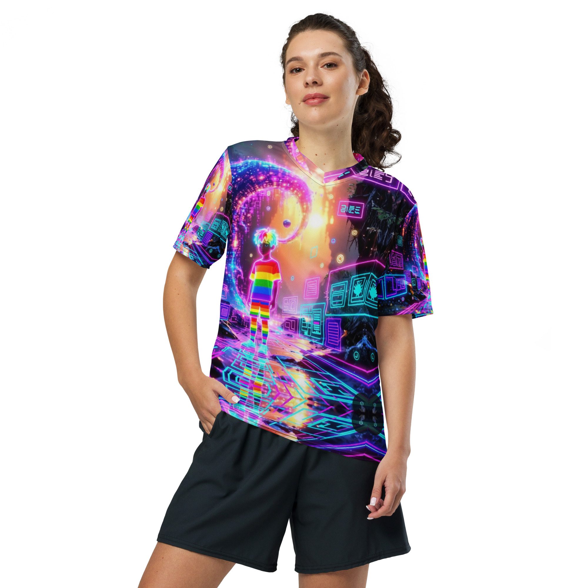 This recycled unisex sports jersey delivers lightweight comfort with powerful visual impact. Designed for breathability and movement, it works effortlessly as a standout piece or layered into a full Y2K-inspired streetwear look.