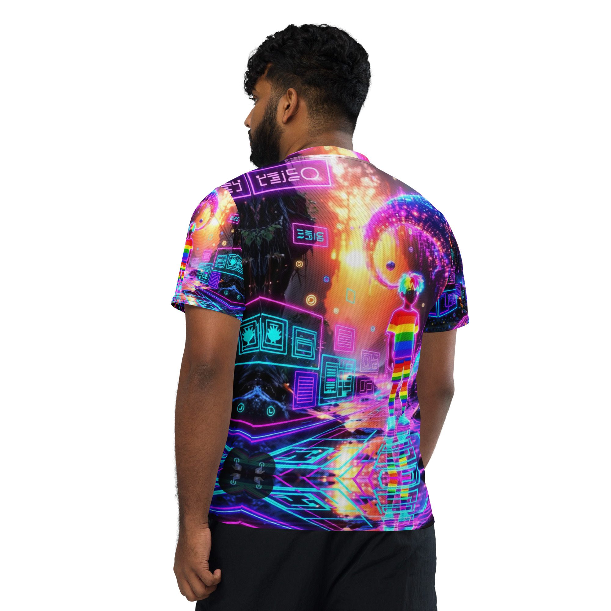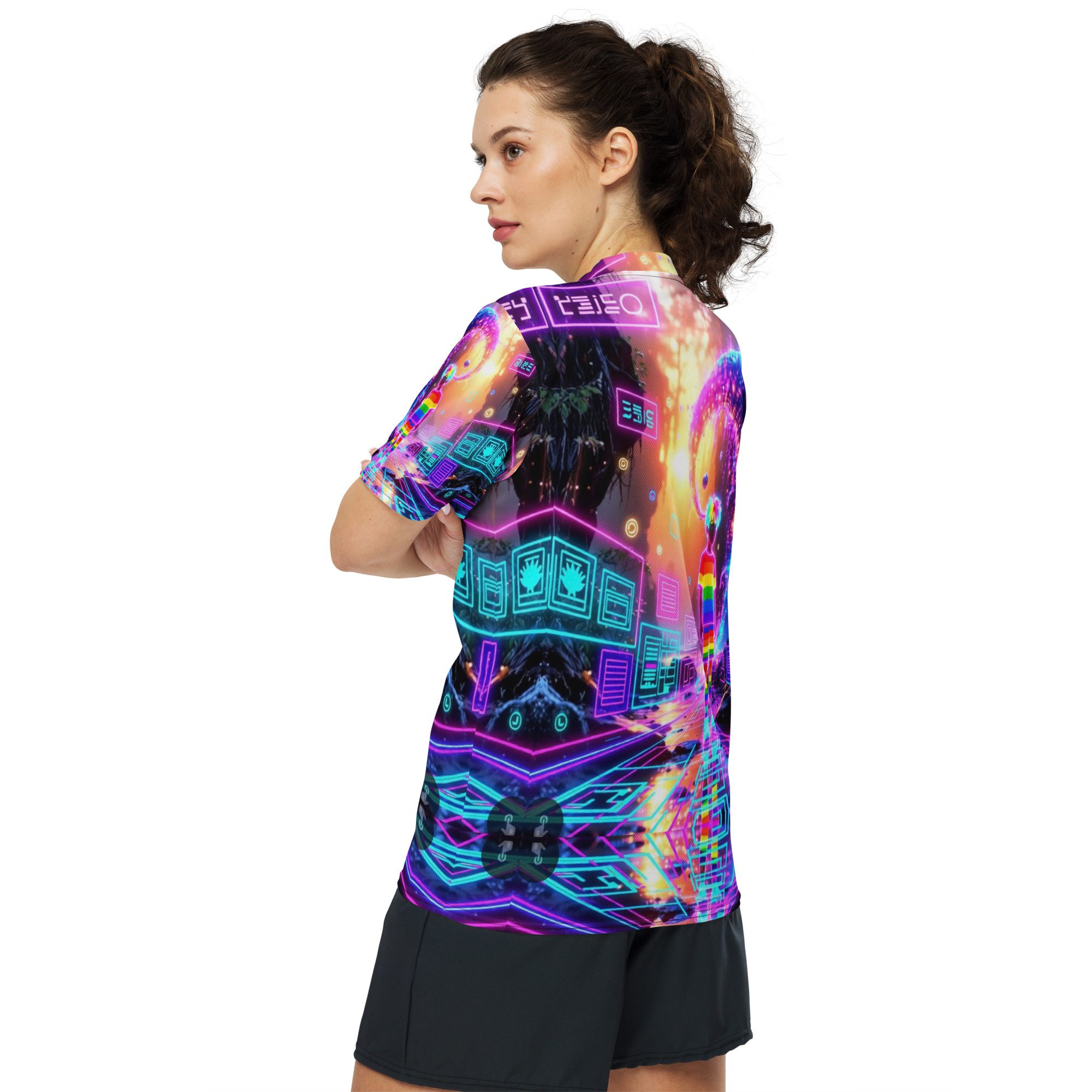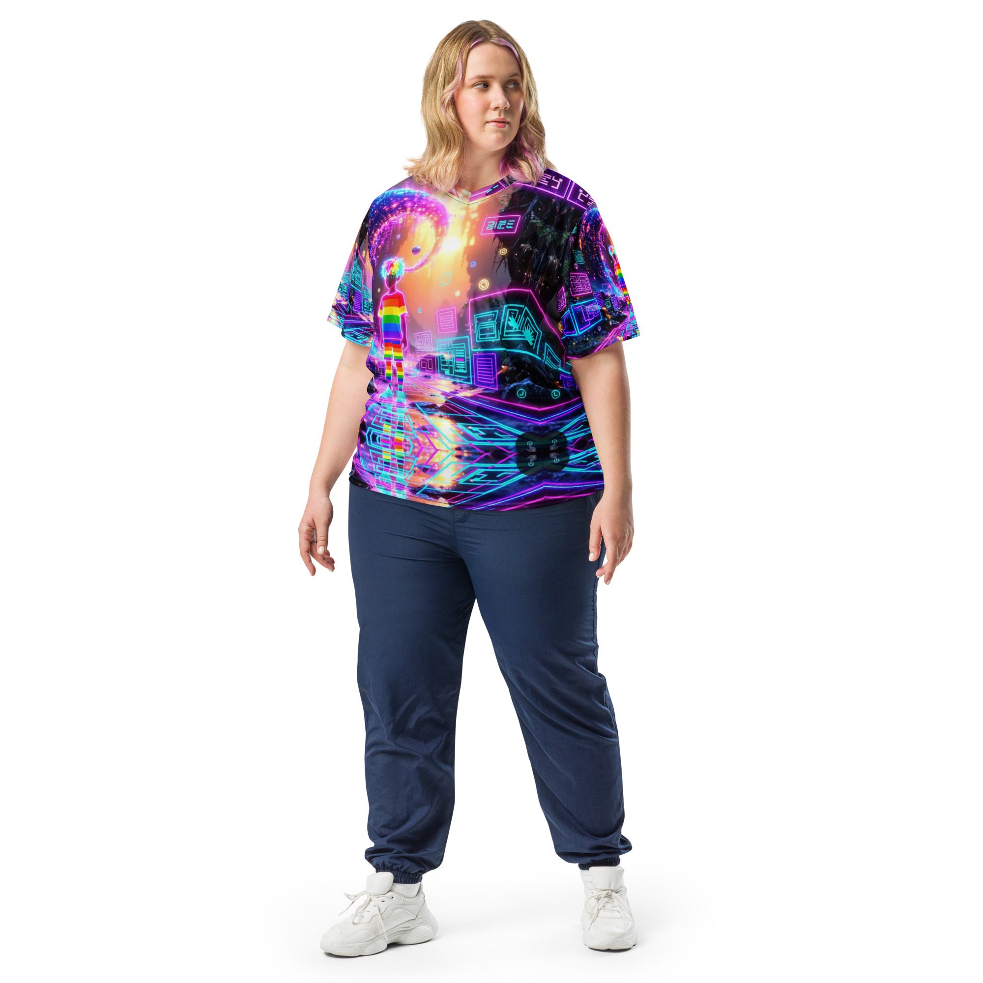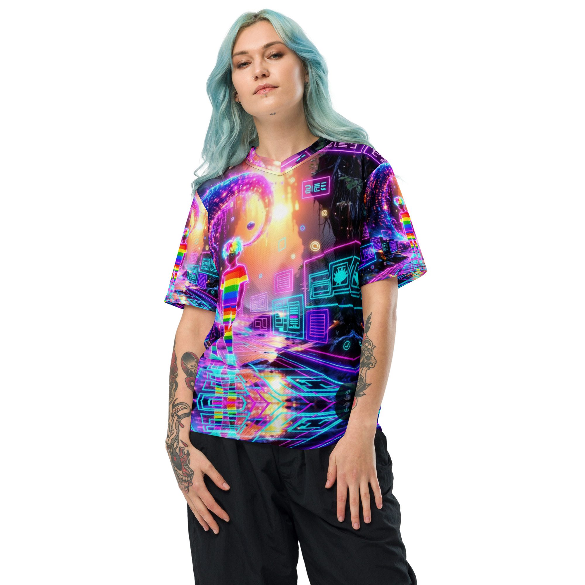 This recycled unisex sports jersey delivers lightweight comfort with powerful visual impact. Designed for breathability and movement, it works effortlessly as a standout piece or layered into a full Y2K-inspired streetwear look.