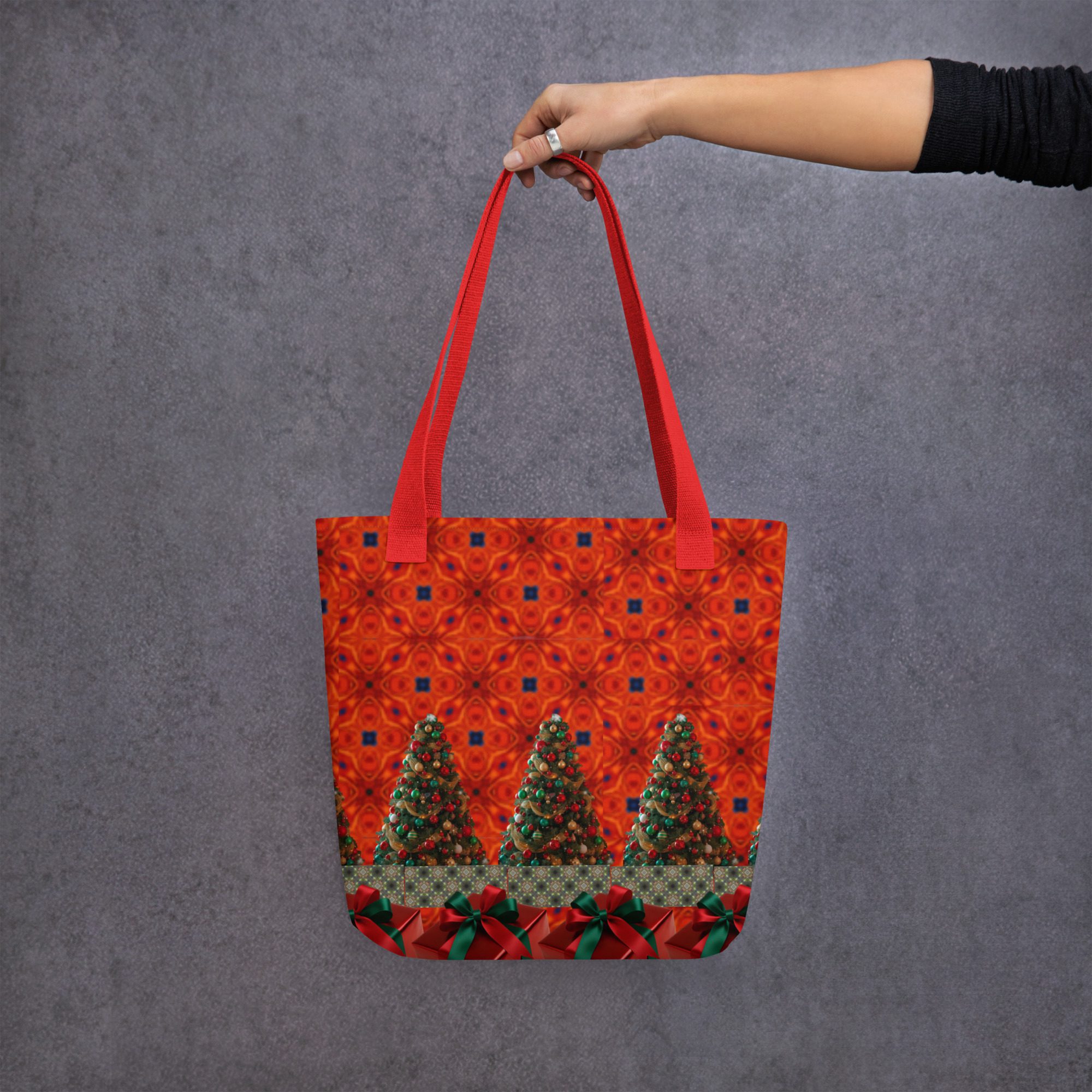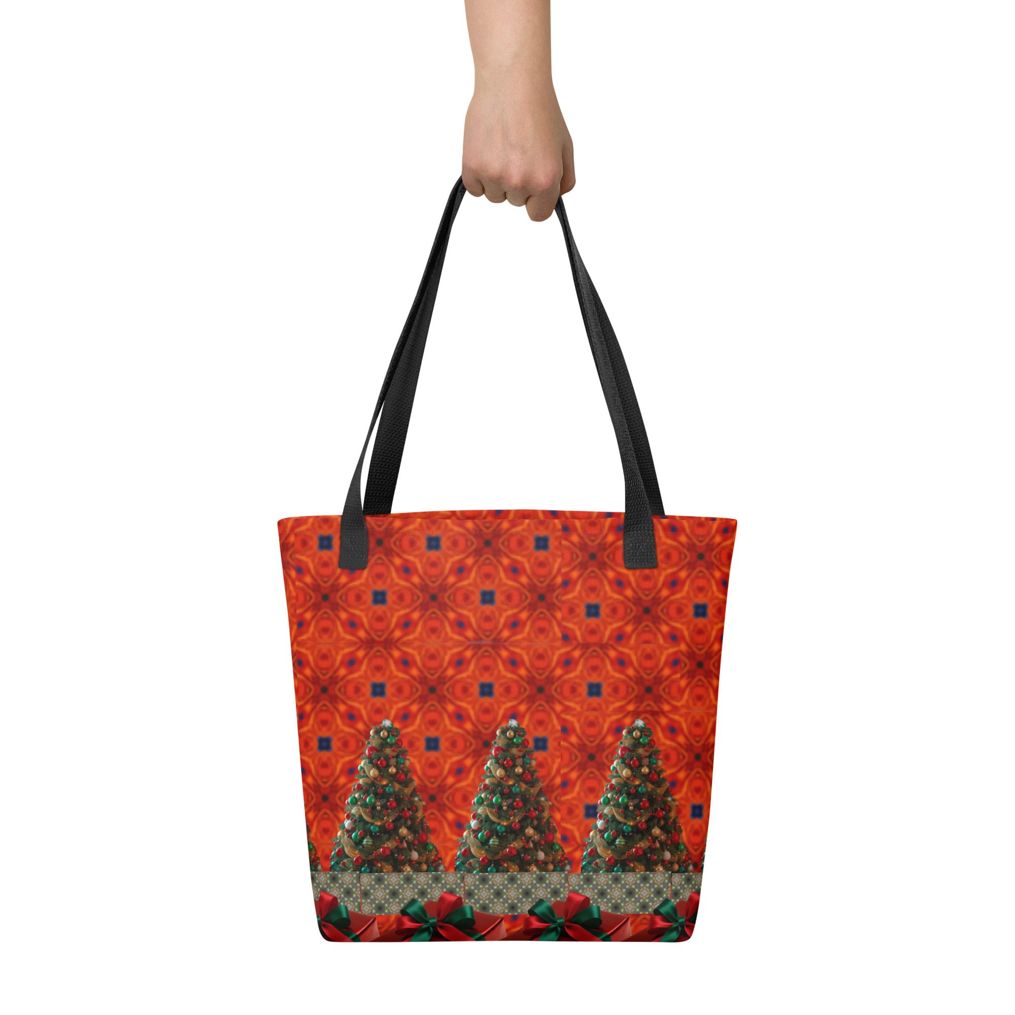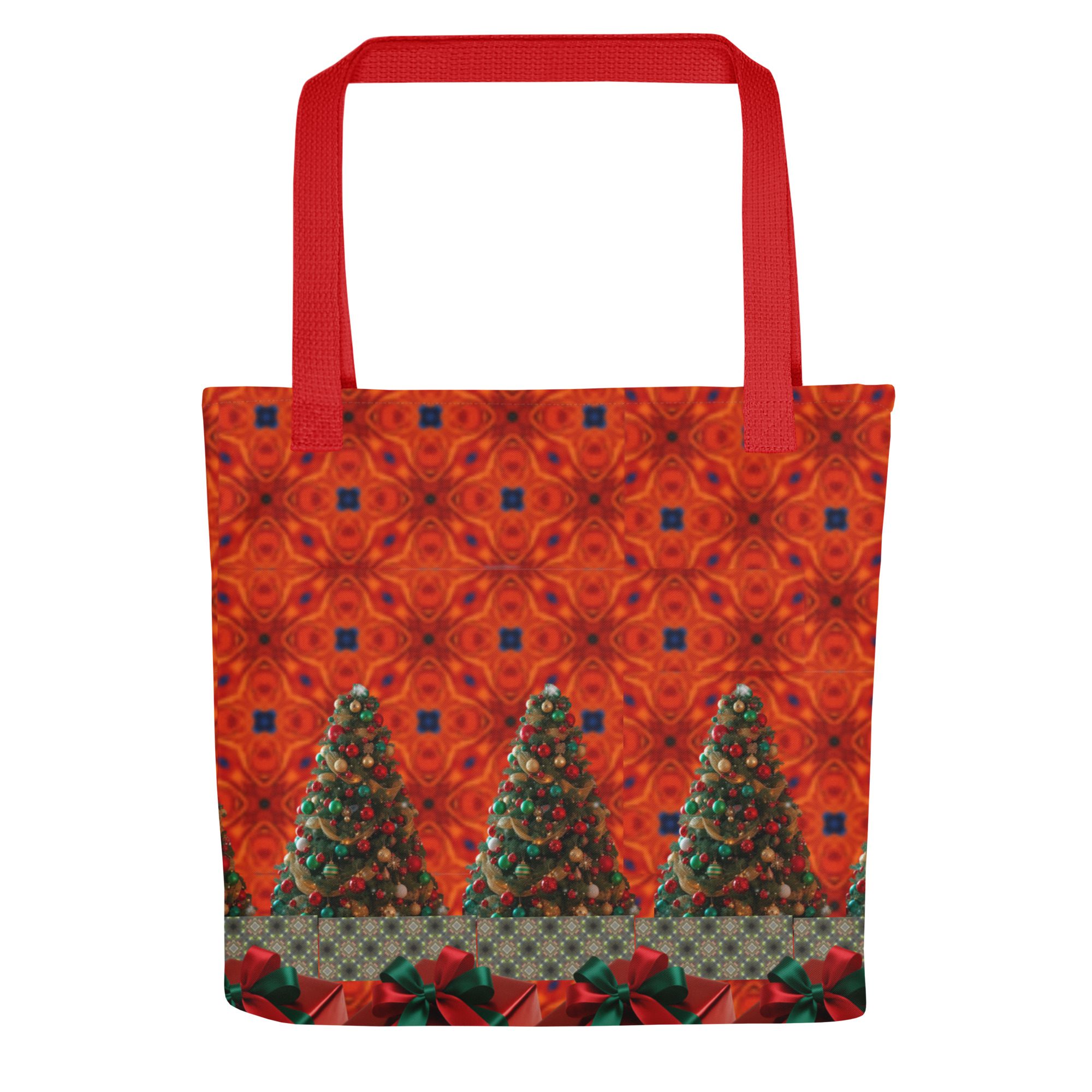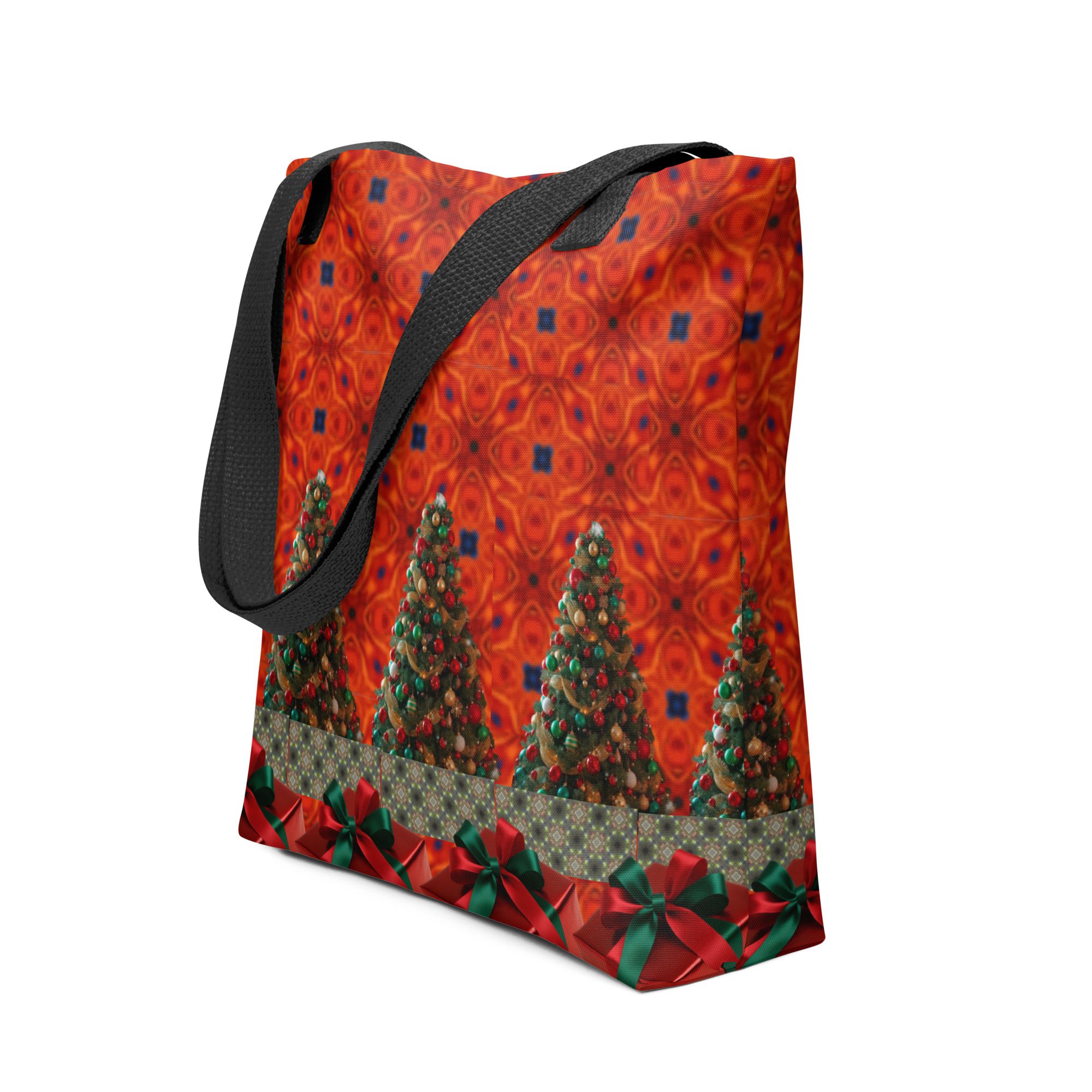 This vibrant tote features a mesmerizing blend of festive artistry — glowing Christmas trees, deep crimson tones, and rich green ribbon accents that bring to mind the warmth and sparkle of holiday gatherings. The golden strap adds a perfect contrast, making this bag as striking as it is functional.