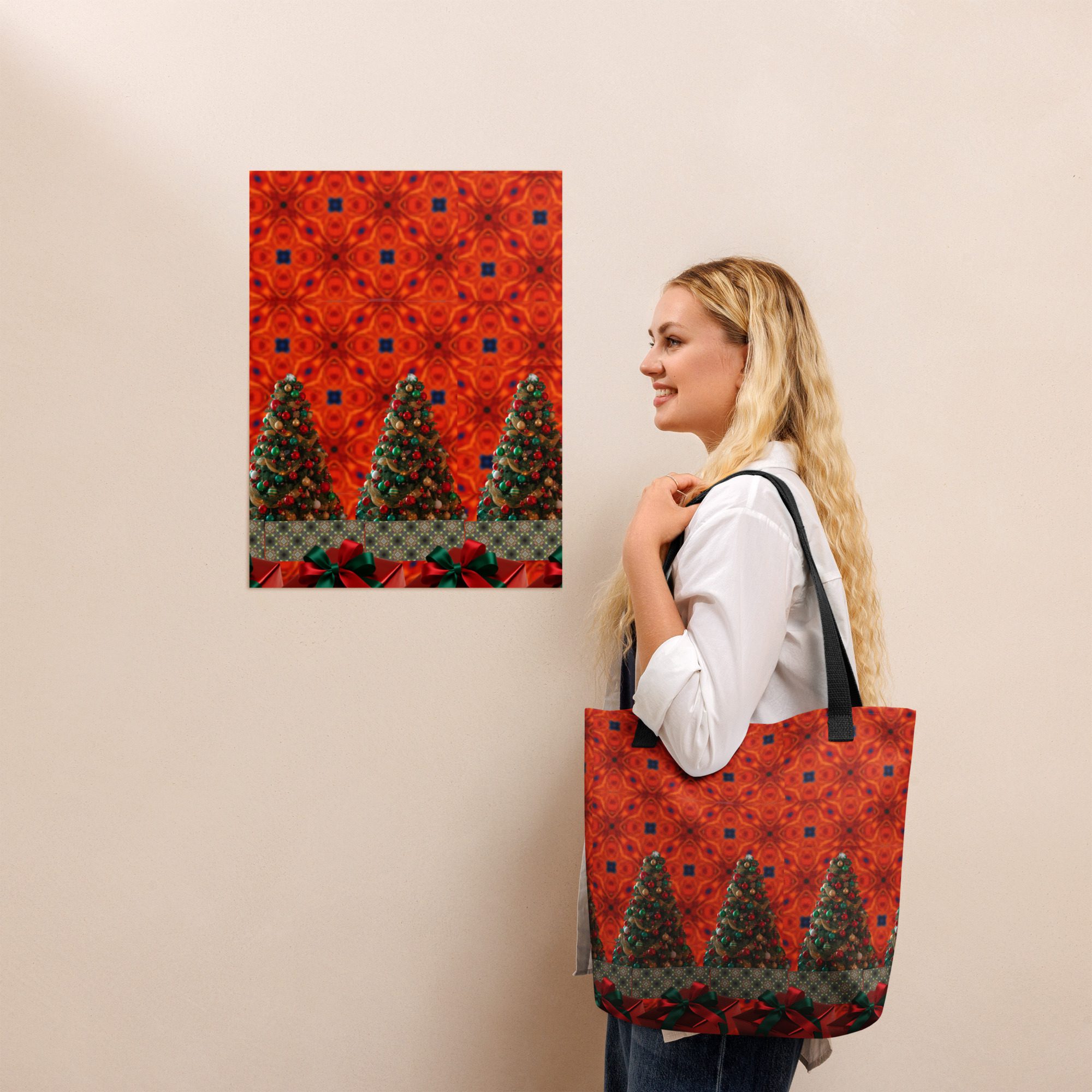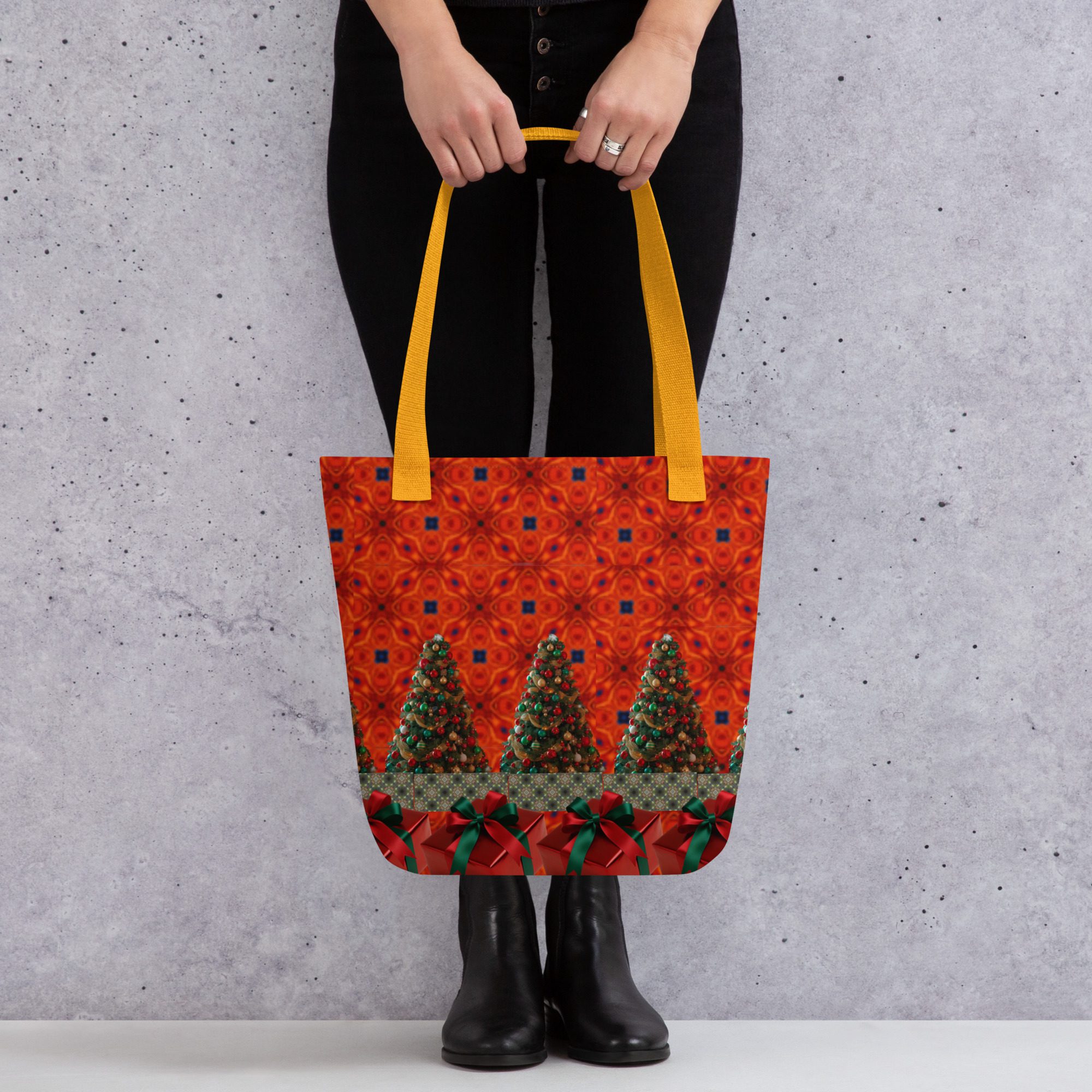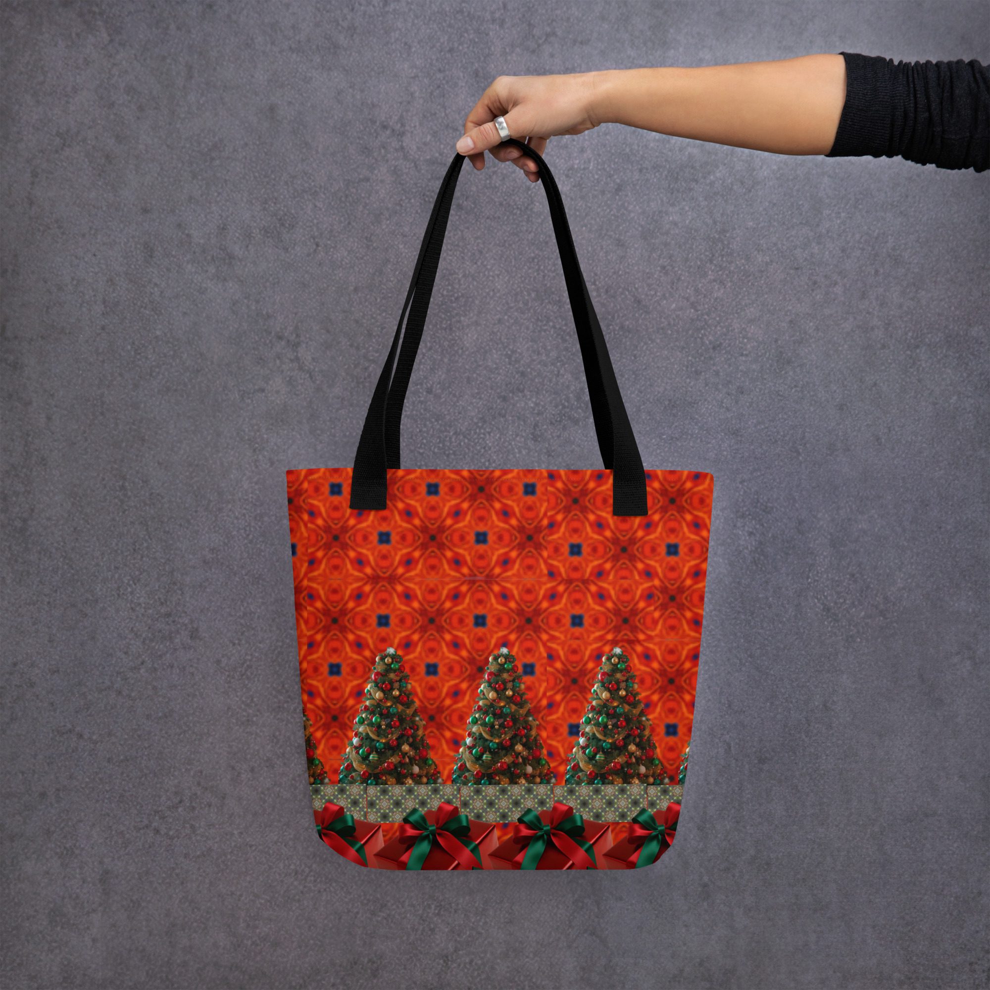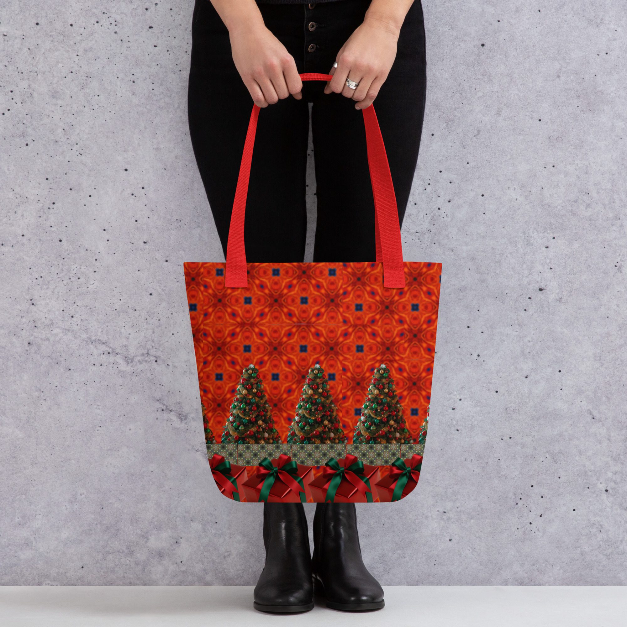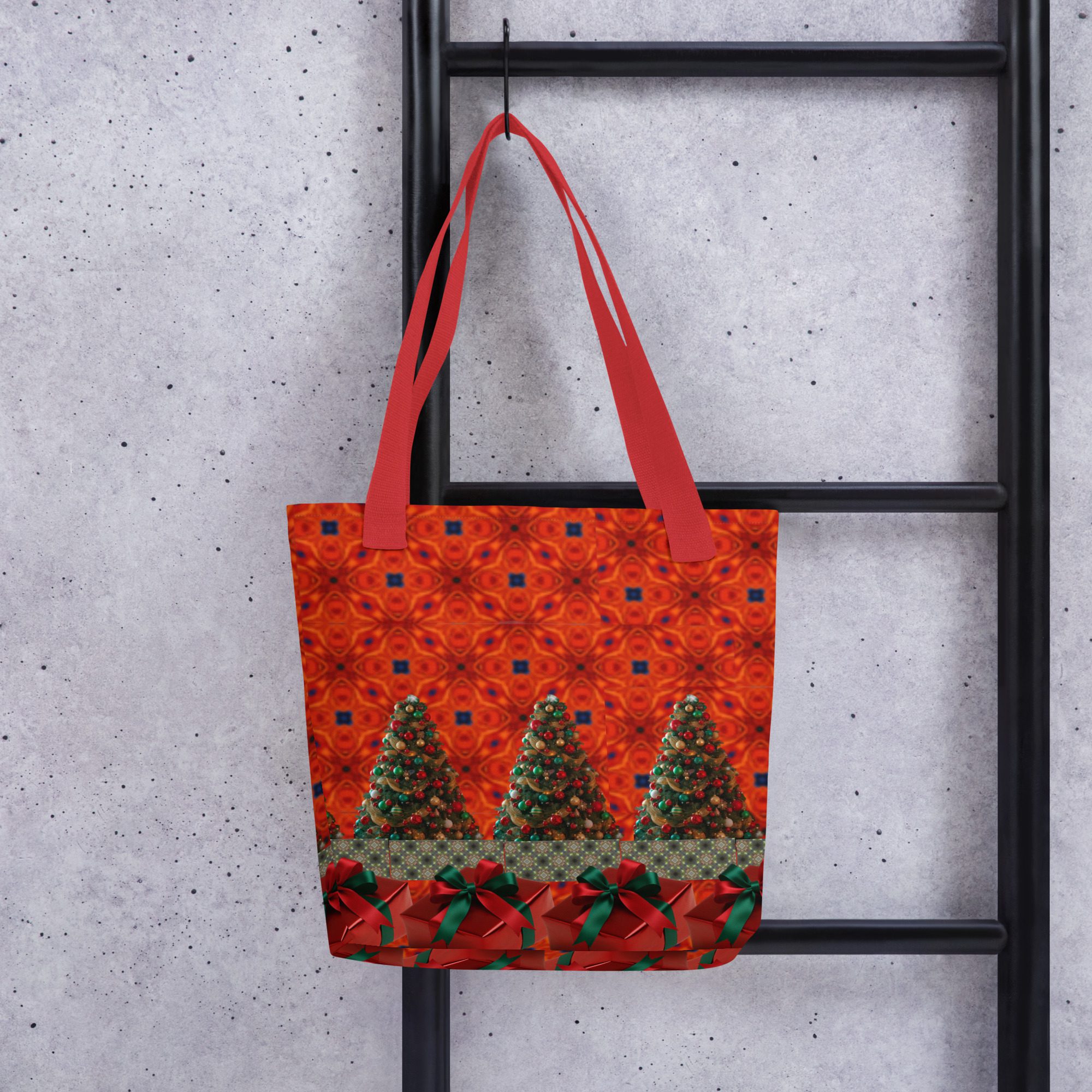 This vibrant tote features a mesmerizing blend of festive artistry — glowing Christmas trees, deep crimson tones, and rich green ribbon accents that bring to mind the warmth and sparkle of holiday gatherings. The golden strap adds a perfect contrast, making this bag as striking as it is functional.